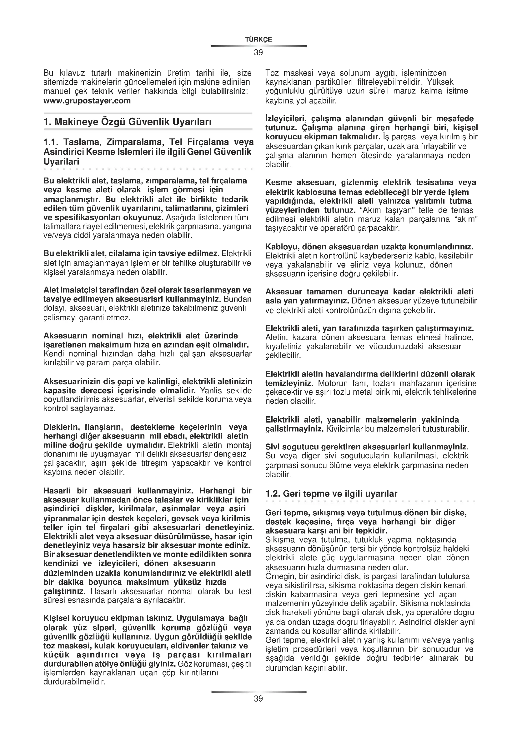 1.3. Taslama ve kesme ilemleri ile ilgili ilave güvenlik talimatlari