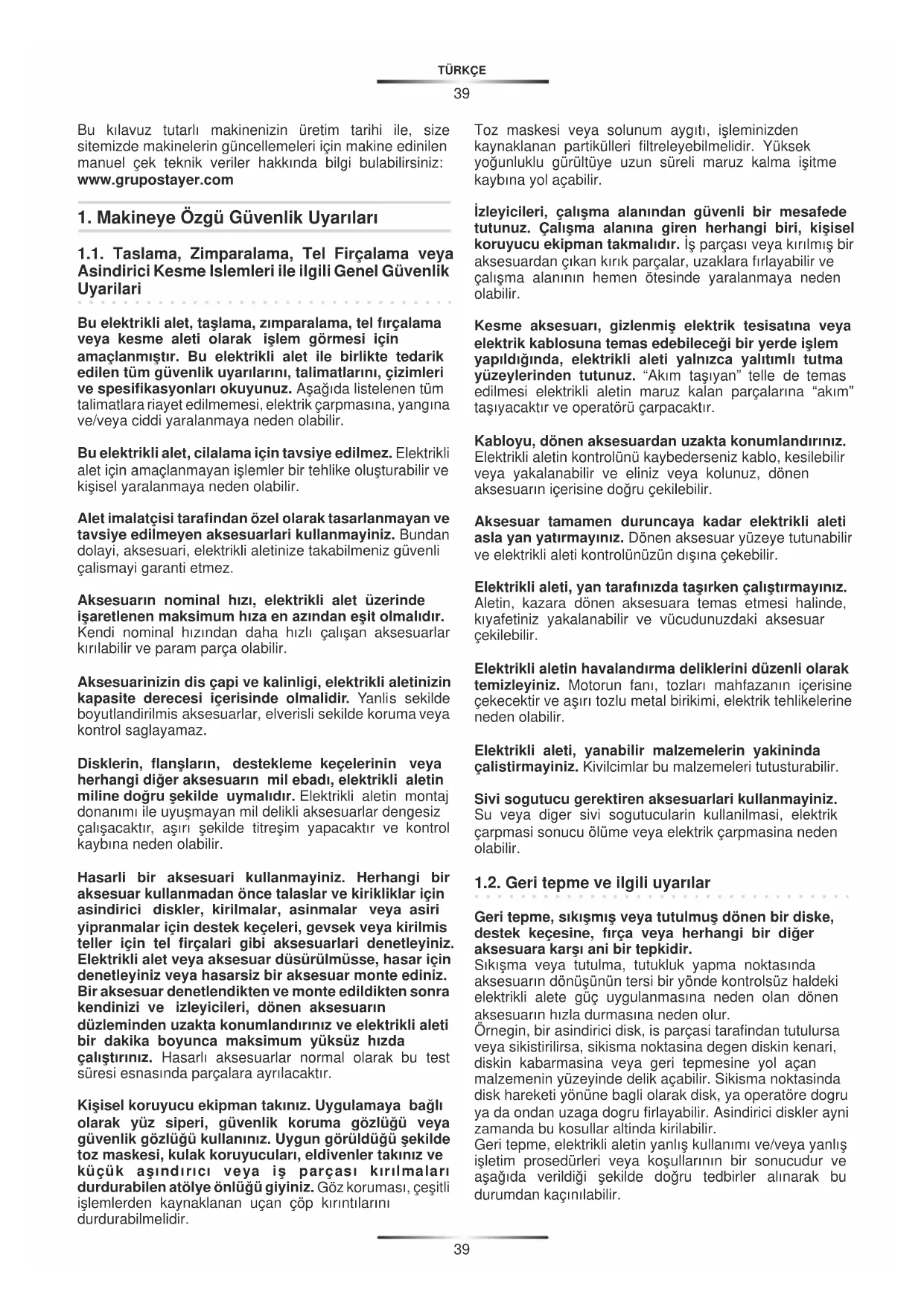 1.3. Taşlama ve kesme işlemleri ile ilgili ilave güvenlik talimatları