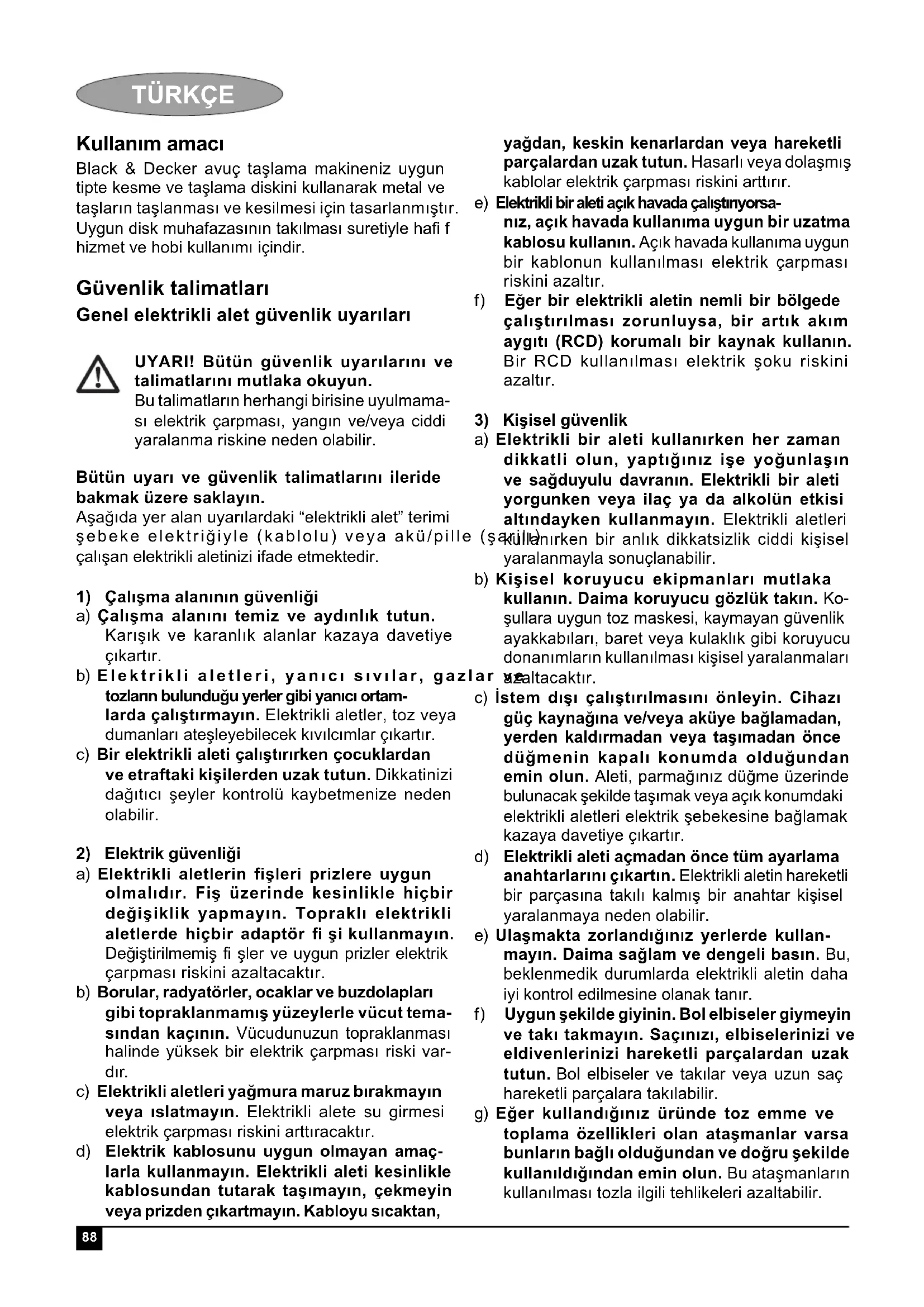 Kullanım amacı Black & Decker avuç taşlama makineniz uygun tipte kesme ve taşlama diskini kullanarak metal ve taşların taşlanması ve kesilmesi için tasarlanmıştır. Uygun disk muhafazasının takılması suretiyle hafi f hizmet ve hobi kullanımı içindir. Güvenlik talimatları Genel elektrikli alet güvenlik uyarıları UYARI! Bütün güvenlik uyarılarını ve talimatlarını mutlaka okuyun. Bu talimatların herhangi birisine uyulmama- sı elektrik çarpması, yangın ve/veya ciddi yaralanma riskine neden olabilir. Bütün uyarı ve güvenlik talimatlarını ileride bakmak üzere saklayın. Aşağıda yer alan uyarılardaki “elektrikli alet” terimi şebeke elektriğiyle (kablolu) veya akü/pille (şarjlı) çalışan elektrikli aletinizi ifade etmektedir.