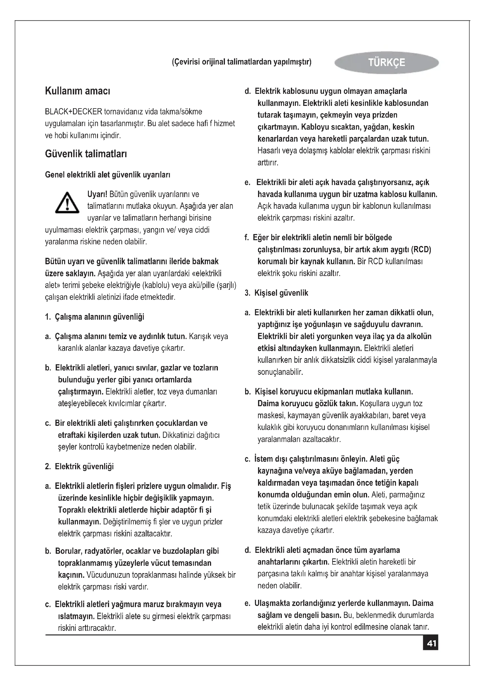 (Çevirisi orijinal talimatlardan yapılmıştır) Kullanım amacı BLACK+DECKER tornavidanız vida takma/sökme uygulamaları için tasarlanmıştır. Bu alet sadece hafi f hizmet ve hobi kullanımı içindir. Güvenlik talimatları Genel elektrikli alet güvenlik uyarıları Uyarı! Bütün güvenlik uyarılarını ve talimatlarını mutlaka okuyun. Aşağıda yer alan uyarılar ve talimatların herhangi birisine uyulmaması elektrik çarpması, yangın ve/ veya ciddi yaralanma riskine neden olabilir. Bütün uyarı ve güvenlik talimatlarını ileride bakmak üzere saklayın. Aşağıda yer alan uyarılardaki «elektrikli alet» terimi şebeke elektriğiyle (kablolu) veya akü/pille (şarjlı) çalışan elektrikli aletinizi ifade etmektedir.