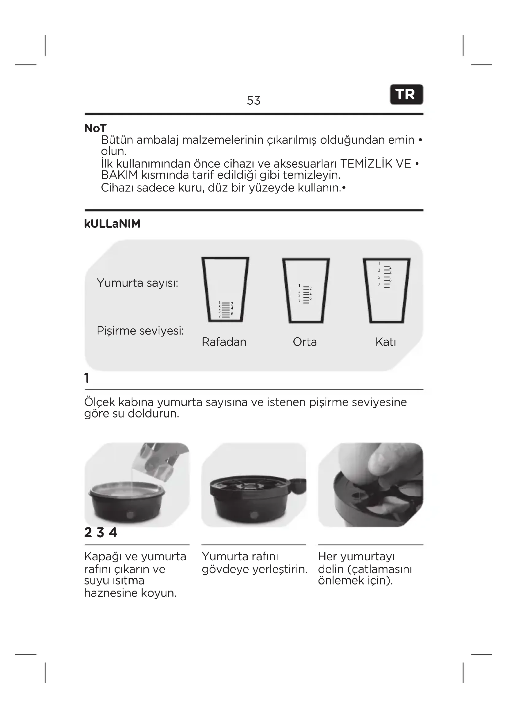 NoT kULLaNIM Bütün ambalaj malzemelerinin çıkarılmış olduğundan emin • olun. İlk kullanımından önce cihazı ve aksesuarları TEMİZLİK VE • BAKIM kısmında tarif edildiği gibi temizleyin. Cihazı sadece kuru, düz bir yüzeyde kullanın.• Ölçek kabına yumurta sayısına ve istenen pişirme seviyesine göre su doldurun. Yumurta sayısı: Pişirme seviyesi:
