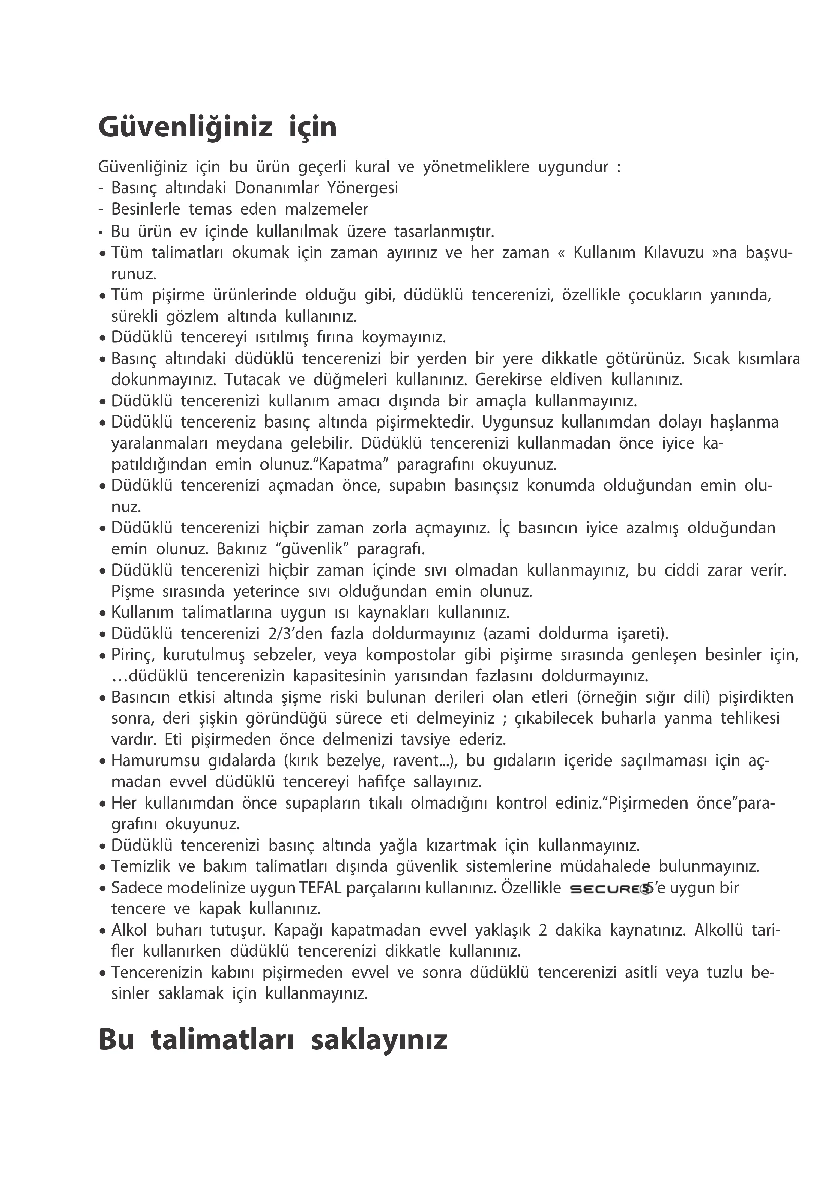Sadece modelinize uygun TEFAL parçalarını kullanınız. Özellikle SECURE 5’e uygun bir tencere ve kapak kullanınız.