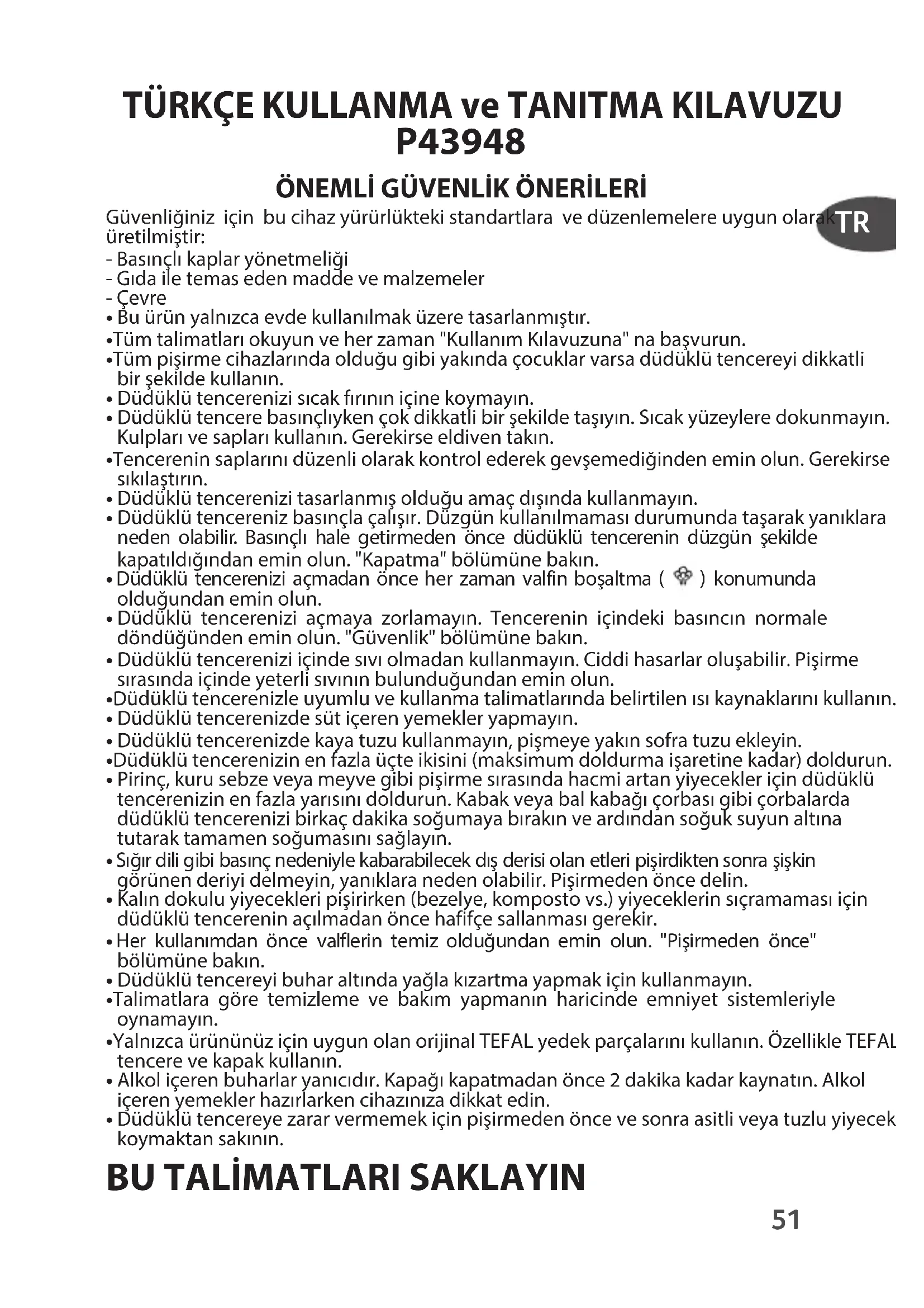 - Bü ticari garantiden bağımsız olarak, her dürümda- Fransa Tüketici Kanünü, Madde L 211-4, L 211-5 ve L 211-12 tarafından öngörülen sözleşmeyle üyümlü yasal garantinin de ayrıca geçerli oldüğünü ve Fransa Medeni Kanünü, Madde 1641 ila 1649 arasındaki tüm madde- lerin de gizli küsürlara karşı garanti altına aldığını ünüt- mayın.61 Sorularınıza TEFAL'in yanıtları Sorular Öneriler Kapağı kapa- tamıyorsanız: Kapakta bulunan açma düğmesine (D) basın ve tencerenin üzerine kapağı yerleştirin - Şek. 3. Düğmeyi (D) bırakmadan önce kapağın üstüne bir miktar güç uygulayın ve kilitleme mekanizmasını harekete geçirin. Kapaktaki açma/kapatma düğmesini bırakın (D) ve ağzın, tencerenin kenarına düzgün şekilde kilitlendiğinden emin olun (K) - Şek. 4 Düdüklü tencerenizi içinde sıvı olmadan basınçlı durumda ısıttıysanız: Düdüklü tencerenizi TEFAL Yetkili Servisine kontrol ettirin. Basınç göstergesi yükselmiyorsa ve pişirme sırasında valften buhar çıkmıyorsa: Pişirmenin ilk birkaç dakikası süresince bu durum normaldir. Bu sorun devam ederse, şunları kontrol edin: - Isı kaynağının yeteri kadar yüksek olduğunu; sorun buysa, ısıyı arttırın. - Tencerenin içindeki sıvı miktarının yeterli olduğunu, - Çalışma valfinin üzerinde olduğunu, - Düdüklü tencerenin düzgün şekilde kapatıldığını, - Sızdırmazlık contası veya tencere kenarlarının zarar görmemiş olduğunu, - Sızdırmazlık contasının kapağa doğru şekilde yerleşti- rildiğini. ("Temizleme ve Bakım"). TR62 Sorular Öneriler Basınç göstergesi yükseliyor, ancak pişirme sırasında valften buhar çıkmıyorsa: Pişirmenin ilk birkaç dakikası süresince bu durum nor- maldir. Bu sorun devam ederse, basınç göstergesi düşünceye kadar düdüklü tencerenizi soğuk suyla dolu lavabonun içine koyun - Şek. 13. Çalışma valfini (A) - Şek. 15 ve buhar çıkışını (C) - Şek. 16 temizleyin ve güvenlik valfi piminin kolayca hareket ettiğini kontrol edin - Şek. 17. Kapak etrafından buhar sızıyorsa, şunları kontrol edin: Kapağın doğru şekilde kapanmış olduğunu, Kapak ve sızdırmazlık contasının konumunun düzgün olduğunu, Sızdırmazlık contasının durumunu; gerekirse değiştirin. Kapağın, sızdırmazlık contasının ve kapağın iç tarafında kalan kısmının temiz olduğunu, Tencerenin kenarlarının durumunu. Kapak açılmıyorsa: Basınç göstergesinin düşük olduğunu kontrol edin. Aksi taktirde, basınç göstergesi düşünceye kadar düdü- klü tencerenizi soğuk suyla dolu lavabonun içine koyun - Şek. 13. Basınç göstergesiyle kesinlikle oynamayın. Yiyecek pişmediyse veya yandıysa, şunları kontrol edin: Pişirme süresini, Isı kaynağının gücünü, Çalışma valfinin doğru konumda olduğunu, İçindeki sıvı miktarını. Yemek düdüklü tencerenin içinde yandıysa: Tencereyi temizlemeden önce bir süre ıslatın ve sirke ile temizliğini yapın. Çamaşır suyu veya klor içeren ürünleri kesinlikle kullan- mayın. Fazla basınç güvenlik sistemlerinden birisi harekete geçerse: Isı kaynağını kapatın. Düdüklü tencereyi hareket ettirmeden soğumaya bırakın. Basınç göstergesinin düşmesini bekleyin ve ardından düdüklü tencereyi açın. ("Açma" bölümüne bakın). Çalışma valfini, buhar çıkışını, güvenlik valfini ve sızdırmazlık contasını kontrol edin ve temizleyin. Sorun devam ederse, düdüklü tencerenizi TEFAL Yet- kili Servisine kontrol ettirin. TR63