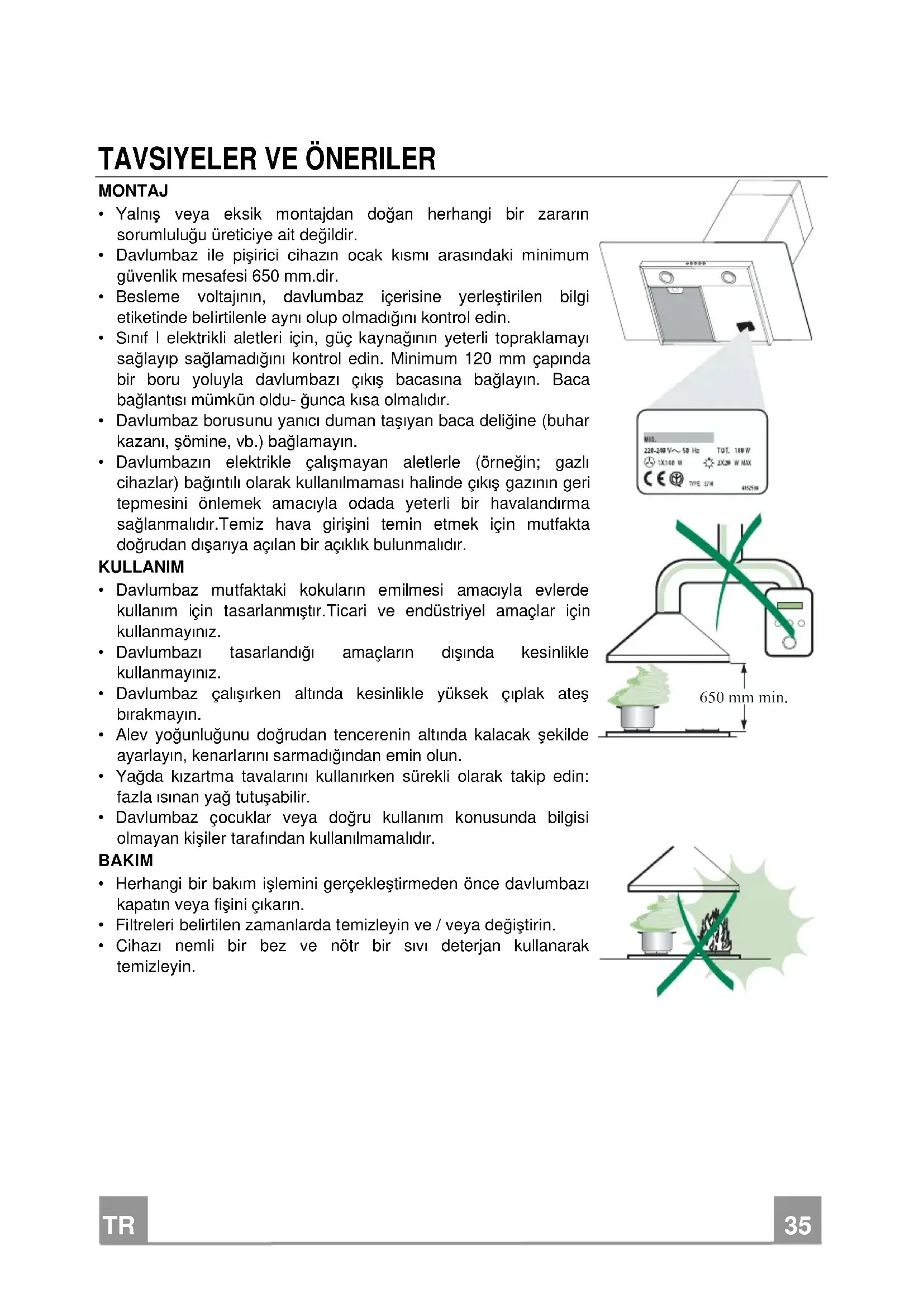 - Davlumbaz ile pişirici cihazιn ocak kιsmι arasιndaki minimum güvenlik mesafesi 650 mm.dir.