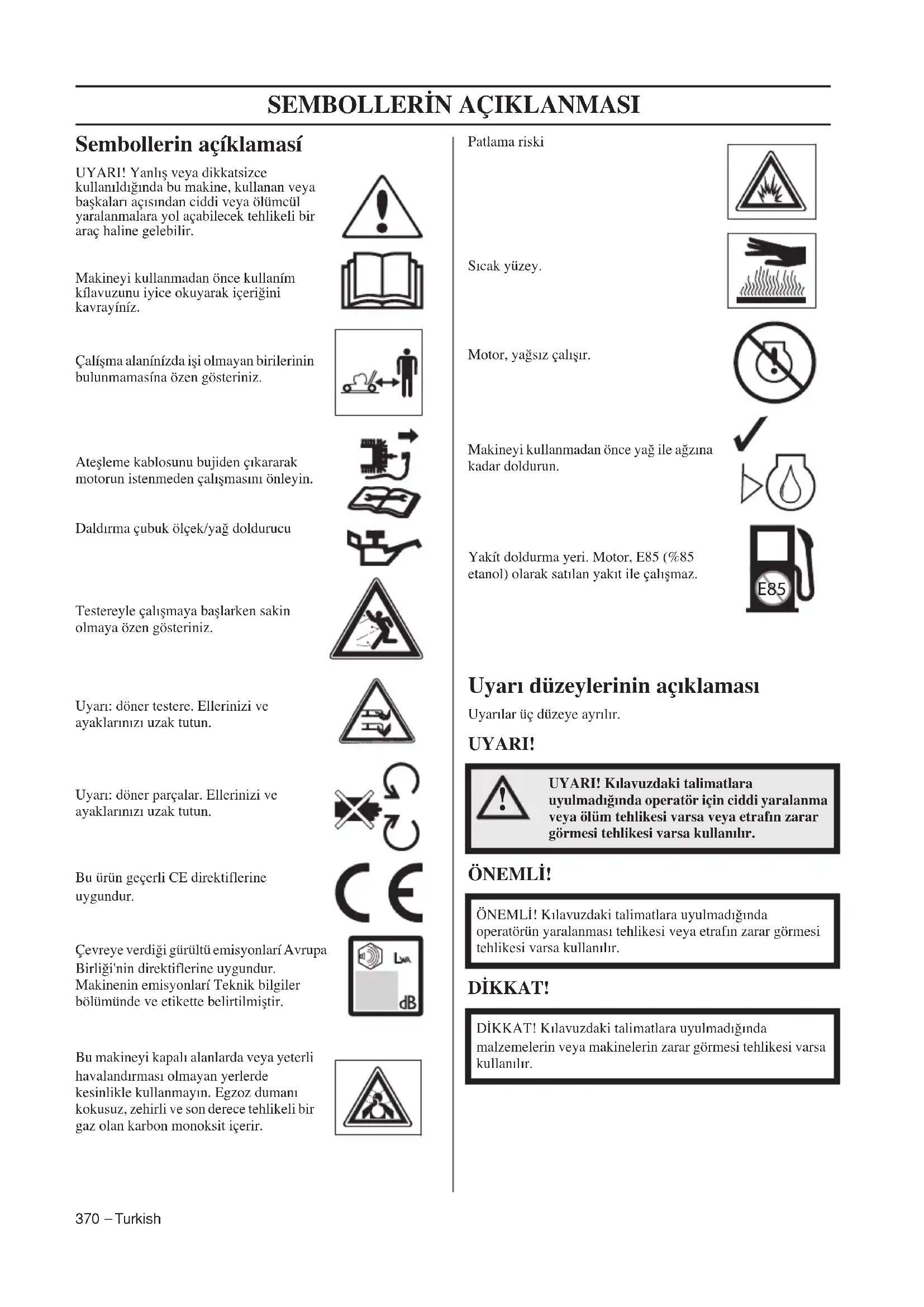 kish Sembollerin açíklamasí UYARI! Yanlıfl veya dikkatsizce kullanıldı¤ında bu makine, kullanan veya baflkaları açısından ciddi veya ölümcül yaralanmalara yol açabilecek tehlikeli bir araç haline gelebilir.