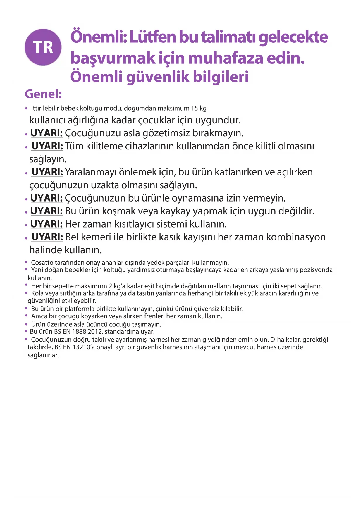 Bakım - Sabit ve takılı, tam çalışır durumda olmalarını sağlamak için düzenli olarak kilitleme cihazlarını, frenleri, tekerlekleri, harnes montajını, mandalları, koltuk ayarlayıcıları, mafsalları ve bağlantıları muayene edin. Her zaman hareket etmek için serbest olmalıdırlar. Her zaman serbest biçimde hareket etmeli ve minimum bakım gerektirmelidirler. Ancak ör. silikon (yağ veya gres kullanmayın) gibi bir sprey yağlayıcı ile ince katman halinde düzenli yağlama bebek arabanızın ömrünü uzatacak ve açılıp kapanmasını daha da kolaylaştıracaktır. Seyahat sisteminize, önce gerçekleşenin geçerli olması kaydıyla, ikinci bir bebek için kullanmadan önce veya 18 ay sonra servis yapılmalı ve eski durumuna getirilmelidir. XX uyarısına başvurun Doğru işlem Yanlış işlem Sesli ikaz İşlemi x kez tekrarlayın Genel işlem oku Kilitle Kilidi aç Bas ve tut Kontrol et XX adımına ilerle Diğer tarafta tekrarla Görsel dil Anahtarı: Parça Listesi: S1: Köpük Tutamak Kaplaması S2: Tutamak Düğmesi S3: Katlanır üst örtü S4: Araç Koltuğu Örtüsü S5: Arkalık (ayarlı) Aşağıda gösterilen yedek parçalar, ürününüz için mevcuttur. İngiltere ve İrlanda müşterileri için, web sitemiz yoluyla sipariş edin: http://www.cosatto.com/service-centre/spares İngiltere ve İrlanda dışındaki müşteriler için, yerel distribütörünüze ilişkin iletişim bilgilerini http://www.cosatto.com/stockists adresinde görebilirsiniz İlave yardıma ihtiyaç duyarsanız, lütfen cuddle@cosatto.com e-posta adresi yoluyla bizimle iletişime geçin. Yedek Parçalar: Lütfen diyagramlara başvurun: P1: Bebek arabası P2: Katlanır üst örtü P3: Yağmur örtüsü S6: Harnes S7: Yağmur örtüsü S8: Ayak dayama yeri S9: Ön tekerlek S10: Tekerlek kapağı S11: Sepet S12: Arka tekerlek S13: Otomatik KilitLütfen aşağıdaki şekillere başvurun: Bebek arabası Fren Ön tekerlek döner kilidi Tutamak Harnes Arkalık Bacak desteği Sepet Katlanır üst örtü Yağmur örtüsü Koltuk örtüsü Bebek arabası