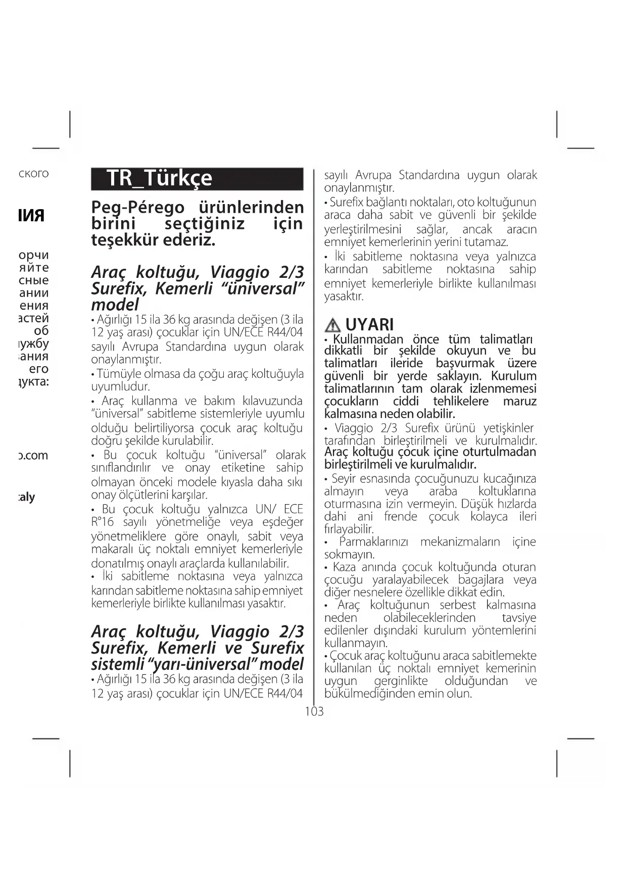 - Ağırlığı 15 ila 36 kg arasında değişen (3 ila 12 yaş arası) çocuklar için UN/ECE R44/04103 издании, по причинам технического или коммерческого характера. СЛУЖБА ОБСЛУЖИВАНИЯ PEG-PEREGO В случае утери или порчи аксессуаров, применяйте только фирменные запасные части производства компании Peg Pérego. Для выполнения ремонта, замены запасных частей и получения информации об устройстве обращайтесь в службу послепродажного обслуживания Peg Pérego, сообщив, при его наличии, серийный номер продукта: Срок службы: 3 года Гарантийный срок: 12 месяцев тел.: 0039/039/60.88.213 e-mail assistenza@pegperego.it сайт в интернете: www.pegperego.com Изготовитель: PEG PEREGO S.P.A. (Пег Перего С.П.А.); Адрес: Via de Gasperi 50 - 20862 ARCORE (MB), Italy (Виа де Гаспери 50, 20862 Аркоре (МБ), Италия). Страна производства: Италия TR_Türkçe Peg-Pérego ürünlerinden birini seçtiğiniz için teşekkür ederiz. Araç koltuğu, Viaggio 2/3 Surefix, Kemerli “üniversal” model