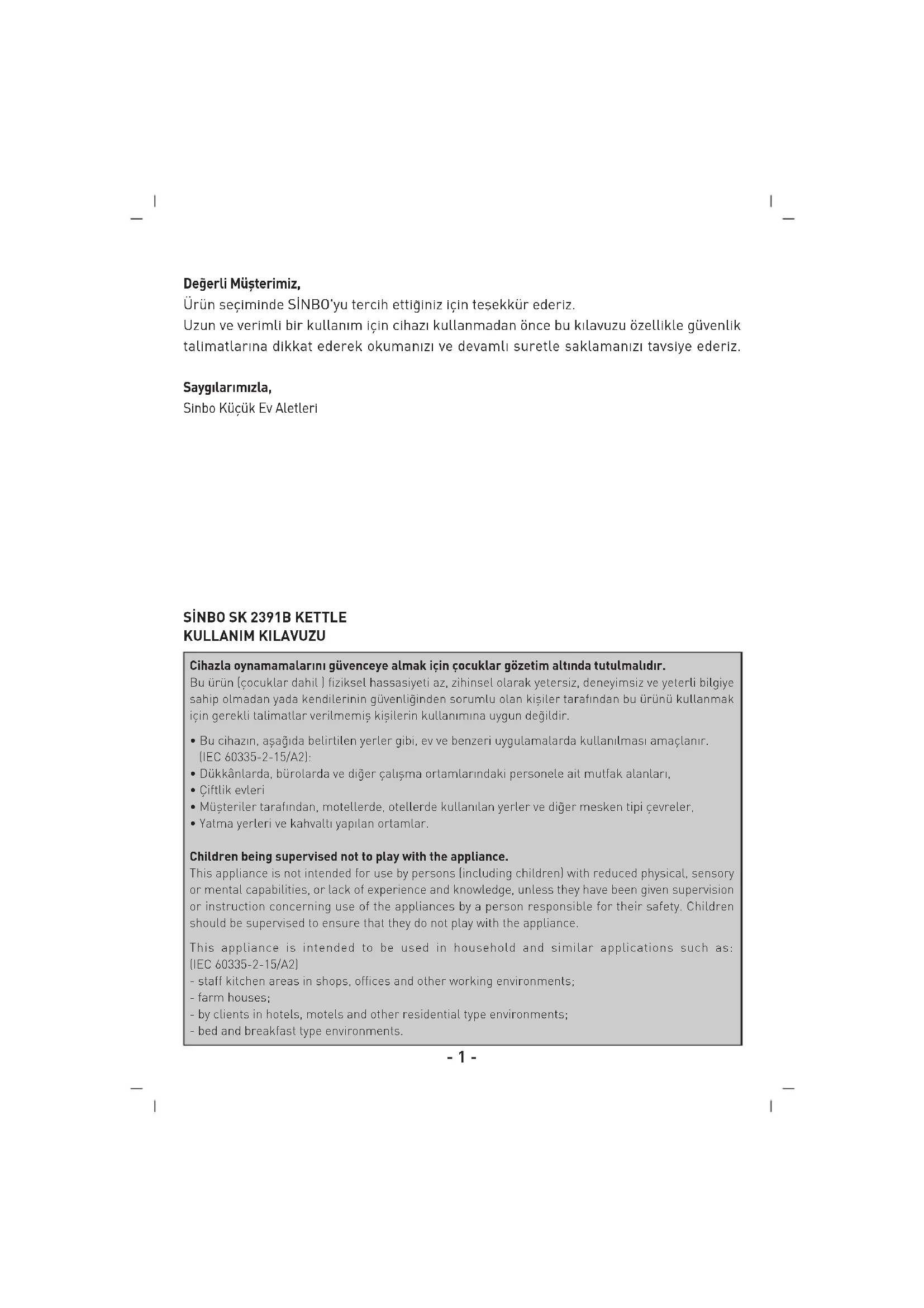 HR- 1 - De¤erli Müflterimiz, Ürün seçiminde S‹NBO'yu tercih etti¤iniz için teflekkür ederiz. Uzun ve verimli bir kullan›m için cihaz› kullanmadan önce bu k›lavuzu özellikle güvenlik talimatlar›na dikkat ederek okuman›z› ve devaml› suretle saklaman›z› tavsiye ederiz. Sayg›lar›m›zla, Sinbo Küçük Ev Aletleri