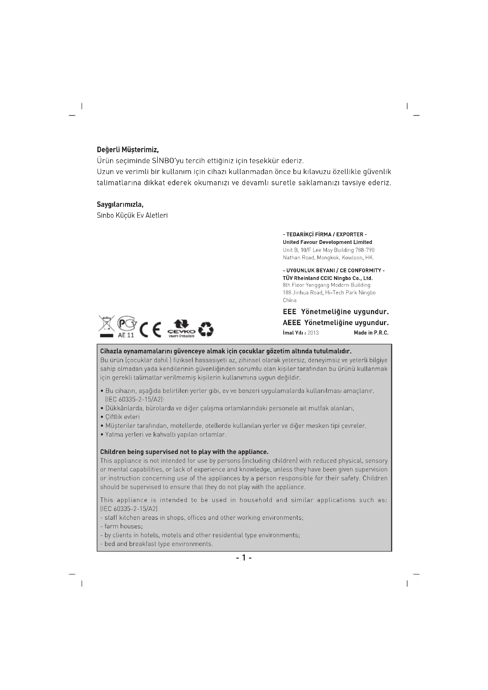 IT- 1 - De¤erli Müflterimiz, Ürün seçiminde S‹NBO'yu tercih etti¤iniz için teflekkür ederiz. Uzun ve verimli bir kullan›m için cihaz› kullanmadan önce bu k›lavuzu özellikle güvenlik talimatlar›na dikkat ederek okuman›z› ve devaml› suretle saklaman›z› tavsiye ederiz. Sayg›lar›m›zla, Sinbo Küçük Ev Aletleri Cihazla oynamamalarını güvenceye almak için çocuklar gözetim altında tutulmalıdır. Bu ürün (çocuklar dahil ) fiziksel hassasiyeti az, zihinsel olarak yetersiz, deneyimsiz ve yeterli bilgiye sahip olmadan yada kendilerinin güvenli¤inden sorumlu olan kifliler tarafından bu ürünü kullanmak için gerekli talimatlar verilmemifl kiflilerin kullanımına uygun de¤ildir.
