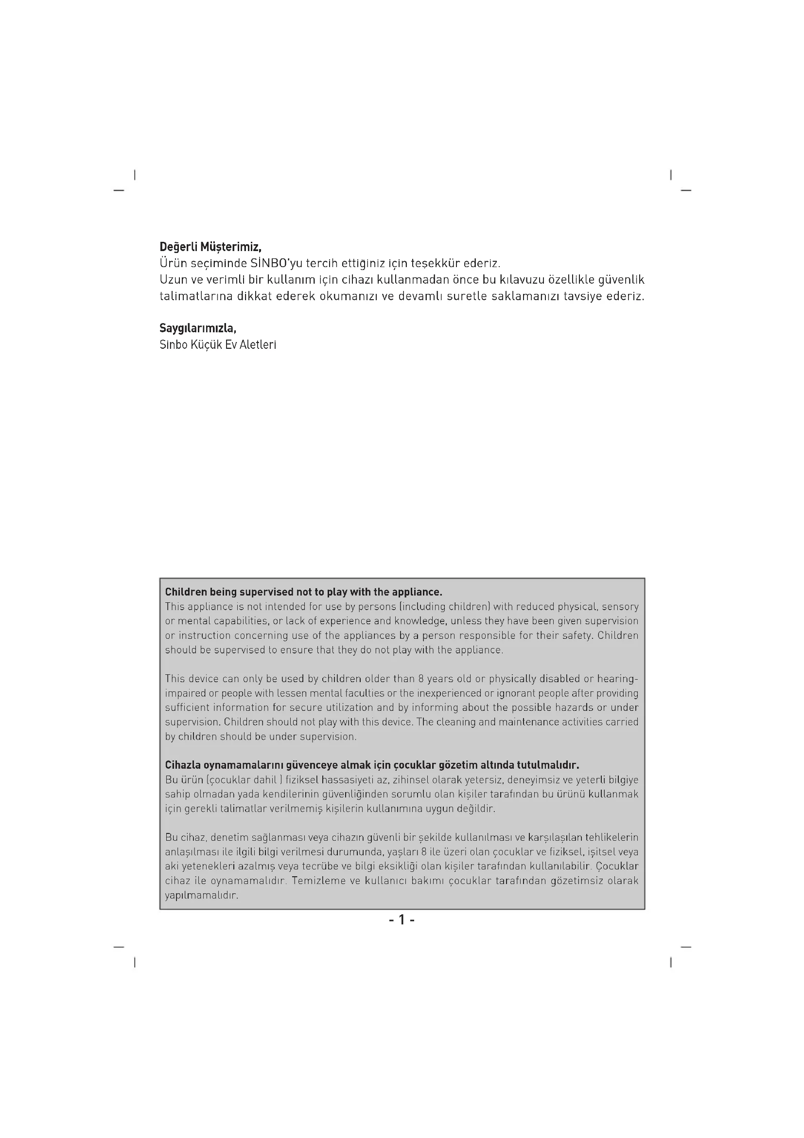 www.sinbo.com.tr- 1 - De¤erli Müflterimiz, Ürün seçiminde S‹NBO'yu tercih etti¤iniz için teflekkür ederiz. Uzun ve verimli bir kullan›m için cihaz› kullanmadan önce bu k›lavuzu özellikle güvenlik talimatlar›na dikkat ederek okuman›z› ve devaml› suretle saklaman›z› tavsiye ederiz. Sayg›lar›m›zla, Sinbo Küçük Ev Aletleri Children being supervised not to play with the appliance. This appliance is not intended for use by persons (including children) with reduced physical, sensory or mental capabilities, or lack of experience and knowledge, unless they have been given supervision or instruction concerning use of the appliances by a person responsible for their safety. Children should be supervised to ensure that they do not play with the appliance. This device can only be used by children older than 8 years old or physically disabled or hearing- impaired or people with lessen mental faculties or the inexperienced or ignorant people after providing sufficient information for secure utilization and by informing about the possible hazards or under supervision. Children should not play with this device. The cleaning and maintenance activities carried by children should be under supervision. Cihazla oynamamalarını güvenceye almak için çocuklar gözetim altında tutulmalıdır. Bu ürün (çocuklar dahil ) fiziksel hassasiyeti az, zihinsel olarak yetersiz, deneyimsiz ve yeterli bilgiye sahip olmadan yada kendilerinin güvenli¤inden sorumlu olan kifliler tarafından bu ürünü kullanmak için gerekli talimatlar verilmemifl kiflilerin kullanımına uygun de¤ildir. Bu cihaz, denetim sa¤lanması veya cihazın güvenli bir flekilde kullanılması ve karflılaflılan tehlikelerin anlaflılması ile ilgili bilgi verilmesi durumunda, yaflları 8 ile üzeri olan çocuklar ve fiziksel, iflitsel veya aki yetenekleri azalmıfl veya tecrübe ve bilgi eksikli¤i olan kifliler tarafından kullanılabilir. Çocuklar cihaz ile oynamamalıdır. Temizleme ve kullanıcı bakımı çocuklar tarafından gözetimsiz olarak yapılmamalıdır.- 2 - ÖNEML‹ UYARILAR