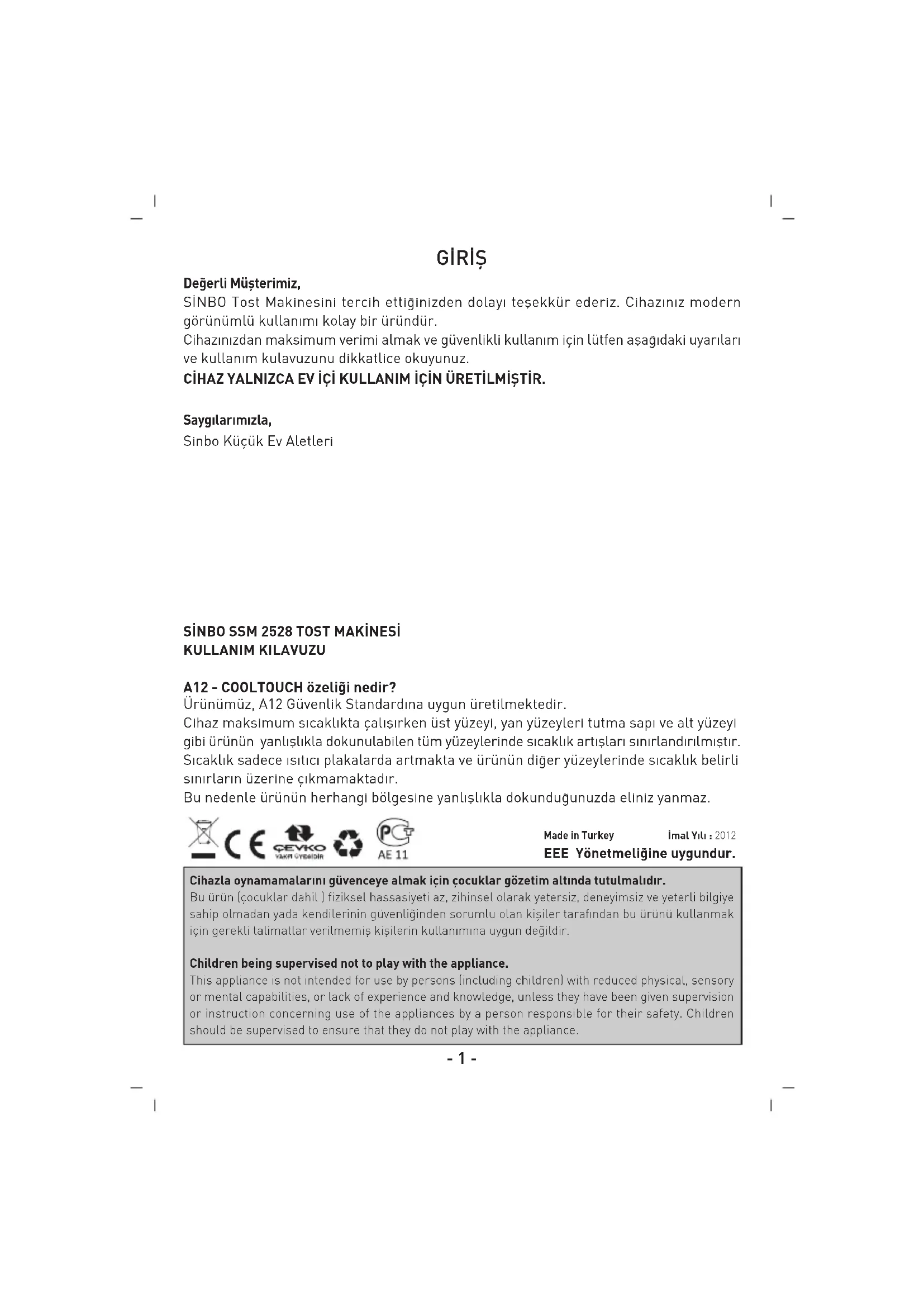 SINBO SSM 2528 TOST MAKINESI KULLANIM KILAVUZU