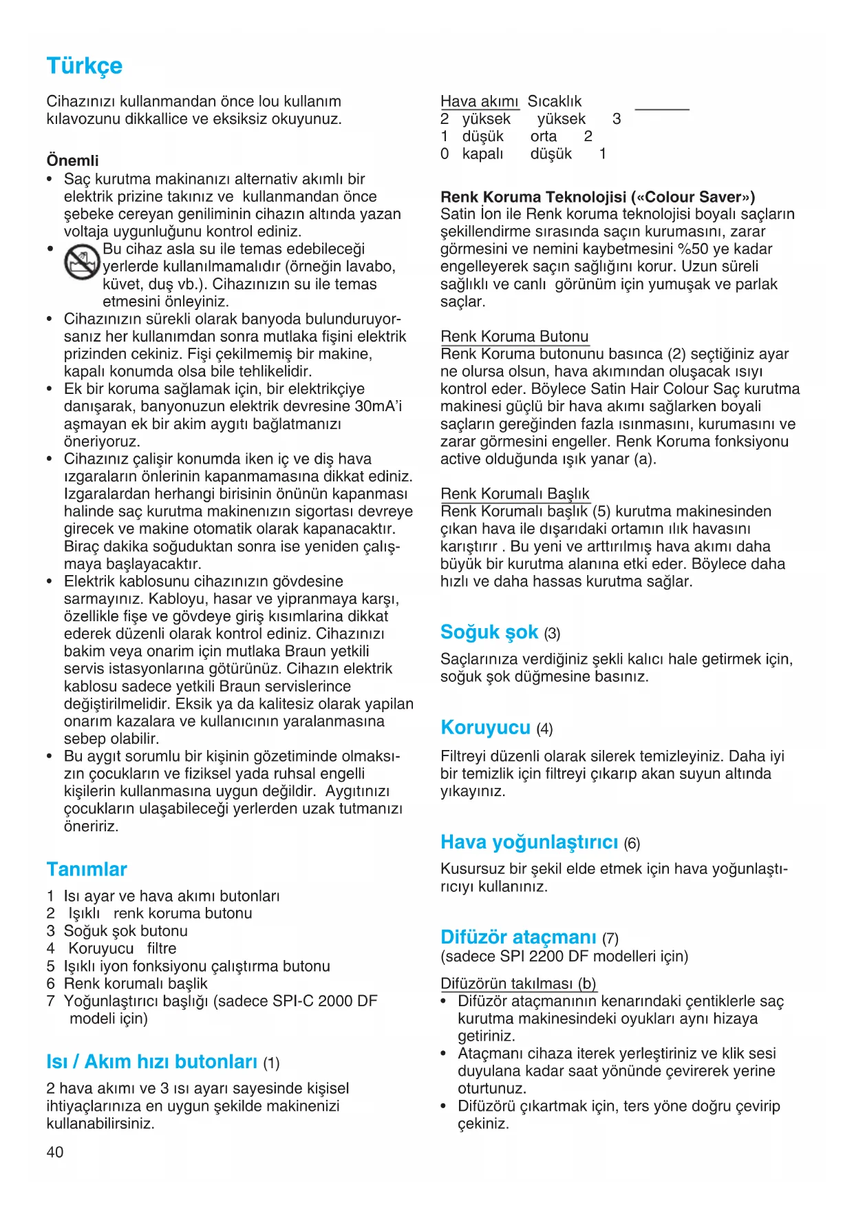 98575691_SPI_C_2000_S4-62.indd 3898575691_SPI_C_2000_S4-62.indd 38 27.02.2008 10:49:40 Uhr27.02.2008 10:49:40 Uhr39 Pentru volum … pentru păr scurt până la mediu: Pentru a da volum de la rădăcină, direcţionaţi cu atenţie difuzorul peste scalp, cu o mişcare uşor circulară. … pentru păr lung: Mai întâi uscaţi vârfurile părului, apoi, cu ajutorul accesoriului, ridicaţi părul uşor către cap şi menţineţi în această poziţie. La final, direcţionaţi accesoriul pe scalp, la rădăcină, cu o uşoară mişcare circulară. Conform Hotãrârii nr. 672 din 19 iulie 2001 privind stabilirea conditiilor de introducere pe piatã a aparatelor electrocasnice în functie de nivelul zgomotului transmis prin aer, valoarea de zgomot dB(A) pentru acest aparat este de 83 dB(A). Pot fi modificate fără înştiinţare prealabilă. Acest produs respectă Directivele Europene relevante EMC 2004/108/EC şi 2006/95/EC (pentru echipamente de joasă tensiune). A nu se arunca produsul împreunå cu deµeurile menajere; a se preda la centrele de colectare specializate. Garanøie Acordåm produsului o garanøie de doi ani începând cu data cumpårårii. În perioada de garanøie eliminåm, gratuit, orice defect al produsului rezultat dintr-un viciu al materialelor sau datoritå execuøiei, putem alege fie pentru repararea fie pentru înlocuirea completå a aparatului. Aceastå garanøie se extinde în fiecare øarå unde aparatul este furnizat de compania Braun sau de distribuitorii såi. Aceastå garanøie nu acoperå situaøiile urmåtoare: defectårile datorate utilizårii necorespunzåtoare, uzura normalå sau defectele care au un efect neglijabil asupra valorii sau utilizårii aparatului µi permit utilizarea acestuia aµa cum este. Garanøia devine nulå dacå reparaøia este realizatå de persoane neautorizate µi dacå nu sunt utilizate piese originale Braun pentru reparaøie. Pentru reparaøii în perioada de garanøie, predaøi sau trimiteøi unui centru de reparaøii autorizat Braun, aparatul complet µi chitanøa de vânzare. 98575691_SPI_C_2000_S4-62.indd 3998575691_SPI_C_2000_S4-62.indd 39 27.02.2008 10:49:41 Uhr27.02.2008 10:49:41 Uhr40 Türkçe Cihazınızı kullanmandan önce lou kullanım kılavozunu dikkallice ve eksiksiz okuyunuz. Önemli Saç kurutma makinanızı alternativ akımlı bir elektrik prizine takınız ve kullanmandan önce µebeke cereyan geniliminin cihazın altında yazan voltaja uygunlu©unu kontrol ediniz. Bu cihaz asla su ile temas edebileceπi yerlerde kullan∂lmamal∂d∂r (örneπin lavabo, küvet, duµ vb.). Cihazınızın su ile temas etmesini önleyiniz. Cihazınızın sürekli olarak banyoda bulunduruyor- sanız her kullanımdan sonra mutlaka fiµini elektrik prizinden cekiniz. Fiµi çekilmemiµ bir makine, kapalı konumda olsa bile tehlikelidir. Ek bir koruma saπlamak için, bir elektrikçiye danıµarak, banyonuzun elektrik devresine 30mA’i aµmayan ek bir akim aygıtı baπlatmanızı öneriyoruz. Cihazınız çaliµir konumda iken iç ve diµ hava ızgaraların önlerinin kapanmamasına dikkat ediniz. Izgaralardan herhangi birisinin önünün kapanması halinde saç kurutma makinenızın sigortası devreye girecek ve makine otomatik olarak kapanacaktır. Biraç dakika soπuduktan sonra ise yeniden çalıµ- maya baµlayacaktır. Elektrik kablosunu cihazınızın gövdesine sarmayınız. Kabloyu, hasar ve yipranmaya karµı, özellikle fiµe ve gövdeye giriµ kısımlarina dikkat ederek düzenli olarak kontrol ediniz. Cihazınızı bakim veya onarim için mutlaka Braun yetkili servis istasyonlarına götürünüz. Cihazın elektrik kablosu sadece yetkili Braun servislerince deπiµtirilmelidir. Eksik ya da kalitesiz olarak yapilan onarım kazalara ve kullanıcının yaralanmasına sebep olabilir. Bu aygıt sorumlu bir kiµinin gözetiminde olmaksı- zın çocukların ve fiziksel yada ruhsal engelli kiµilerin kullanmasına uygun de©ildir. Aygıtınızı çocukların ulaµabilece©i yerlerden uzak tutmanızı öneririz. Tanımlar 1 Isı ayar ve hava akımı butonları 2 Iµıklı renk koruma butonu 3 Soπuk µok butonu 4 Koruyucu filtre 5 Iµıklı iyon fonksiyonu çalıµtırma butonu 6 Renk korumalı baµlik 7 Yoπunlaµtırıcı baµlıπı (sadece SPI-C 2000 DF modeli için) Isı / Akım hızı butonları (1) 2 hava akımı ve 3 ısı ayarı sayesinde kiµisel ihtiyaçlarınıza en uygun µekilde makinenizi kullanabilirsiniz.