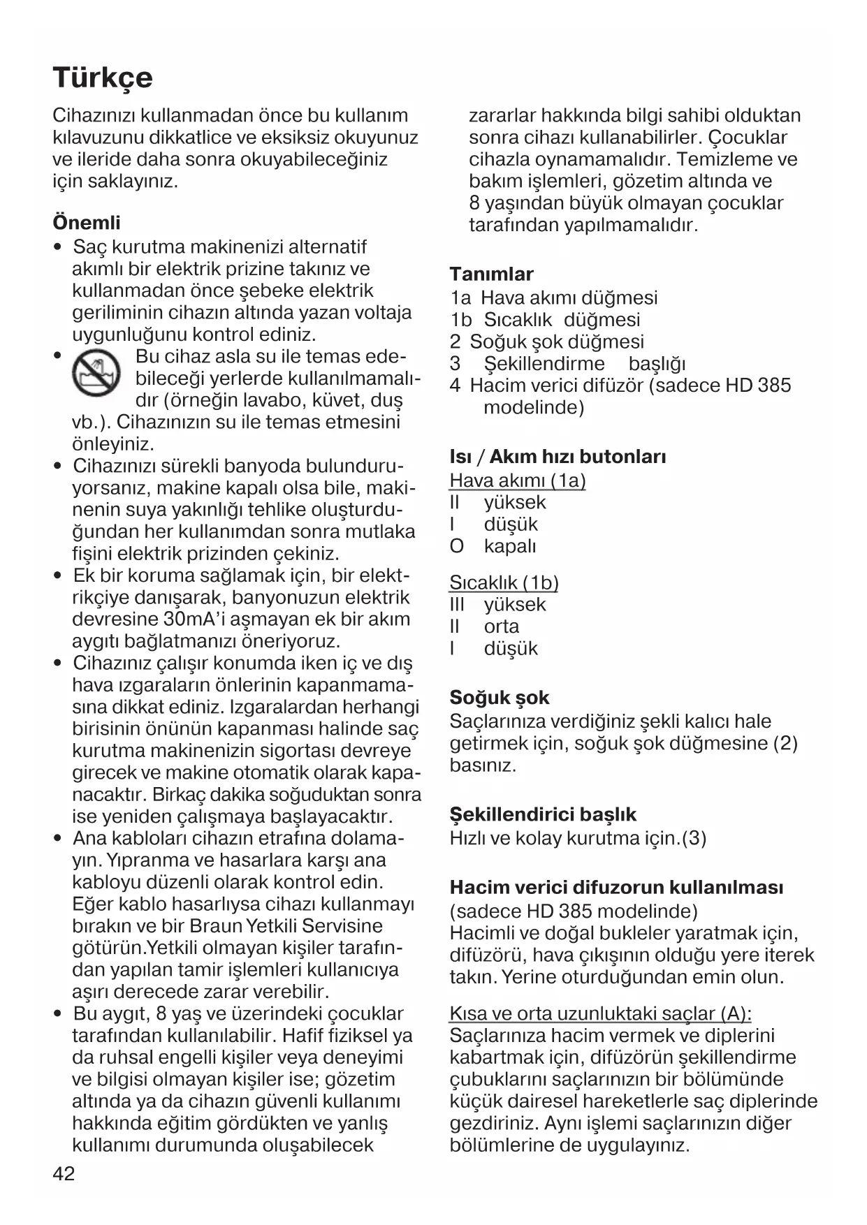 - Bu aygıt, 8 yaş ve üzerindeki çocuklar tarafından kullanılabilir. Hafif fiziksel ya da ruhsal engelli kişiler veya deneyimi ve bilgisi olmayan kişiler ise; gözetim altında ya da cihazın güvenli kullanımı hakkında eğitim gördükten ve yanlış kullanımı durumunda oluşabilecek zararlar hakkında bilgi sahibi olduktan sonra cihazı kullanabilirler. Çocuklar cihazla oynamamalıdır. Temizleme ve bakım işlemleri, gözetim altında ve 8 yaşından büyük olmayan çocuklar tarafından yapılmamalıdır. Tanımlar 1a Hava akımı düğmesi 1b Sıcaklık düğmesi 2 Soğuk şok düğmesi 3 Şekillendirme başlığı 4 Hacim verici difüzör (sadece HD 385 modelinde) Isı / Akım hızı butonları Hava akımı (1a) II yüksek I düşük O kapalı Sıcaklık (1b) III yüksek II orta I düşük Soğuk şok Saçlarınıza verdiğiniz şekli kalıcı hale getirmek için, soğuk şok düğmesine (2) basınız. Şekillendirici başlık Hızlı ve kolay kurutma için.(3) Hacim verici difuzorun kullanılması (sadece HD 385 modelinde) Hacimli ve doğal bukleler yaratmak için, difüzörü, hava çıkışının olduğu yere iterek takın. Yerine oturduğundan emin olun. Kısa ve orta uzunluktaki saçlar (A): Saçlarınıza hacim vermek ve diplerini kabartmak için, difüzörün şekillendirme çubuklarını saçlarınızın bir bölümünde küçük dairesel hareketlerle saç diplerinde gezdiriniz. Aynı işlemi saçlarınızın diğer bölümlerine de uygulayınız. Türkçe 97356636_HD_380-385_S4-66.indd 4297356636_HD_380-385_S4-66.indd 42 18.02.15 13:1018.02.15 13:10 CSS APPROVED Effective Date 25Feb2015 GMT - Printed 29Sep2015 Page 42 of 6643 Uzun saçlar (B): Önce saçlarınızın uçlarını şekillendirme çubukları bulunan difüzör tabanına yer- leştirerek kurutunuz. Daha sonra saçları difüzörün yardımıyla yavaşça başınıza doğru kaldırınız ve tutunuz. Difüzörün çubuklarını hafif dairesel hareketlerle döndürerek saç diplerinin kurumasını ve kabarmasını sağlayınız. Çevre Bilgisi Bu ürün geri dönüştürülebilir elektronik atık içermektedir. Çevreyi korumak adına lütfen kullanım ömrü sonunda ürünü diğer ev atıkları ile beraber atmayınız, yerel toplama merkezlerine götürünüz. Bu bilgiler, bildirim yapılmadan değiştiri- lebilir. AEEE Yönetmeliğine Uygundur Bakanlıkca tespit ve ilan edilen kullanım ömrü 7 yıldır. Üretici firma ve CE uygunluk değerlendirme kuruluşu: Braun GmbH Frankfurter Straße 145 61476 Kronberg / Germany Procter & Gamble Satış ve Dağıtım Ltd. Şti. İcerenkoy Mah. Askent Sok. No:3 A 34752 Ataşehir, İstanbul tarafından ithal edilmiştir. P&G Tüketici İlişkileri PK. 61 34739 Erenköy/İstanbul Ücretsiz Danışma Hattı: 0800 261 6365 (Sabit hattan arayınız)