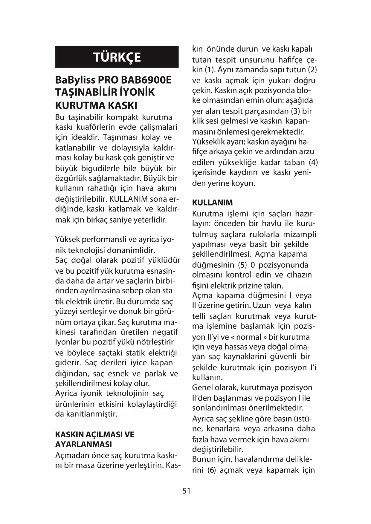 KURUTMA KASKI Bu taşinabilir kompakt kurutma kaskı kuaförlerin evde çalişmalari için idealdir. Taşınması kolay ve katlanabilir ve dolayısıyla kaldır- ması kolay bu kask çok geniştir ve büyük bigudilerle bile büyük bir özgürlük sağlamaktadır. Büyük bir kullanın rahatlığı için hava akımı değiştirilebilir. KULLANIM sona er- diğinde, kaskı katlamak ve kaldır- mak için birkaç saniye yeterlidir. Yüksek performansli ve ayrica iyo- nik teknolojisi donanimlidir. Saç doğal olarak pozitif yüklüdür ve bu pozitif yük kurutma esnasin- da daha da artar ve saçlarin birbi- rinden ayrilmasina sebep olan sta- tik elektrik üretir. Bu durumda saç yüzeyi sertleşir ve donuk bir görü- nüm ortaya çikar. Saç kurutma ma- kinesi tarafindan üretilen negatif iyonlar bu pozitif yükü nötrleştirir ve böylece saçtaki statik elektriği giderir. Saç derileri iyice kapan- diğindan, saç esnek ve parlak ve şekillendirilmesi kolay olur. Ayrica iyonik teknolojinin saç ürünlerinin etkisini kolaylaştirdiği da kanitlanmiştir.