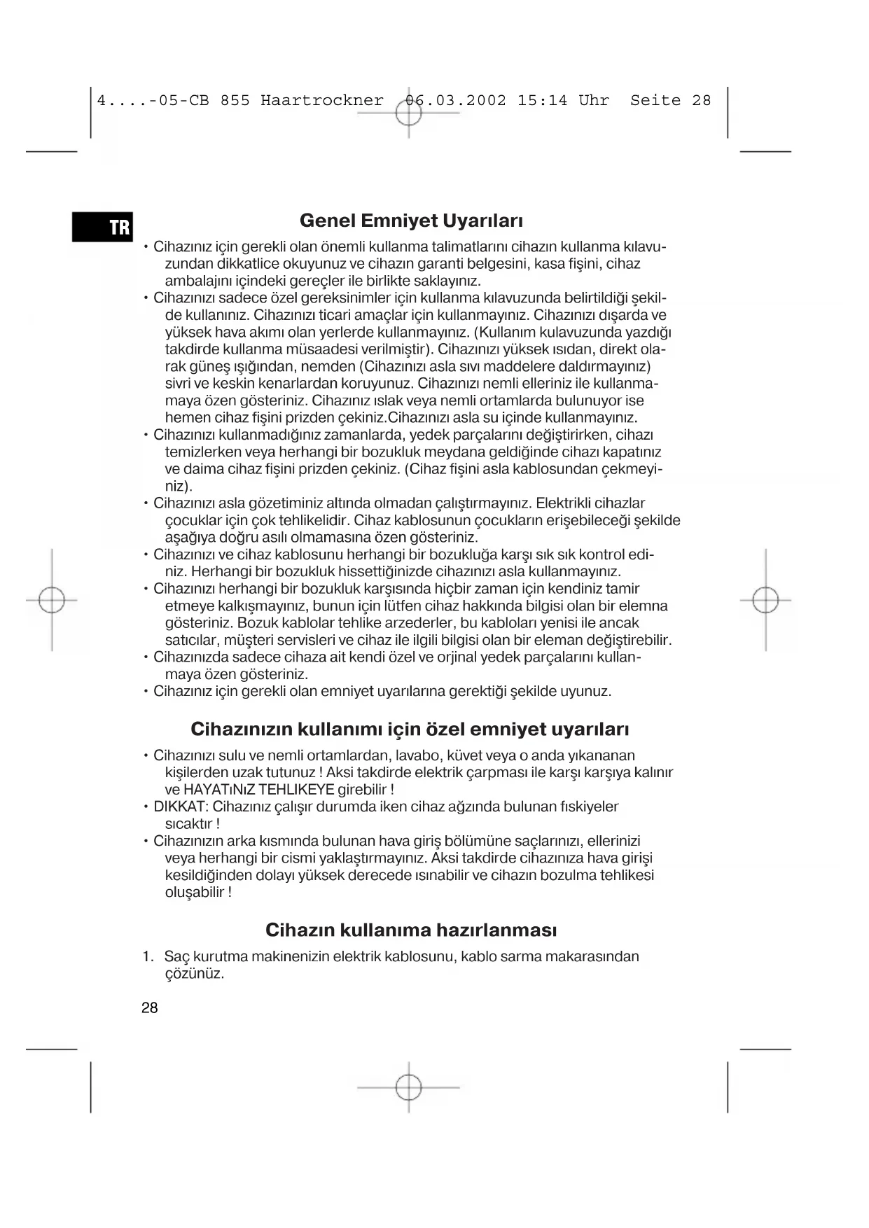 cihaz fişini prizden çekiniz. Cihazınızı muhafaza etmeden önce bir süre soğumasını bekleyiniz. Cihazınızın bakımı ve Temizlenmesi Cihazınızın hava giriş aralıklarını zaman zaman tıkanan gözenekleri içerisinde oluşan tozlardan yumuşak bir fırça yardımı ile temizleyiniz. Saç kurutma makineni- zin dış gövdesinin temizlenmesi için yumuşak, kuru ve temiz bir bez kullanabilirsi- niz. Cihazın temizliği için başka katkı maddeleri kullanmayınız. Bu cihaz, parazit giderici tekniği ve alçak voltaj emniyeti ile ilgili CE yönetmeliklere uygundur ve emniyet tekniğinin en yeni hükümlerine göre üretilmiştir. Teknik hususları değiştirme hakkı saklıdır. Garanti Garanti süresi, cihazın alış faturası veya başka belgelerle belirlenecek satış tarihin- den başlamak üzere 24 aydır (Alış faturası). Cihazın garanti süresi içerisinde meydana gelebilecek malzeme veya imalat hatalarına bağlı arıza ve kusurların giderilmesini kapsar. Garanti göstergesi olarak Alış faturanız geçerlidir ve bu alış faturayı saklamanızı tavsiye ederiz. Cihazın garantisüresi içerisinde değiştirmeniz veya tamir ettirmeni- zolur ise bu alış faturanızı ibraz etmeniz gerekecektir. Aksi halde cihazın tamiri veya değişmesi ücretsiz (garanti süresi içerisinde) mümkün olamaz. Garanti süresi içerisinde cihazı kendi orjinal ambalajı ile ve alış faturası ile birlikte almış bulunduğuz bayisine geri veriniz. Cam kırıklıkları ve yedek parçaların hatalı oluşu tüm cihazın değismesini önler, bugibi olaylarda sadece cihazın özürlü parçaları sizlere gönderilerek değişmesi sağlanır. Cihazın özürlü olan parçalarının yenisi ile değişebilmesi için yeni parçaları sipariş etmeniz gerekir! 4....-05-CB 855 Haartrockner 06.03.2002 15:14 Uhr Seite 2930