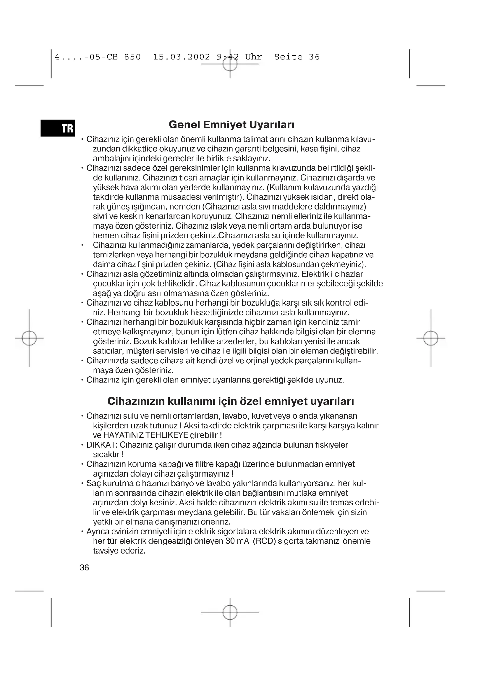 şalterini kullanarak) çeşitli basamaklarda ayarlayabilirsiniz. : Pozisyon 1: Saçlarınızı soğuk hava ile kurutabilirsiniz Pozisyon 2: Orta derecede olan kurutma gücü, yavaş ve yumuşak kurut- malar için. Pozisyon 3: Yüksek derecede olan kurutma gücü. Cihazınızın saç kurutma derecelerini isteğinize göre (cihazınızın sol şalterini kullanarak) çeşitli basamaklarda ayarlayabilirsiniz. : Pozisyon 0: AUS Cihaz kapalı pozisyonunu alır Pozisyon 1: Hafif hava akımını sağlar Pozisyon 2: Yüksek ve kuvetli hava akımını sağlar COOL- Shot Cihazınız bu fonksiyonu ile saçlarınızın kurutma esnasında sıcak ve soğuk hava dalgalarını birleştirerek saçlarınıza ılık hava verir. Turbo Tuşu Cihazınızın turbo tuşunu devreye geçirdiğinizde, cihazdan gelen hava akımını daha fazlası ile yükseltebilirsiniz. Cihazınızın bakımı ve Temizlenmesi Cihazınızın hava giriş aralıklarını zaman zaman tıkanan gözenekleri içerisinde oluşan tozlardan yumuşak bir fırça yardımı ile temizleyiniz. Saç kurutma makineni- zin dış gövdesinin temizlenmesi için yumuşak, kuru ve temiz bir bez kullanabilirsi- niz. Cihazın temizliği için başka katkı maddeleri kullanmayınız. Cihazınızın hava çekiş kapağını çıkarmak için Cihazınızın kapağını çıkarmak için kapağı yaklaşık olarak 30 derece sola çevirerek açınız. Makinenizde bulunan filitreyi çekerek filitre yuvasından çıkmasını sağlayınız, bu işlemden sonra filitreyi yıkamak ve temizlemek için filitreyi akar su altına tutunuz. Filitreyi tekrar makinedeki filitre yuvasına takmadan önce filitrenin iyice kurumasını sağlayınız. Bu cihaz, parazit giderici tekniği ve alçak voltaj emniyeti ile ilgili CE yönetmeliklere uygundur ve emniyet tekniğinin en yeni hükümlerine göre üretilmiştir. Teknik hususları değiştirme hakkı saklıdır. 4....-05-CB 850 15.03.2002 9:42 Uhr Seite 37Garanti Garanti süresi, cihazın alış faturası veya başka belgelerle belirlenecek satış tarihin- den başlamak üzere 24 aydır (Alış faturası). Cihazın garanti süresi içerisinde meydana gelebilecek malzeme veya imalat hatalarına bağlı arıza ve kusurların giderilmesini kapsar. Garanti göstergesi olarak Alış faturanız geçerlidir ve bu alış faturayı saklamanızı tavsiye ederiz. Cihazın garantisüresi içerisinde değiştirmeniz veya tamir ettirmeni- zolur ise bu alış faturanızı ibraz etmeniz gerekecektir. Aksi halde cihazın tamiri veya değişmesi ücretsiz (garanti süresi içerisinde) mümkün olamaz. Garanti süresi içerisinde cihazı kendi orjinal ambalajı ile ve alış faturası ile birlikte almış bulunduğuz bayisine geri veriniz. Cam kırıklıkları ve yedek parçaların hatalı oluşu tüm cihazın değismesini önler, bugibi olaylarda sadece cihazın özürlü parçaları sizlere gönderilerek değişmesi sağlanır. Cihazın özürlü olan parçalarının yenisi ile değişebilmesi için yeni parçaları sipariş etmeniz gerekir! Garanti dışı hizmetler (temizlemek, ayarlamak ) ve aşınma parçaları garanti kap- samı dışındadır ve masrafları müşteriye fatura edilir. Usulüne uygun olarak yapılmayan bağlantılar, amaca uymayan kullanımlar, monta- jve kullanma talimatına uyulmamasından doğacak kusur ve arızalar garanti kap- samına girmez. Garanti sonrası Garanti süresinin dolmasından sonra cihazda yapılan tamir veya hizmet, yetkili bayi veya yetkili servis tarafından müşteriye fatura edilir. Yapılan garanti dahili bir hizmet, cihazın garanti süresinin uzamasını veya bu sürenin yeni bir tarihten başlamasını gerektirmez.