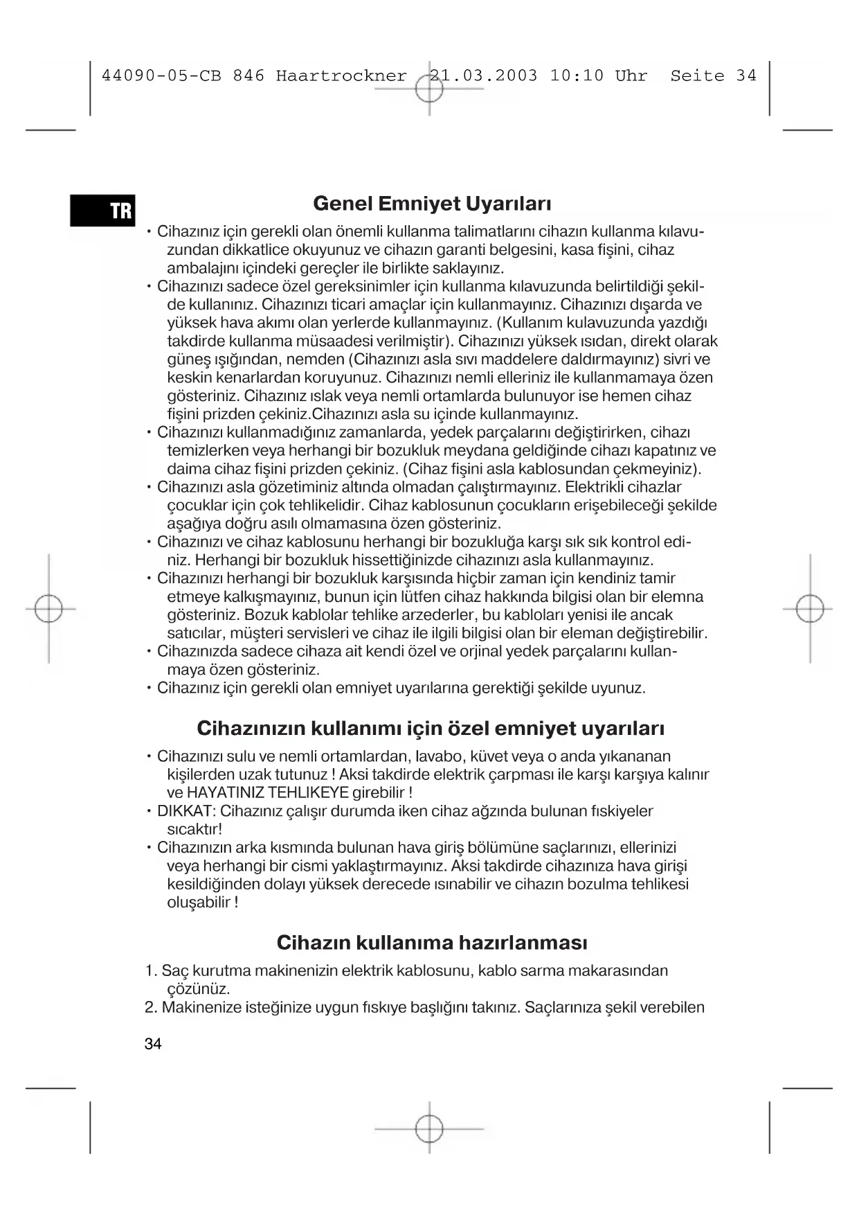 cihaz fişini prizden çekiniz. Cihazınızı muhafaza etmeden önce bir süre soğumasını bekleyiniz. Cihazınızın bakımı ve Temizlenmesi Cihazınızın hava giriş aralıklarını zaman zaman tıkanan gözenekleri içerisinde oluşan tozlardan yumuşak bir fırça yardımı ile temizleyiniz. Saç kurutma makineni- zin dış gövdesinin temizlenmesi için yumuşak, kuru ve temiz bir bez kullanabilirsi- niz. Cihazın temizliği için başka katkı maddeleri kullanmayınız. Cihazınızın hava çekiş kapağını çıkarmak için Cihazınızın kapağını çıkarmak için kapağı yaklaşık olarak 30 derece sola çevirerek açınız. Makinenizde bulunan filitreyi çekerek filitre yuvasından çıkmasını sağlayınız, bu işlemden sonra filitreyi yıkamak ve temizlemek için akar su altına tutunuz. Filitreyi tekrar makinedeki filitre yuvasına takmadan önce filitrenin iyice kurumasını sağlayınız. Bu cihaz, parazit giderici tekniği ve alçak voltaj emniyeti ile ilgili CE yönetmeliklere uygundur ve emniyet tekniğinin en yeni hükümlerine göre üretilmiştir. Teknik hususları değiştirme hakkı saklıdır. Garanti Garanti süresi, cihazın alış faturası veya başka belgelerle belirlenecek satış tarihin- den başlamak üzere 24 aydır (Alış faturası). Cihazın garanti süresi içerisinde meydana gelebilecek malzeme veya imalat hatalarına bağlı arıza ve kusurların giderilmesini kapsar. 44090-05-CB 846 Haartrockner 21.03.2003 10:10 Uhr Seite 3536