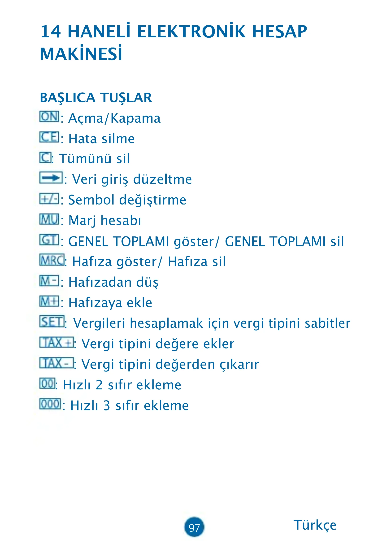 : Açma/Kapama : Hata silme : Tümünü sil : Veri giriş düzeltme : Sembol değiştirme : Marj hesabı : GENEL TOPLAMI göster/ GENEL TOPLAMI sil : Hafıza göster/ Hafıza sil : Hafızadan düş : Hafızaya ekle