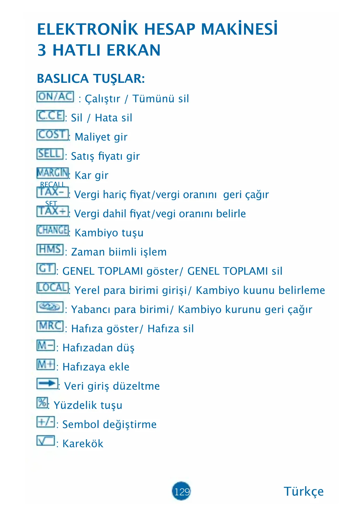 3 HATLI ERKAN BASLICA TUŞLAR: : Çalıştır / Tümünü sil : Sil / Hata sil : Maliyet gir : Satış yatı gir : Kar gir : Vergi hariç yat/vergi oranını geri çağır : Vergi dahil yat/vegi oranını belirle : Kambiyo tuşu : Zaman biimli işlem : GENEL TOPLAMI göster/ GENEL TOPLAMI sil : Yerel para birimi girişi/ Kambiyo kuunu belirleme : Yabancı para birimi/ Kambiyo kurunu geri çağır : Hafıza göster/ Hafıza sil : Hafızadan düş : Hafızaya ekle : Veri giriş düzeltme : Yüzdelik tuşu : Sembol değiştirme : Karekök RECALL SET130 SELEKTÖRLERİN TANIMI: