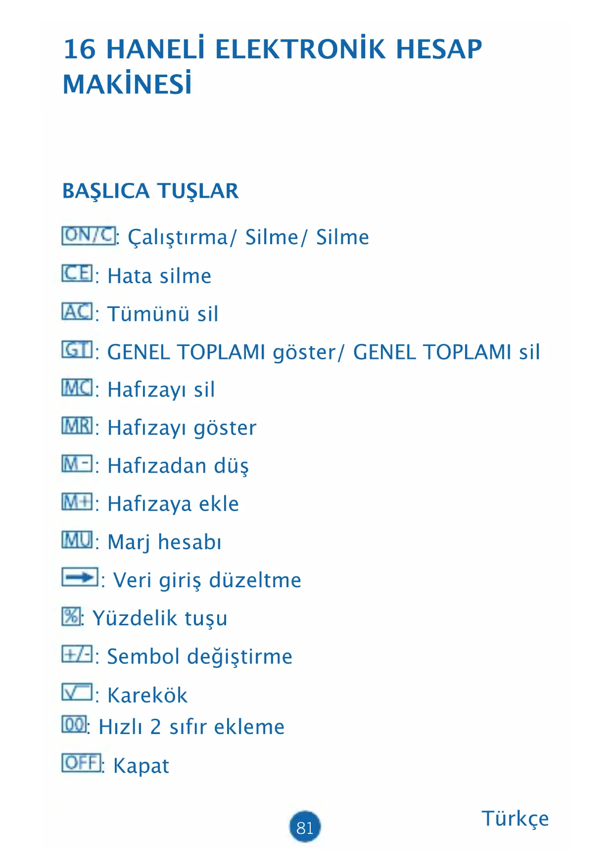 : Çalıştırma/ Silme/ Silme : Hata silme : Tümünü sil : GENEL TOPLAMI göster/ GENEL TOPLAMI sil : Hafızayı sil : Hafızayı göster : Hafızadan düş : Hafızaya ekle : Marj hesabı : Veri giriş düzeltme : Yüzdelik tuşu : Sembol değiştirme : Karekök : Hızlı 2 sıfır ekleme : Kapat Türkçe82 SELEKTÖRLERİN TANIMI:
