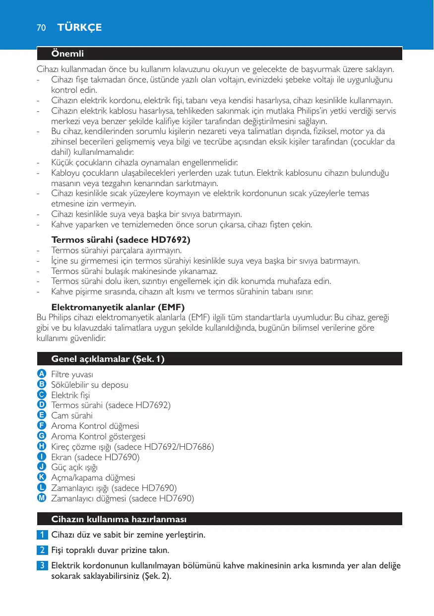 Türkçe Önemli Cihazı kullanmadan önce bu kullanım kılavuzunu okuyun ve gelecekte de başvurmak üzere saklayın. - Cihazı fişe takmadan önce, üstünde yazılı olan voltajın, evinizdeki şebeke voltajı ile uygunluğunu kontrol edin. - Cihazın elektrik kordonu, elektrik fişi, tabanı veya kendisi hasarlıysa, cihazı kesinlikle kullanmayın. - Cihazın elektrik kablosu hasarlıysa, tehlikeden sakınmak için mutlaka Philips’in yetki verdiği servis merkezi veya benzer şekilde kalifiye kişiler tarafından değiştirilmesini sağlayın. - Bu cihaz, kendilerinden sorumlu kişilerin nezareti veya talimatları dışında, fiziksel, motor ya da zihinsel becerileri gelişmemiş veya bilgi ve tecrübe açısından eksik kişiler tarafından (çocuklar da dahil) kullanılmamalıdır. - Küçük çocukların cihazla oynamaları engellenmelidir. - Kabloyu çocukların ulaşabilecekleri yerlerden uzak tutun. Elektrik kablosunu cihazın bulunduğu masanın veya tezgahın kenarından sarkıtmayın. - Cihazı kesinlikle sıcak yüzeylere koymayın ve elektrik kordonunun sıcak yüzeylerle temas etmesine izin vermeyin. - Cihazı kesinlikle suya veya başka bir sıvıya batırmayın. - Kahve yaparken ve temizlemeden önce sorun çıkarsa, cihazı fişten çekin. Termos sürahi (sadece HD7692) Termos sürahiyi parçalara ayırmayın. İçine su girmemesi için termos sürahiyi kesinlikle suya veya başka bir sıvıya batırmayın. Termos sürahi bulaşık makinesinde yıkanamaz. Termos sürahi dolu iken, sızıntıyı engellemek için dik konumda muhafaza edin. Kahve pişirme sırasında, cihazın alt kısmı ve termos sürahinin tabanı ısınır.