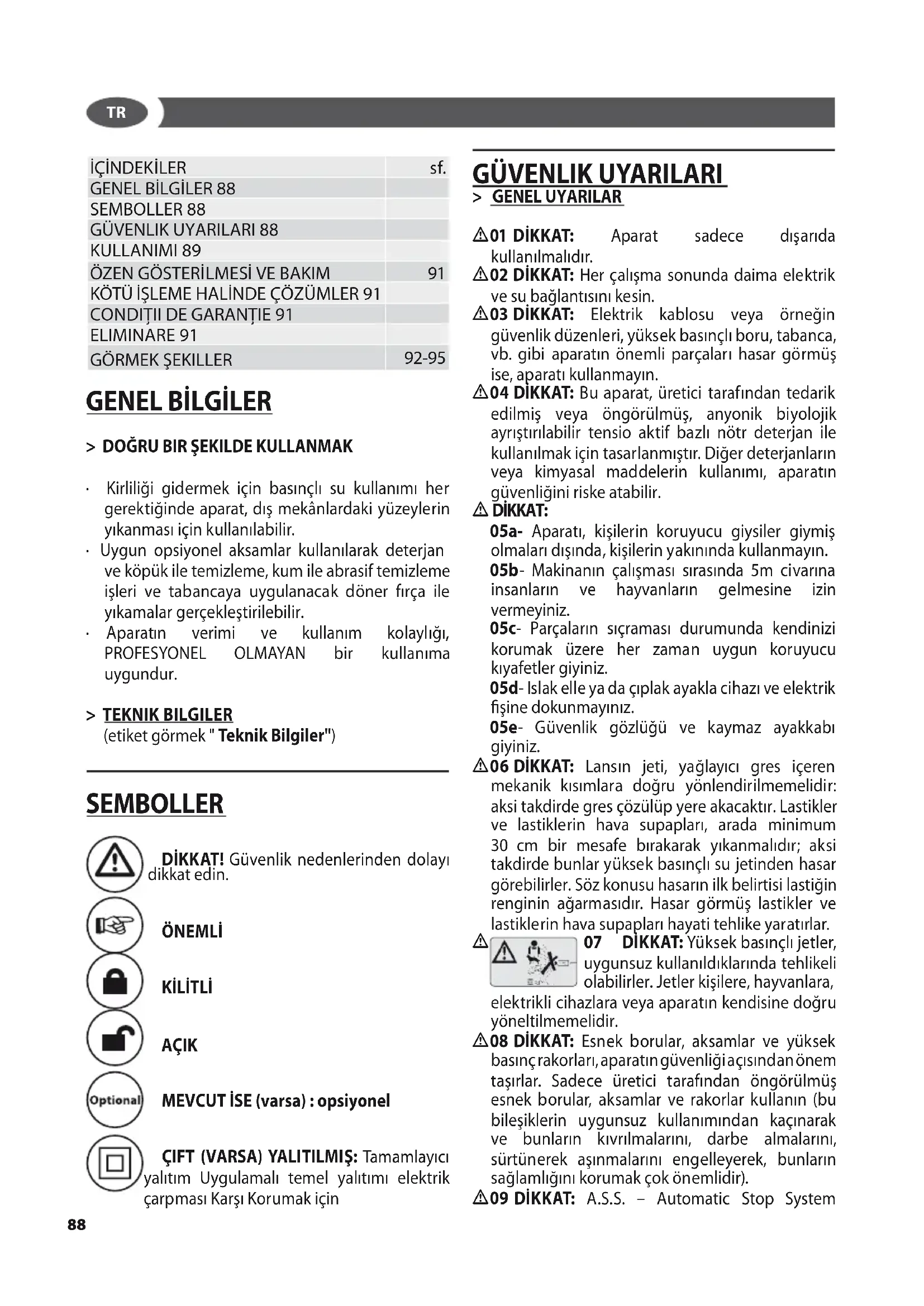 07 DİKKAT: Yüksek basınçlı jetler, uygunsuz kullanıldıklarında tehlikeli olabilirler. Jetler kişilere, hayvanlara, elektrikli cihazlara veya aparatın kendisine doğ ru yöneltilmemelidir.