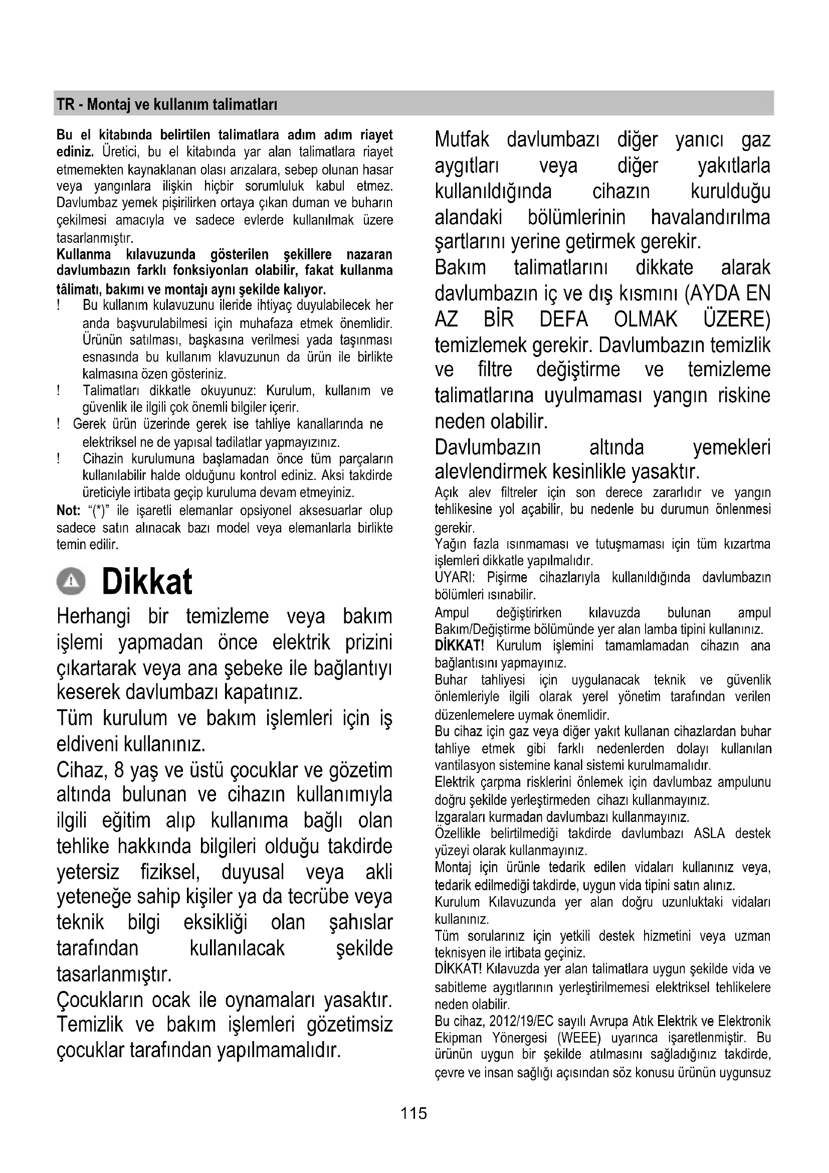 ćete prasak). Ako vam ne bude funkcionirala rasvjeta, kontrolirajte jeste li pravilno stavili lampu prije nego što pozovete tehnički servis115 TR - Montaj ve kullanım talimatları Bu el kitabında belirtilen talimatlara adım adım riayet ediniz. Üretici, bu el kitabında yar alan talimatlara riayet etmemekten kaynaklanan olası arızalara, sebep olunan hasar veya yangınlara ilişkin hiçbir sorumluluk kabul etmez. Davlumbaz yemek pişirilirken ortaya çıkan duman ve buharın çekilmesi amacıyla ve sadece evlerde kullanılmak üzere tasarlanmıştır. Kullanma kılavuzunda gösterilen şekillere nazaran davlumbazın farklı fonksiyonları olabilir, fakat kullanma tâlimatı, bakımı ve montajı aynı şekilde kalıyor. ! Bu kullanım kulavuzunu ileride ihtiyaç duyulabilecek her anda başvurulabilmesi için muhafaza etmek önemlidir. Ürünün satılması, başkasına verilmesi yada taşınması esnasında bu kullanım klavuzunun da ürün ile birlikte kalmasına özen gösteriniz. ! Talimatları dikkatle okuyunuz: Kurulum, kullanım ve güvenlik ile ilgili çok önemli bilgiler içerir. ! Gerek ürün üzerinde gerek ise tahliye kanallarında ne elektriksel ne de yapısal tadilatlar yapmayızınız. ! Cihazin kurulumuna başlamadan önce tüm parçaların kullanılabilir halde olduğunu kontrol ediniz. Aksi takdirde üreticiyle irtibata geçip kuruluma devam etmeyiniz. Not: “(*)” ile işaretli elemanlar opsiyonel aksesuarlar olup sadece satın alınacak bazı model veya elemanlarla birlikte temin edilir. Dikkat Herhangi bir temizleme veya bakım işlemi yapmadan önce elektrik prizini çıkartarak veya ana şebeke ile bağlantıyı keserek davlumbazı kapatınız. Tüm kurulum ve bakım işlemleri için iş eldiveni kullanınız. Cihaz, 8 yaş ve üstü çocuklar ve gözetim altında bulunan ve cihazın kullanımıyla ilgili eğitim alıp kullanıma bağlı olan tehlike hakkında bilgileri olduğu takdirde yetersiz fiziksel, duyusal veya akli yeteneğe sahip kişiler ya da tecrübe veya teknik bilgi eksikliği olan şahıslar tarafından kullanılacak şekilde tasarlanmıştır. Çocukların ocak ile oynamaları yasaktır. Temizlik ve bakım işlemleri gözetimsiz çocuklar tarafından yapılmamalıdır. Mutfak davlumbazı diğer yanıcı gaz aygıtları veya diğer yakıtlarla kullanıldığında cihazın kurulduğu alandaki bölümlerinin havalandırılma şartlarını yerine getirmek gerekir. Bakım talimatlarını dikkate alarak davlumbazın iç ve dış kısmını (AYDA EN AZ BİR DEFA OLMAK ÜZERE) temizlemek gerekir. Davlumbazın temizlik ve filtre değiştirme ve temizleme talimatlarına uyulmaması yangın riskine neden olabilir. Davlumbazın altında yemekleri alevlendirmek kesinlikle yasaktır. Açık alev filtreler için son derece zararlıdır ve yangın tehlikesine yol açabilir, bu nedenle bu durumun önlenmesi gerekir. Yağın fazla ısınmaması ve tutuşmaması için tüm kızartma işlemleri dikkatle yapılmalıdır. UYARI: Pişirme cihazlarıyla kullanıldığında davlumbazın bölümleri ısınabilir. Ampul değiştirirken kılavuzda bulunan ampul Bakım/Değiştirme bölümünde yer alan lamba tipini kullanınız. DİKKAT! Kurulum işlemini tamamlamadan cihazın ana bağlantısını yapmayınız. Buhar tahliyesi için uygulanacak teknik ve güvenlik önlemleriyle ilgili olarak yerel yönetim tarafından verilen düzenlemelere uymak önemlidir. Bu cihaz için gaz veya diğer yakıt kullanan cihazlardan buhar tahliye etmek gibi farklı nedenlerden dolayı kullanılan vantilasyon sistemine kanal sistemi kurulmamalıdır. Elektrik çarpma risklerini önlemek için davlumbaz ampulunu doğru şekilde yerleştirmeden cihazı kullanmayınız. Izgaraları kurmadan davlumbazı kullanmayınız. Özellikle belirtilmediği takdirde davlumbazı ASLA destek yüzeyi olarak kullanmayınız. Montaj için ürünle tedarik edilen vidaları kullanınız veya, tedarik edilmediği takdirde, uygun vida tipini satın alınız. Kurulum Kılavuzunda yer alan doğru uzunluktaki vidaları kullanınız. Tüm sorularınız için yetkili destek hizmetini veya uzman teknisyen ile irtibata geçiniz. DİKKAT! Kılavuzda yer alan talimatlara uygun şekilde vida ve sabitleme aygıtlarının yerleştirilmemesi elektriksel tehlikelere neden olabilir. Bu cihaz, 2012/19/EC sayılı Avrupa Atık Elektrik ve Elektronik Ekipman Yönergesi (WEEE) uyar ınca işaretlenmiştir. Bu ürünün uygun bir şekilde atılmasını sağladığınız takdirde, çevre ve insan sağlığı açısından söz konusu ürünün uygunsuz116 bir şekilde işleme tabi tutulması sonucu ortaya çıkabilecek olası olumsuz etkileri önlemiş olacaksınız. Ürün ya da ürün ile beraber verilen belgeler üzerinde bulunan sembolü, bu cihazın evsel bir atık olarak görülmemesi gerektiğine işaret eder. Cihaz, bu tip elektrikli ve elektronik cihazların atıldığı dönüşümlü toplama noktasına teslim edilmelidir. Atıkları yok etme işlemi, atık yok etme konusunda çevre ile ilgili mevcut yerel düzenlemeler doğrultusunda gerçekleştirilmelidir. Bu ürünün geri dönüşüm koşulları hakkında ayrıntılı bilgi için, hudutları içinde bulunduğunuz belediyenin ilgili dairesine, atık yok etme servisine veya ürünün satıcısına danışın. Bu aygıt aşağıda belirtilenlere göre tasarlanmış, test edilmiş ve üretilmiştir: