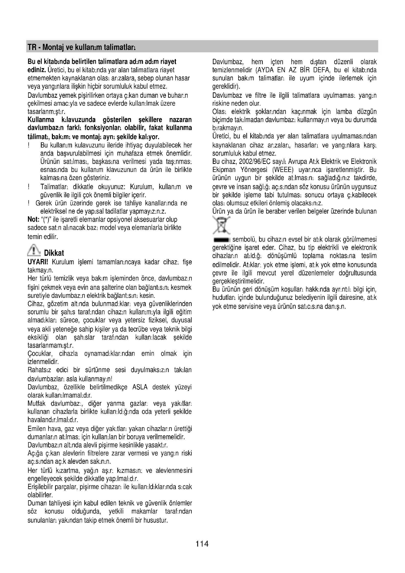 ćete prasak). Ako vam ne bude funkcionirala rasvjeta, kontrolirajte jeste li pravilno stavili lampu prije nego što pozovete tehnički servis114 TR - Montaj ve kullanım talimatları Bu el kitabında belirtilen talimatlara adım adım riayet ediniz. Üretici, bu el kitabında yar alan talimatlara riayet etmemekten kaynaklanan olası arızalara, sebep olunan hasar veya yangınlara ilişkin hiçbir sorumluluk kabul etmez. Davlumbaz yemek pişirilirken ortaya çıkan duman ve buharın çekilmesi amacıyla ve sadece evlerde kullanılmak üzere tasarlanmıştır. Kullanma kılavuzunda gösterilen şekillere nazaran davlumbazın farklı fonksiyonları olabilir, fakat kullanma tâlimatı, bakımı ve montajı aynı şekilde kalıyor. ! Bu kullanım kulavuzunu ileride ihtiyaç duyulabilecek her anda başvurulabilmesi için muhafaza etmek önemlidir. Ürünün satılması, başkasına verilmesi yada taşınması esnasında bu kullanım klavuzunun da ürün ile birlikte kalmasına özen gösteriniz. ! Talimatları dikkatle okuyunuz: Kurulum, kullanım ve güvenlik ile ilgili çok önemli bilgiler içerir. ! Gerek ürün üzerinde gerek ise tahliye kanallarında ne elektriksel ne de yapısal tadilatlar yapmayızınız. Not: “(*)” ile işaretli elemanlar opsiyonel aksesuarlar olup sadece satın alınacak bazı model veya elemanlarla birlikte temin edilir. Dikkat UYARI! Kurulum işlemi tamamlanıncaya kadar cihazı fişe takmayın. Her türlü temizlik veya bakım işleminden önce, davlumbazın fişini çekmek veya evin ana şalterine olan bağlantısını kesmek suretiyle davlumbazın elektrik bağlantısını kesin. Cihaz, gözetim altında bulunmadıkları veya güvenliklerinden sorumlu bir şahıs tarafından cihazın kullanımıyla ilgili eğitim almadıkları sürece, çocuklar veya yetersiz fiziksel, duyusal veya akli yeteneğe sahip kişiler ya da tecrübe veya teknik bilgi eksikliği olan şahıslar tarafından kullanılacak şekilde tasarlanmamıştır. Çocuklar, cihazla oynamadıklarından emin olmak için izlenmelidir. Rahatsız edi ci bir sürtünme sesi duyulmaksızın takılan davlumbazları asla kullanmayın! Davlumbaz, özellikle belirtilmedikçe ASLA destek yüzeyi olarak kullanılmamalıdır. Mutfak davlumbazı, diğer yanma gazları veya yakıtları kullanan cihazlarla birlikte kullanıldığında oda yeterli şekilde havalandırılmalıdır. Emilen hava, gaz veya diğer yakıtları yakan cihazların ürettiği dumanların atılması için kullanılan bir boruya verilmemelidir. Davlumbazın altında alevli pişirme kesinlikle yasaktır. Açığa çıkan alevlerin filtrelere zarar vermesi ve yangın riski açısından açık alevden sakının. Her türlü kı zartma, yağın aşırı kızmasını ve alevlenme sini engelleyecek şekilde dikkatle yapılmalıdır. Erişilebilir parçalar, pişirme cihazarı ile kullanıldıklarında sıcak olabilirler. Duman tahliyesi için kabul edilen teknik ve güvenlik önlemler söz konusu olduğunda, yetkili makamlar tarafından sunulanları yakından takip etmek önemli bir husustur. Davlumbaz, hem içten hem dıştan düzenli olarak temizlenmelidir (AYDA EN AZ BİR DEFA, bu el kitabında sunulan bakım talimatları ile uyum içinde ilerlemek için gereklidir). Davlumbaz ve filtre ile ilgili talimatlara uyulmaması yangın riskine neden olur. Olası elektrik şoklarından kaçınmak için lamba düzgün biçimde takılmadan davlumbazı kullanmayın veya bu durumda bırakmayın. Üretici, bu el kitabında yer alan talimatlara uyulmamasından kaynaklanan cihaz arızaları, hasarlar ı ve yangınlara karşı sorumluluk kabul etmez. Bu cihaz, 2002/96/EC sayılı Avrupa Atık Elektrik ve Elektronik Ekipman Yönergesi (WEEE) uyarınca işaretlenmiştir. Bu ürünün uygun bir şekilde atılmasını sağladığınız takdirde, çevre ve insan sağlığı açısından söz konusu ürünün uygunsuz bir şekilde işleme tabi tutulması sonucu ortaya çıkabilecek olası olumsuz etkileri önlemiş olacaksınız. Ürün ya da ürün ile beraber verilen belgeler üzerinde bulunan sembolü, bu cihazın evsel bir atık olarak görülmemesi gerektiğine işaret eder. Cihaz, bu tip elektrikli ve elektronik cihazların atıldığı dönüşümlü toplama noktasına teslim edilmelidir. Atıkları yok etme işlemi, atık yok etme konusunda çevre ile ilgili mevcut yerel düzenlemeler doğrultusunda gerçekleştirilmelidir. Bu ürünün geri dönüşüm koşulları hakkında ayrıntılı bilgi için, hudutları içinde bulunduğunuz belediyenin ilgili dairesine, atık yok etme servisine veya ürünün satıcısına danışın.115 Kullanım Davlumbaz, havayı dışarı atıcı veya filtre edici model olarak tasarlanmıştır. Aspiratörlü model Yemek buharları, bağlantı falanjına sabitlenmiş bir tahliye borusu sayesinde dışarıya atılırlar. Tahliye borusunun çapı bağlantı halkasının çapına eşit olmalıdır. Dikkat! Tahliye borusu ürün ile birlikte tedarik edilmez. Ayrıca satın alınmalıdır. Yatay satıhda boru, havayı dışarıya kolayca taşıyabilmesi için yukarı doğru hafif bir açıya sahip olmalıdır ( yaklaşık 10°). Eğer davlumbazın karbon filtreleri var ise bunlar çıkartılmalıdır. Davlumbazı duvardaki çık ış borularına ve ağızlarına bağlayınız. Diametresi hava çıkışıyla aynı olmalıdır (bağlantı halkası). Boruların ve duvardaki az çaplı çıkış borularının emme gücünün iyi çalışmasını azaltır ve gürültüyü büyük ölçüde arttırır. Dolayısıyla bu konuyla ilgili hiçbir mesuliyet kabul edilmez. ! Mümkün olan en kısa boyda tahliye borusu kullanın ! En az sayıda dirseğe sahip boru kullanın (Maksimum dirsek açısı: 90°). ! Borunun kesitinin ( genişliğinin ) ani olarak değişmesinden kaç ının. ! İç yüzeyi mümkün olan en pürüzsüz boruyu tercih edin. ! Borunun yapıldığı malzeme yasaların onayladığı türden olmalıdır. Filtreli model Aspire 