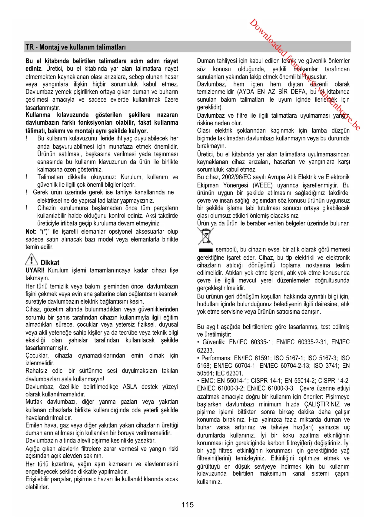 Downloaded from www.vandenborre.be115 TR - Montaj ve kullanım talimatları Bu el kitabında belirtilen talimatlara adım adım riayet ediniz. Üretici, bu el kitabında yar alan talimatlara riayet etmemekten kaynaklanan olası arızalara, sebep olunan hasar veya yangınlara ilişkin hiçbir sorumluluk kabul etmez. Davlumbaz yemek pişirilirken ortaya çıkan duman ve buharın çekilmesi amacıyla ve sadece evlerde kullanılmak üzere tasarlanmıştır. Kullanma kılavuzunda gösterilen şekillere nazaran davlumbazın farklı fonksiyonları olabilir, fakat kullanma tâlimatı, bakımı ve montajı aynı şekilde kalıyor. ! Bu kullanım kulavuzunu ileride ihtiyaç duyulabilecek her anda başvurulabilmesi için muhafaza etmek önemlidir. Ürünün satılması, başkasına verilmesi yada taşınması esnasında bu kullanım klavuzunun da ürün ile birlikte kalmasına özen gösteriniz. ! Talimatları dikkatle okuyunuz: Kurulum, kullanım ve güvenlik ile ilgili çok önemli bilgiler içerir. ! Gerek ürün üzerinde gerek ise tahliye kanallarında ne elektriksel ne de yapısal tadilatlar yapmayızınız. ! Cihazin kurulumuna başlamadan önce tüm parçaların kullanılabilir halde olduğunu kontrol ediniz. Aksi takdirde üreticiyle irtibata geçip kuruluma devam etmeyiniz. Not: “(*)” ile işaretli elemanlar opsiyonel aksesuarlar olup sadece satın alınacak bazı model veya elemanlarla birlikte temin edilir. Dikkat UYARI! Kurulum işlemi tamamlanıncaya kadar cihazı fişe takmayın. Her türlü temizlik veya bakım işleminden önce, davlumbazın fişini çekmek veya evin ana şalterine olan bağlantısını kesmek suretiyle davlumbazın elektrik bağlantısını kesin. Cihaz, gözetim altında bulunmadıkları veya güvenliklerinden sorumlu bir şahıs tarafından cihazın kullanımıyla ilgili eğitim almadıkları sürece, çocuklar veya yetersiz fiziksel, duyusal veya akli yeteneğe sahip kişiler ya da tecrübe veya teknik bilgi eksikliği olan şahıslar tarafından kullanılacak şekilde tasarlanmamıştır. Çocuklar, cihazla oynamadıklarından emin olmak için izlenmelidir. Rahatsız edici bir sürtünme sesi duyulmaksızın takılan davlumbazları asla kullanmayın! Davlumbaz, özellikle belirtilmedikçe ASLA destek yüzeyi olarak kullanılmamalıdır. Mutfak davlumbazı, diğer yanma gazları veya yakıtları kullanan cihazlarla birlikte kullanıldığında oda yeterli şekilde havalandırılmalıdır. Emilen hava, gaz veya diğer yakıtları yakan cihazların ürettiği dumanların atılması için kullanılan bir boruya verilmemelidir. Davlumbazın altında alevli pişirme kesinlikle yasaktır. Açığa çıkan alevlerin filtrelere zarar vermesi ve yangın riski açısından açık alevden sakının. Her türlü kı zartma, yağın aşırı kızmasını ve alevlenmesini engelleyecek şekilde dikkatle yapılmalıdır. Erişilebilir parçalar, pişirme cihazarı ile kullanıldıklarında sıcak olabilirler. Duman tahliyesi için kabul edilen teknik ve güvenlik önlemler söz konusu olduğunda, yetkili makamlar tarafından sunulanları yakından takip etmek önemli bir husustur. Davlumbaz, hem içten hem dıştan düzenli olarak temizlenmelidir (AYDA EN AZ BİR DEFA, bu el kitabında sunulan bakım talimatları ile uyum içinde ilerlemek için gereklidir). Davlumbaz ve filtre ile ilgili talimatlara uyulmaması yangın riskine neden olur. Olası elektrik şoklarından kaçınmak için lamba düzgün biçimde takılmadan davlumbazı kullanmayın veya bu durumda bırakmayın. Üretici, bu el kitabında yer alan talimatlara uyulmamasından kaynaklanan cihaz arızaları , hasarları ve yangınlara karşı sorumluluk kabul etmez. Bu cihaz, 2002/96/EC sayılı Avrupa Atık Elektrik ve Elektronik Ekipman Yönergesi (WEEE) uyarınca işaretlenmiştir. Bu ürünün uygun bir şekilde atılmasını sağladığınız takdirde, çevre ve insan sağlığı açısından söz konusu ürünün uygunsuz bir şekilde işleme tabi tutulması sonucu ortaya çıkabilecek olası olumsuz etkileri önlemiş olacaksınız. Ürün ya da ürün ile beraber verilen belgeler üzerinde bulunan sembolü, bu cihazın evsel bir atık olarak görülmemesi gerektiğine işaret eder. Cihaz, bu tip elektrikli ve elektronik cihazların atıldığı dönüşümlü toplama noktasına teslim edilmelidir. Atıkları yok etme işlemi, atık yok etme konusunda çevre ile ilgili mevcut yerel düzenlemeler doğrultusunda gerçekleştirilmelidir. Bu ürünün geri dönüşüm koşulları hakkında ayrıntılı bilgi için, hudutları içinde bulunduğunuz belediyenin ilgili dairesine, atık yok etme servisine veya ürünün satıcısına danışın. Bu aygıt aşağıda belirtilenlere göre tasarlanmış, test edilmiş ve üretilmiştir: