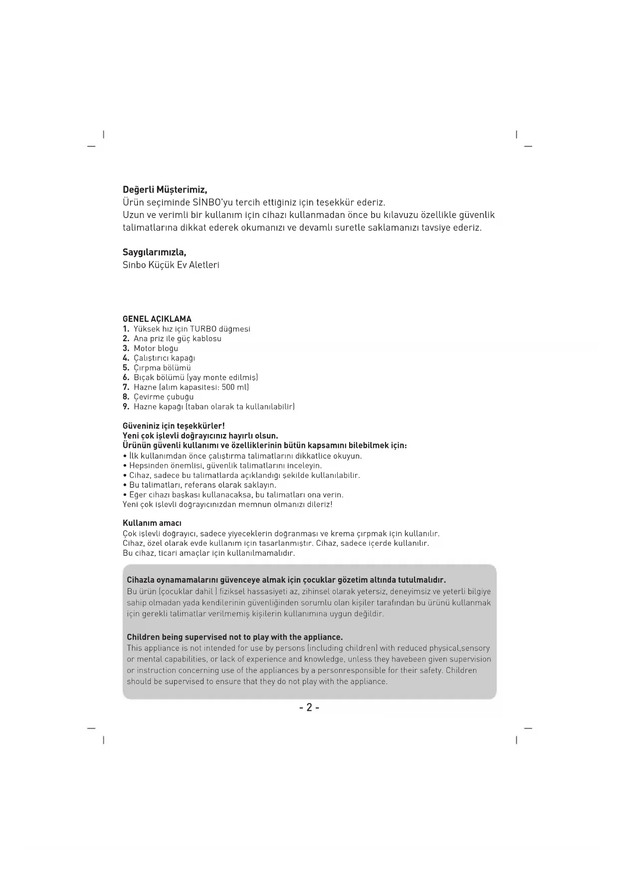 Cok islevi dograyici, sadece ylyeceklerin dokranmasi ve krema cirpmak icin kullanilir. Cihaz, ozel olarak evde kullanim icin tasarlanmistir. Cihaz, sadece icerde kullanilir. Bu cihaz, ticari amaclar icin kullanilmamaldir.
