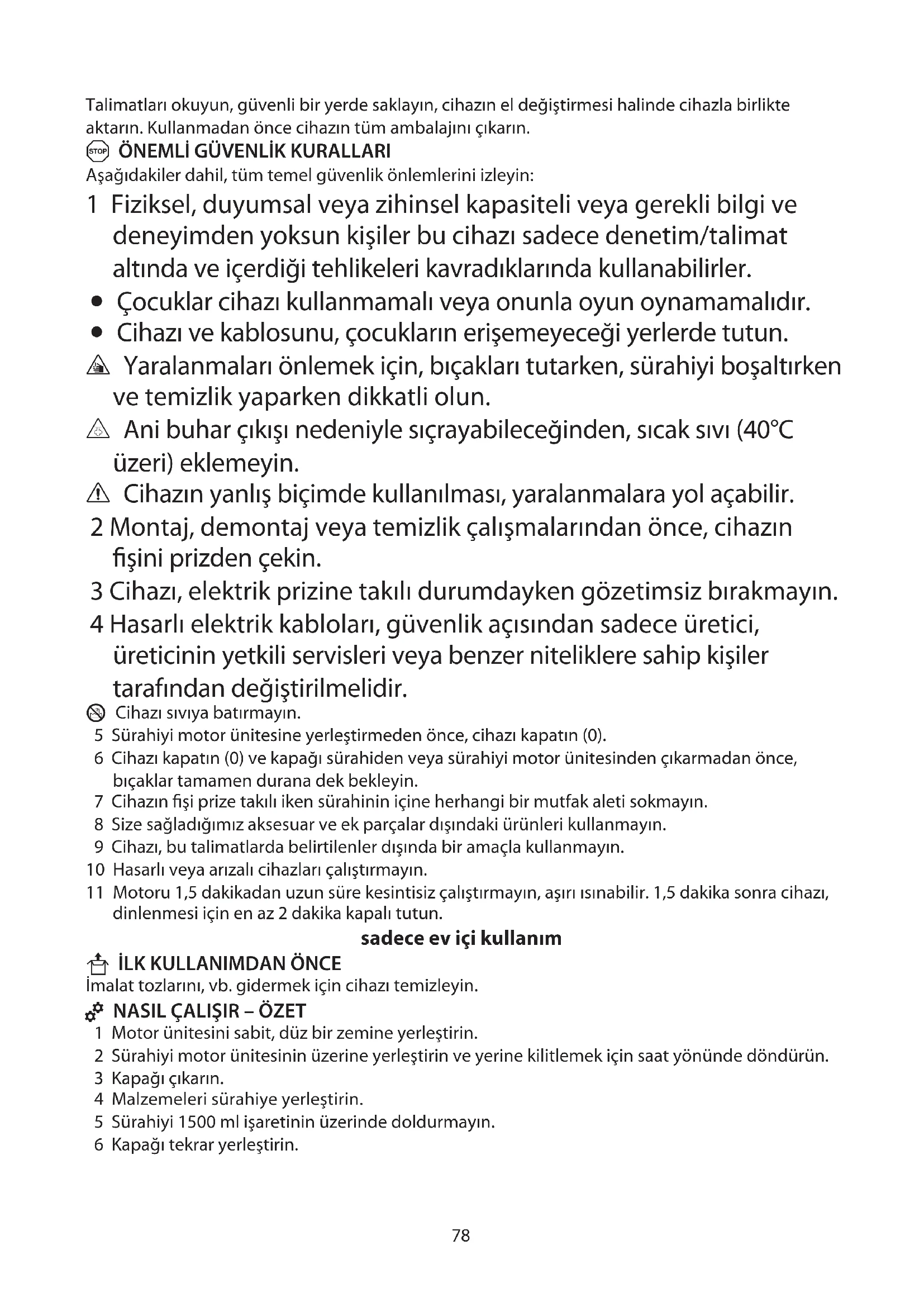 7 Cihazin fisi prize takili iken surahinin icine herhangi bir mutfak aleti sukmayin.