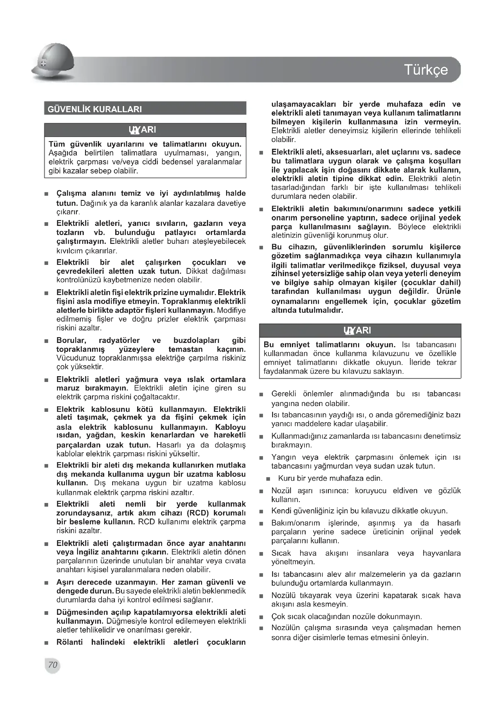 ■ Isi tabancasini kullanirken bol kiyafet vya takigiymeyin/takmayin, kaymaz bir ayakkabi giyin vesaclarinizin korunmasi icin bir bone takin.