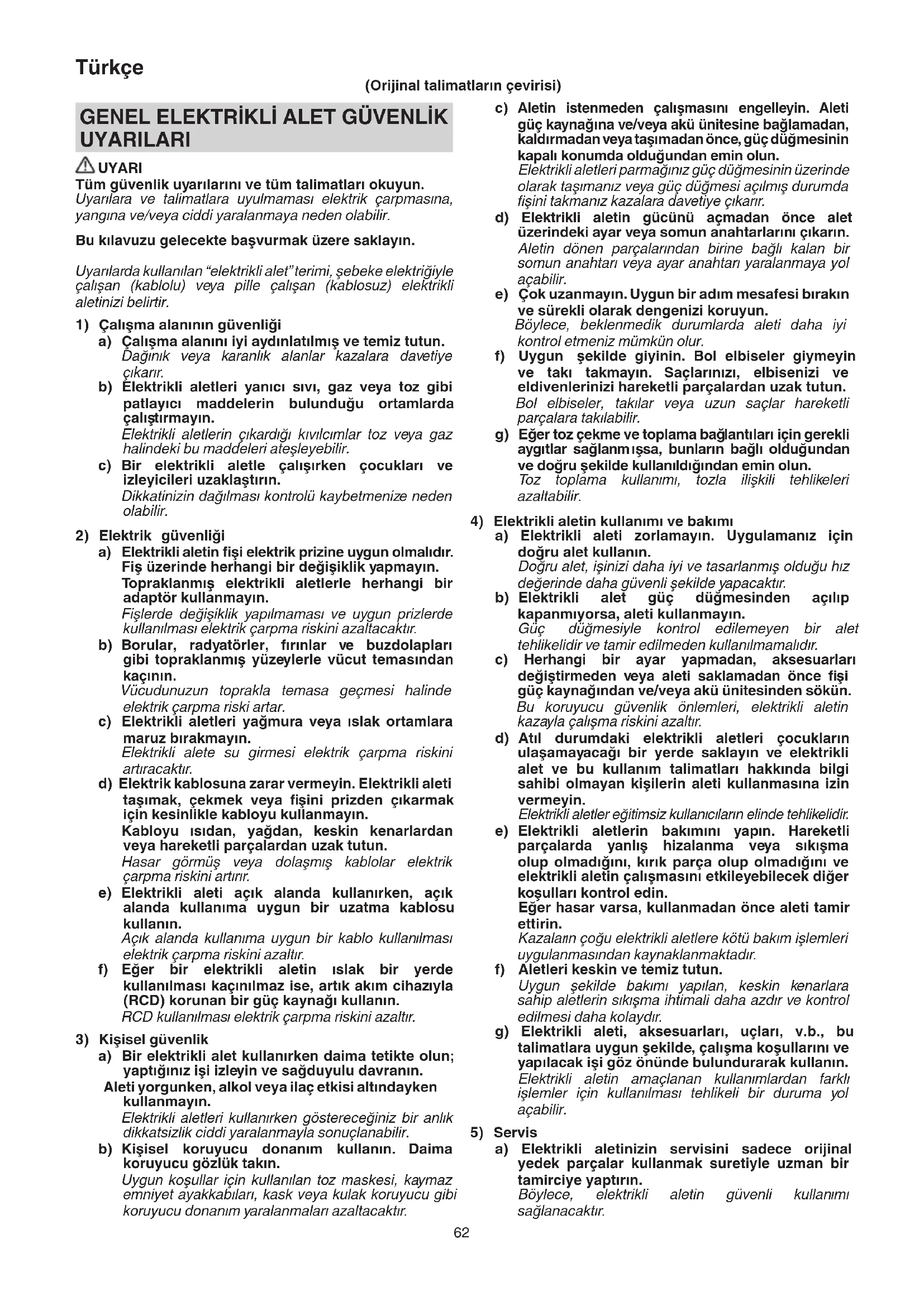 a) Elektrikli aletinizin servisini sadece orijinal yedek parçalar kullanmak suretiyle uzman bir tamirciye yaptırın. Böylece, elektrikli aletin güvenli kullanımı sağlanacaktır. GENEL ELEKTRİKLİ ALET GÜVENLİK UYARILARI UYARI Tüm güvenlik uyarılarını ve tüm talimatları okuyun. Uyarılara ve talimatlara uyulmaması elektrik çarpmasına, yangına ve/veya ciddi yaralanmaya neden olabilir. Bu kılavuzu gelecekte başvurmak üzere saklayın. Uyarılarda kullanılan “elektrikli alet” terimi, şebeke elektriğiyle çalışan (kablolu) veya pille çalışan (kablosuz) elektrikli aletinizi belirtir.