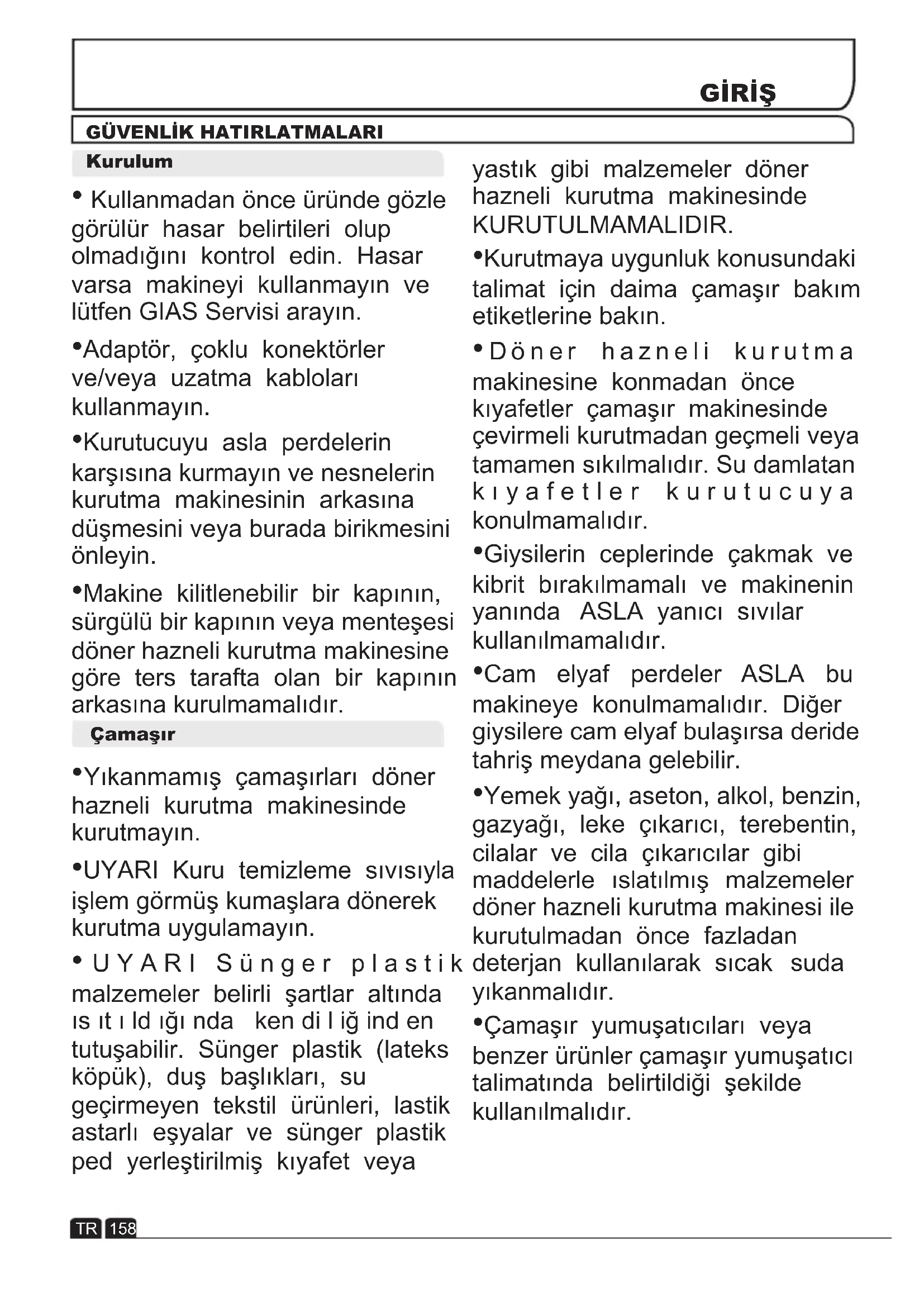 ⚠️ UYARII Döner hazneli kurutma makinesi çalışır durumdayken hazne ve kapak ÇOK SICAK olabilir. Tüm çamaşırlar isinin dağılması için hızica çıkarılıp serilmeksizin, kurutma evresi bitmeden önce döner hazneli kurutma makinesini asla durdurmayın.