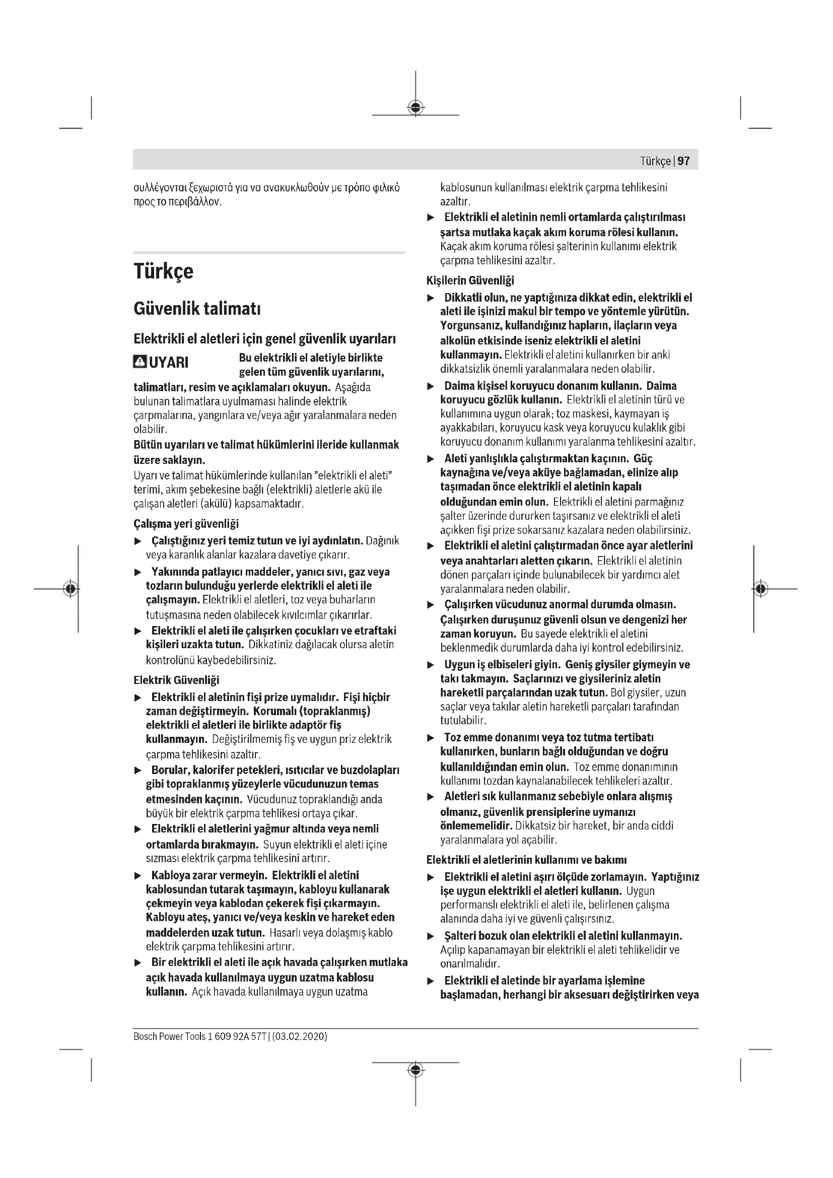 Οι ηλεκτρικές συσκευές, οι επαναφορτιζόμενες μπαταρίες/ μπαταρίες, τα εξαρτήματα και οι συσκευασίες πρέπει να ανακυκλώνονται με τρόπο φιλικό προς το περιβάλλον. Μην ρίχνετε τις ηλεκτρικές συσκευές και τις επαναφορτιζόμενες μπαταρίες/μπαταρίες στα οικιακά απορρίμματα! Μόνο για χώρες τηςΕΕ: Σύμφωνα με την Ευρωπαϊκή οδηγία 2012/19/ΕΕ οι άχρηστες ηλεκτρικές συσκευές και σύμφωνα με την Ευρωπαϊκή οδηγία 2006/66/ΕΚ οι χαλασμένες ή χρησιμοποιημένες επαναφορτιζόμενες μπαταρίες/μπαταρίες πρέπει να 1 609 92A 57T | (03.02.2020) Bosch Power ToolsTürkçe | 97 συλλέγονται ξεχωριστά για να ανακυκλωθούν με τρόπο φιλικό προς το περιβάλλον. Türkçe Güvenlik talimatı Elektrikli el aletleri için genel güvenlik uyarıları UYARI Bu elektrikli el aletiyle birlikte gelen tüm güvenlik uyarılarını, talimatları, resim ve açıklamaları okuyun. Aşağıda bulunan talimatlara uyulmaması halinde elektrik çarpmalarına, yangınlara ve/veya ağır yaralanmalara neden olabilir. Bütün uyarıları ve talimat hükümlerini ileride kullanmak üzere saklayın. Uyarı ve talimat hükümlerinde kullanılan "elektrikli el aleti" terimi, akım şebekesine bağlı (elektrikli) aletlerle akü ile çalışan aletleri (akülü) kapsamaktadır. Çalışma yeri güvenliği u Çalıştığınız yeri temiz tutun ve iyi aydınlatın. Dağınık veya karanlık alanlar kazalara davetiye çıkarır. u Yakınında patlayıcı maddeler, yanıcı sıvı, gaz veya tozların bulunduğu yerlerde elektrikli el aleti ile çalışmayın. Elektrikli el aletleri, toz veya buharların tutuşmasına neden olabilecek kıvılcımlar çıkarırlar. u Elektrikli el aleti ile çalışırken çocukları ve etraftaki kişileri uzakta tutun. Dikkatiniz dağılacak olursa aletin kontrolünü kaybedebilirsiniz. Elektrik Güvenliği u Elektrikli el aletinin fişi prize uymalıdır. Fişi hiçbir zaman değiştirmeyin. Korumalı (topraklanmış) elektrikli el aletleri ile birlikte adaptör fiş kullanmayın. Değiştirilmemiş fiş ve uygun priz elektrik çarpma tehlikesini azaltır. u Borular, kalorifer petekleri, ısıtıcılar ve buzdolapları gibi topraklanmış yüzeylerle vücudunuzun temas etmesinden kaçının. Vücudunuz topraklandığı anda büyük bir elektrik çarpma tehlikesi ortaya çıkar. u Elektrikli el aletlerini yağmur altında veya nemli ortamlarda bırakmayın. Suyun elektrikli el aleti içine sızması elektrik çarpma tehlikesini artırır. u Kabloya zarar vermeyin. Elektrikli el aletini kablosundan tutarak taşımayın, kabloyu kullanarak çekmeyin veya kablodan çekerek fişi çıkarmayın. Kabloyu ateş, yanıcı ve/veya keskin ve hareket eden maddelerden uzak tutun. Hasarlı veya dolaşmış kablo elektrik çarpma tehlikesini artırır. u Bir elektrikli el aleti ile açık havada çalışırken mutlaka açık havada kullanılmaya uygun uzatma kablosu kullanın. Açık havada kullanılmaya uygun uzatma kablosunun kullanılması elektrik çarpma tehlikesini azaltır. u Elektrikli el aletinin nemli ortamlarda çalıştırılması şartsa mutlaka kaçak akım koruma rölesi kullanın. Kaçak akım koruma rölesi şalterinin kullanımı elektrik çarpma tehlikesini azaltır. Kişilerin Güvenliği u Dikkatli olun, ne yaptığınıza dikkat edin, elektrikli el aleti ile işinizi makul bir tempo ve yöntemle yürütün. Yorgunsanız, kullandığınız hapların, ilaçların veya alkolün etkisinde iseniz elektrikli el aletini kullanmayın. Elektrikli el aletini kullanırken bir anki dikkatsizlik önemli yaralanmalara neden olabilir. u Daima kişisel koruyucu donanım kullanın. Daima koruyucu gözlük kullanın. Elektrikli el aletinin türü ve kullanımına uygun olarak; toz maskesi, kaymayan iş ayakkabıları, koruyucu kask veya koruyucu kulaklık gibi koruyucu donanım kullanımı yaralanma tehlikesini azaltır. u Aleti yanlışlıkla çalıştırmaktan kaçının. Güç kaynağına ve/veya aküye bağlamadan, elinize alıp taşımadan önce elektrikli el aletinin kapalı olduğundan emin olun. Elektrikli el aletini parmağınız şalter üzerinde dururken taşırsanız ve elektrikli el aleti açıkken fişi prize sokarsanız kazalara neden olabilirsiniz. u Elektrikli el aletini çalıştırmadan önce ayar aletlerini veya anahtarları aletten çıkarın. Elektrikli el aletinin dönen parçaları içinde bulunabilecek bir yardımcı alet yaralanmalara neden olabilir. u Çalışırken vücudunuz anormal durumda olmasın. Çalışırken duruşunuz güvenli olsun ve dengenizi her zaman koruyun. Bu sayede elektrikli el aletini beklenmedik durumlarda daha iyi kontrol edebilirsiniz. u Uygun iş elbiseleri giyin. Geniş giysiler giymeyin ve takı takmayın. Saçlarınızı ve giysileriniz aletin hareketli parçalarından uzak tutun. Bol giysiler, uzun saçlar veya takılar aletin hareketli parçaları tarafından tutulabilir. u Toz emme donanımı veya toz tutma tertibatı kullanırken, bunların bağlı olduğundan ve doğru kullanıldığından emin olun. Toz emme donanımının kullanımı tozdan kaynalanabilecek tehlikeleri azaltır. u Aletleri sık kullanmanız sebebiyle onlara alışmış olmanız, güvenlik prensiplerine uymanızı önlememelidir. Dikkatsiz bir hareket, bir anda ciddi yaralanmalara yol açabilir. Elektrikli el aletlerinin kullanımı ve bakımı u Elektrikli el aletini aşırı ölçüde zorlamayın. Yaptığınız işe uygun elektrikli el aletleri kullanın. Uygun performanslı elektrikli el aleti ile, belirlenen çalışma alanında daha i