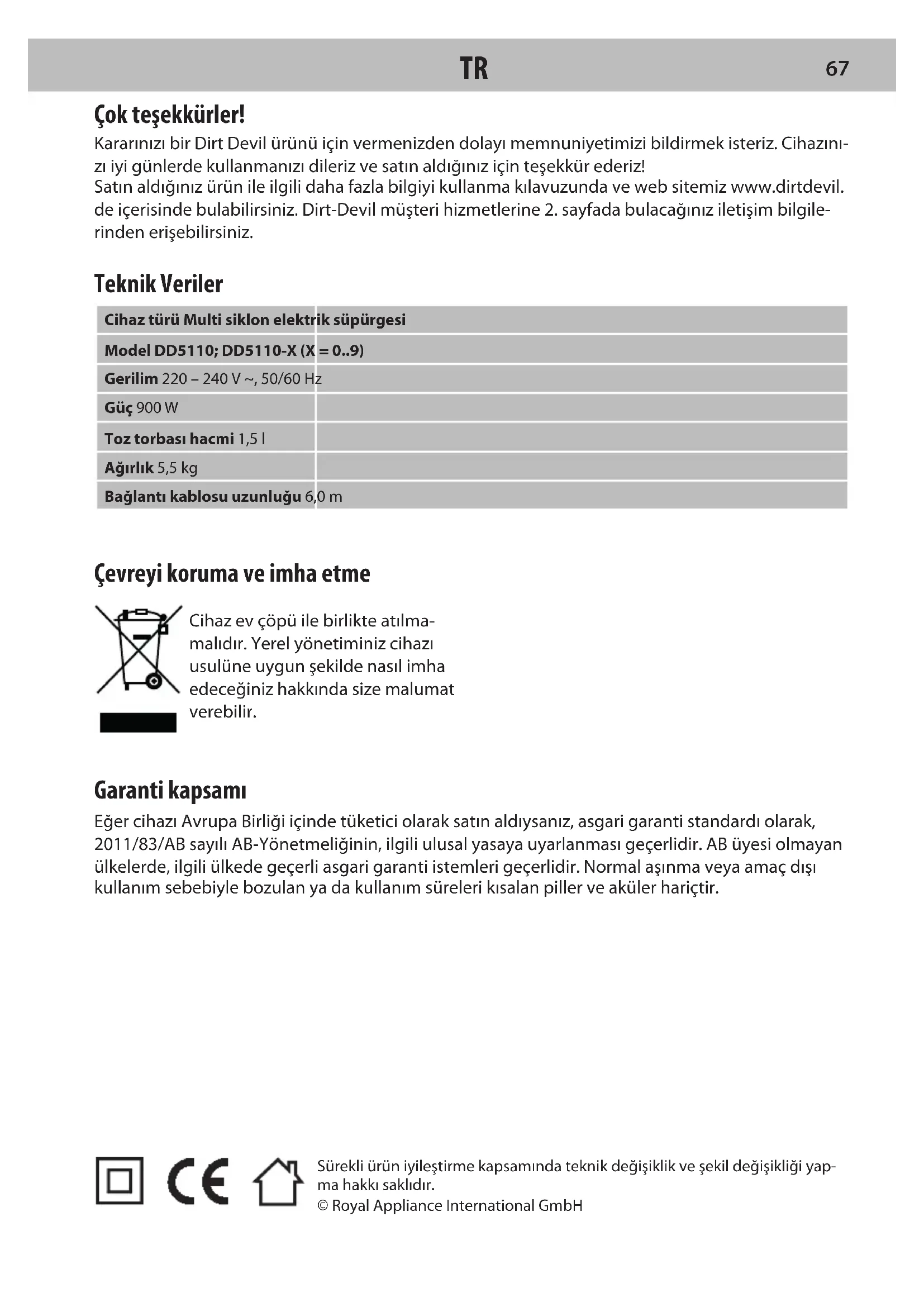 HUSürekli ürün iyileştirme kapsamında teknik değişiklik ve şekil değişikliği yap- ma hakkı saklıdır. © Royal Appliance International GmbH Çok teşekkürler! Kararınızı bir Dirt Devil ürünü için vermenizden dolayı memnuniyetimizi bildirmek isteriz. Cihazını- zı iyi günlerde kullanmanızı dileriz ve satın aldığınız için teşekkür ederiz! Satın aldığınız ürün ile ilgili daha fazla bilgiyi kullanma kılavuzunda ve web sitemiz www.dirtdevil. de içerisinde bulabilirsiniz. Dirt-Devil müşteri hizmetlerine 2. sayfada bulacağınız iletişim bilgile- rinden erişebilirsiniz. Teknik Veriler Cihaz türü Multi siklon elektrik süpürgesi Model DD5110; DD5110-X (X = 0..9) Gerilim 220 – 240 V ~, 50/60 Hz Güç 900 W Toz torbası hacmi 1,5 l Ağırlık 5,5 kg Bağlantı kablosu uzunluğu 6,0 m Çevreyi koruma ve imha etme Cihaz ev çöpü ile birlikte atılma- malıdır. Yerel yönetiminiz cihazı usulüne uygun şekilde nasıl imha edeceğiniz hakkında size malumat verebilir. Garanti kapsamı Eğer cihazı Avrupa Birliği içinde tüketici olarak satın aldıysanız, asgari garanti standardı olarak, 2011/83/AB sayılı AB-Yönetmeliğinin, ilgili ulusal yasaya uyarlanması geçerlidir. AB üyesi olmayan ülkelerde, ilgili ülkede geçerli asgari garanti istemleri geçerlidir. Normal aşınma veya amaç dışı kullanım sebebiyle bozulan ya da kullanım süreleri kısalan piller ve aküler hariçtir.