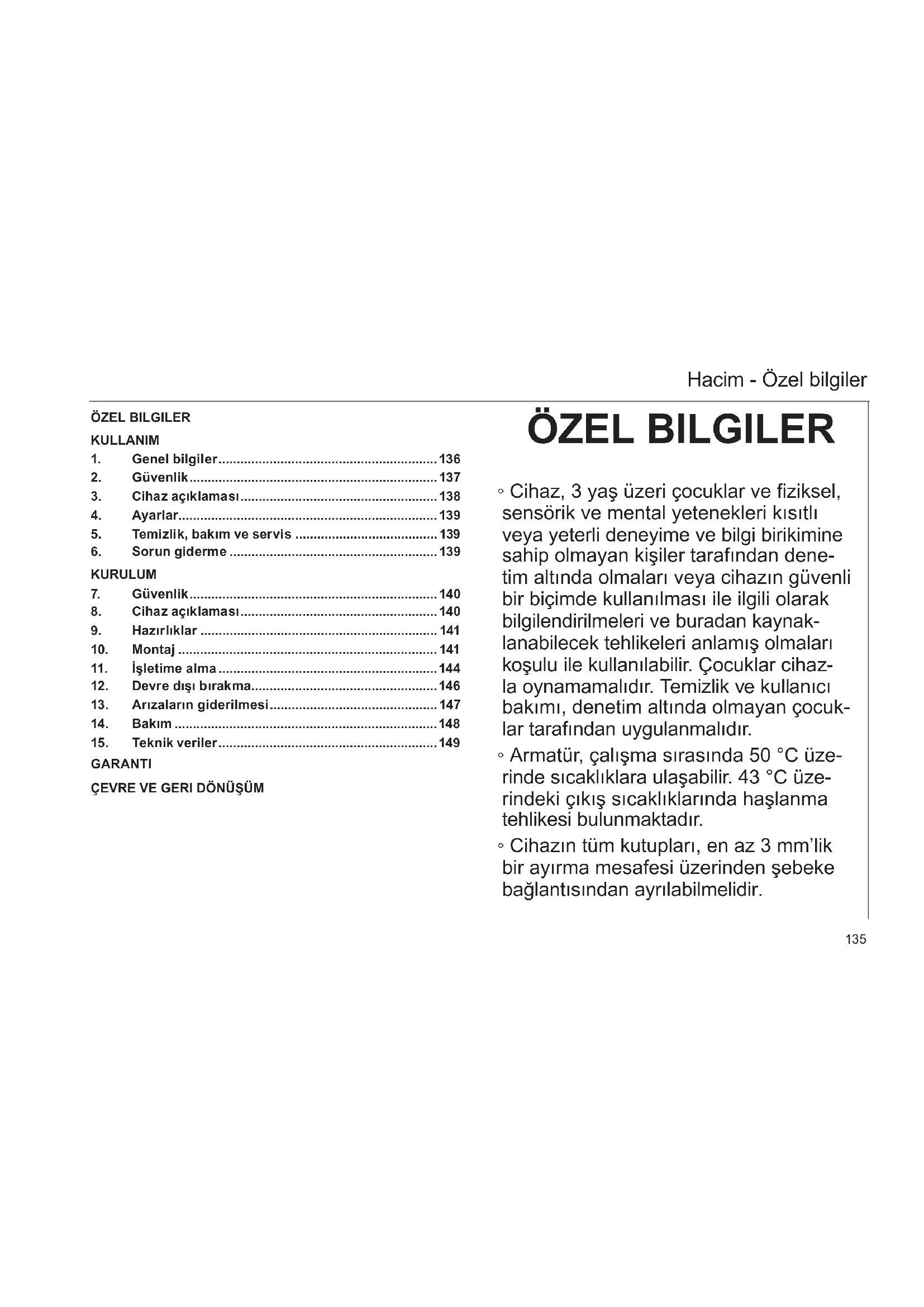 5. Temizlik, bakım ve servis .......................................139