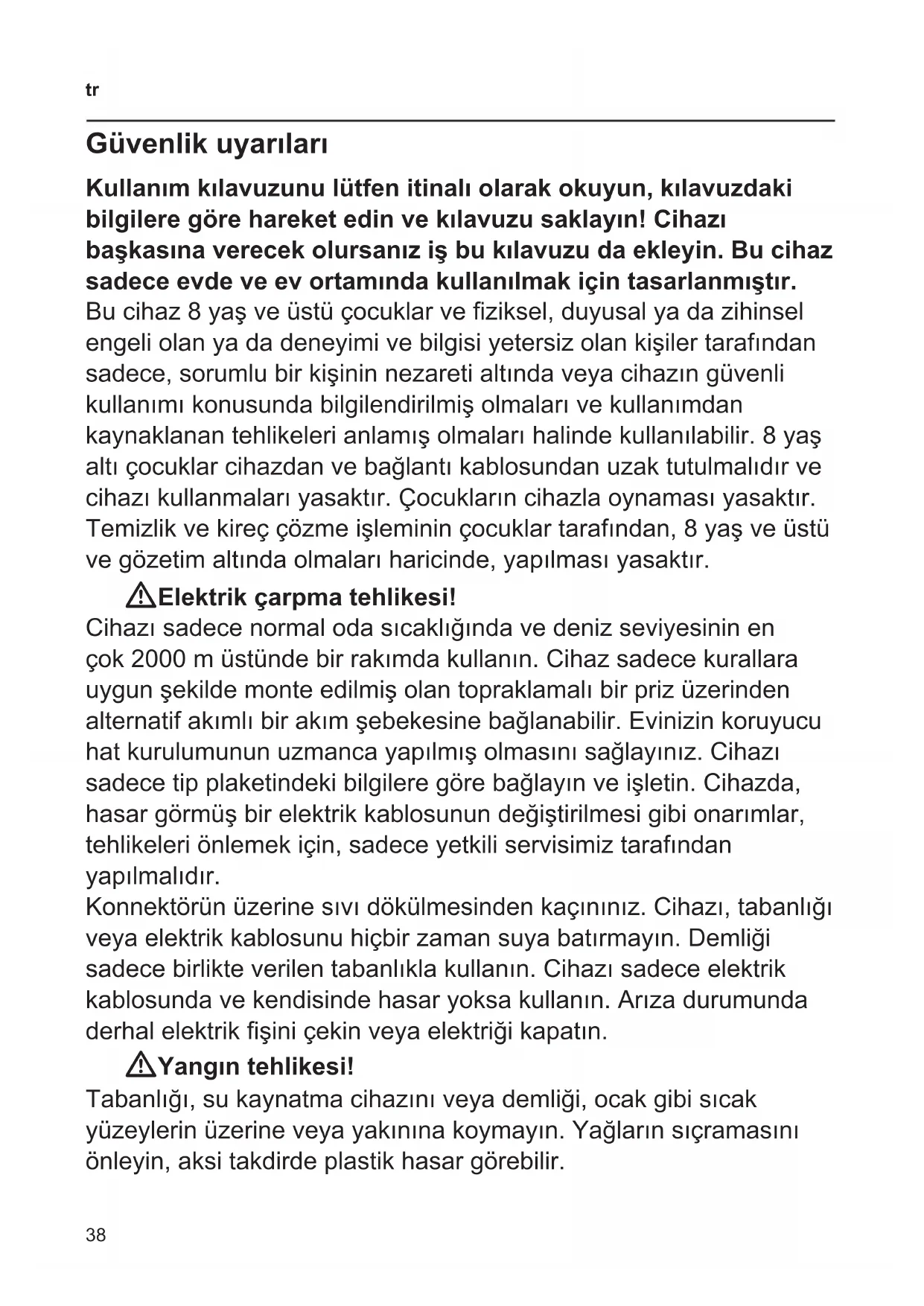Güvenlik uyarıları Kullanım kılavuzunu lütfen itinalı olarak okuyun, kılavuzdaki bilgilere göre hareket edin ve kılavuzu saklayın! Cihazı başkasına verecek olursanız iş bu kılavuzu da ekleyin. Bu cihaz sadece evde ve ev ortamında kullanılmak için tasarlanmıştır. Bu cihaz 8 yaş ve üstü çocuklar ve fiziksel, duyusal ya da zihinsel engeli olan ya da deneyimi ve bilgisi yetersiz olan kişiler tarafından sadece, sorumlu bir kişinin nezareti altında veya cihazın güvenli kullanımı konusunda bilgilendirilmiş olmaları ve kullanımdan kaynaklanan tehlikeleri anlamış olmaları halinde kullanılabilir. 8 yaş altı çocuklar cihazdan ve bağlantı kablosundan uzak tutulmalıdır ve cihazı kullanmaları yasaktır. Çocukların cihazla oynaması yasaktır. Temizlik ve kireç çözme işleminin çocuklar tarafından, 8 yaş ve üstü ve gözetim altında olmaları haricinde, yapılması yasaktır. WElektrik çarpma tehlikesi! Cihazı sadece normal oda sıcaklığında ve deniz seviyesinin en çok 2000 m üstünde bir rakımda kullanın. Cihaz sadece kurallara uygun şekilde monte edilmiş olan topraklamalı bir priz üzerinden alternatif akımlı bir akım şebekesine bağlanabilir. Evinizin koruyucu hat kurulumunun uzmanca yapılmış olmasını sağlayınız. Cihazı sadece tip plaketindeki bilgilere göre bağlayın ve işletin. Cihazda, hasar görmüş bir elektrik kablosunun değiştirilmesi gibi onarımlar, tehlikeleri önlemek için, sadece yetkili servisimiz tarafından yapılmalıdır. Konnektörün üzerine sıvı dökülmesinden kaçınınız. Cihazı, tabanlığı veya elektrik kablosunu hiçbir zaman suya batırmayın. Demliği sadece birlikte verilen tabanlıkla kullanın. Cihazı sadece elektrik kablosunda ve kendisinde hasar yoksa kullanın. Arıza durumunda derhal elektrik fişini çekin veya elektriği kapatın. WYangın tehlikesi! Tabanlığı, su kaynatma cihazını veya demliği, ocak gibi sıcak yüzeylerin üzerine veya yakınına koymayın. Yağların sıçramasını önleyin, aksi takdirde plastik hasar görebilir.39