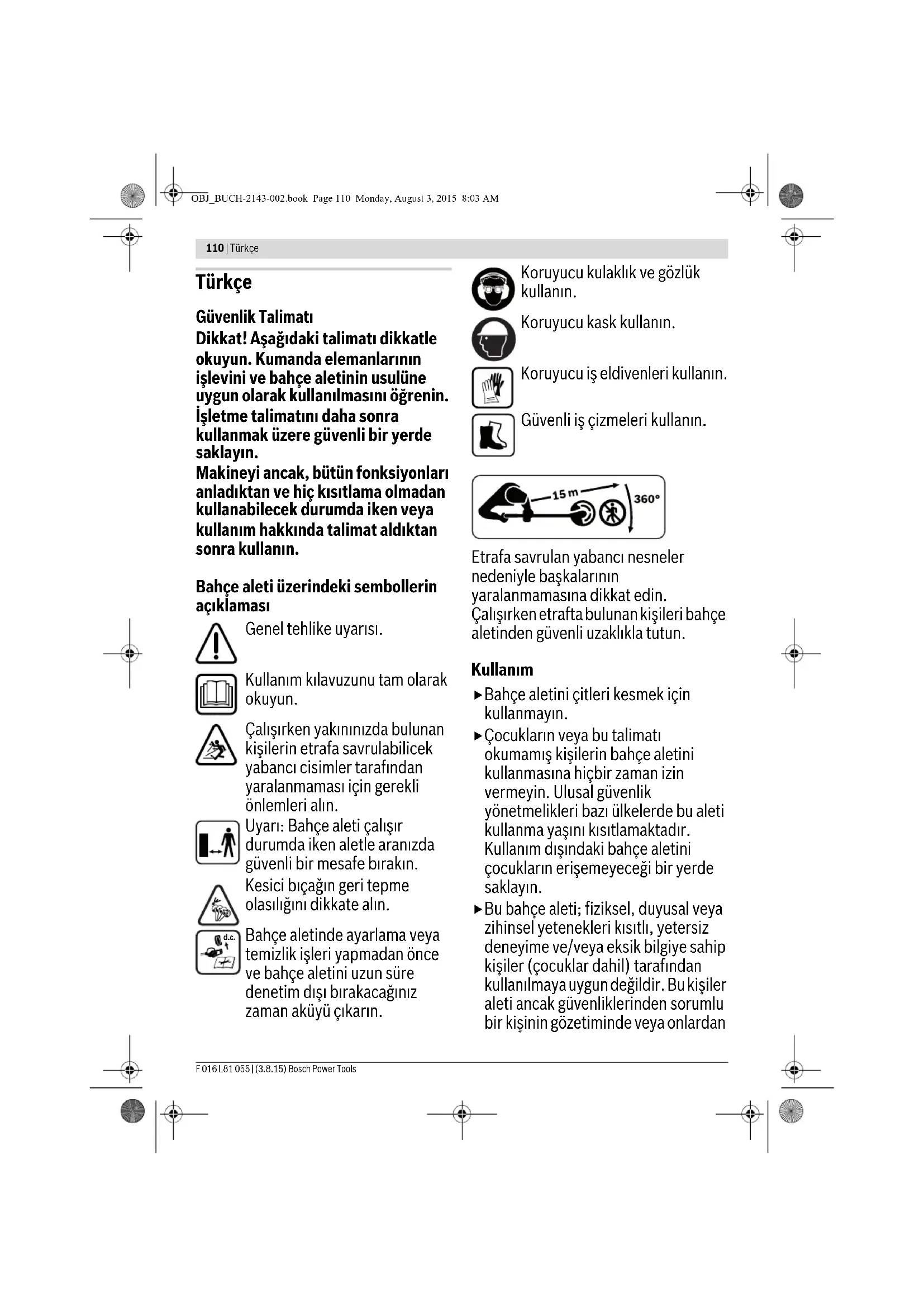 Μην ρίξετε τα μηχανήματα κήπου, τους φορτιστές και τις μπαταρίες στα απορρίμματα του σπιτιού σας! Μόνο για χώρες της ΕΕ: Κατά την Ευρωπαϊκή οδηγία 2012/19/EΕ οι άχρηστες ηλεκτρικές και ηλεκτρονικές συσκευές και κατά την ευρωπαϊκή οδηγία 2006/66/EΚ οι χαλασμένες ή άχρηστες μπαταρίες πρέπει να αφαιρούνται από τη συσκευή και να αποσύρονται ξεχωριστά. Μηχανικά χαλασμένες ή μη στεγανές μπαταρίες πρέπει να αποσύρονται με τρόπο φιλικό προς το περιβάλλον, σύμφωνα με τις εκάστοτε τοπικές διατάξεις. Μπαταρίες/Επαναφορτιζόμενες μπαταρίες: Μπαταρίες ιόντων λιθίου: Παρακαλούμε δώστε προσοχή στο κεφάλαιο «Μεταφορά». Τηρούμε το δικαίωμα αλλαγών. Άσχημη απόδοση κοπής Λερωμένος προφυλακτήρας Καθαρίστε το εσωτερικό του προφυλακτήρα Αμβλύς δίσκος κοπής Γυρίστε/Αλλάξτε δίσκο κοπής Κοντή μεσηνέζα Πατήστε την κεφαλή της μεσηνέζας στο έδαφος και περάστε πάλι τη μεσηνέζα Λείπει η μεσηνέζα Τοποθετήστε μεσηνέζα (βλέπε εικόνα 7 στις σελίδες με τα γραφικά) Κακή απόδοση κινητήρα Αφαιρέστε το εργαλείο κοπής μαζί με τον περιστρεφόμενο δίσκο και καθαρίστε το αυλάκι στον περιστρεφόμενο δίσκο Συμπτώματα Πιθανή αιτία Θεραπεία OBJ_BUCH-2143-002.book Page 109 Monday, August 3, 2015 8:03 AM110 | Türkçe F 016 L81 055 | (3.8.15) Bosch Power Tools Türkçe Güvenlik Talimatı Dikkat! Aşağıdaki talimatı dikkatle okuyun. Kumanda elemanlarının işlevini ve bahçe aletinin usulüne uygun olarak kullanılmasını öğrenin. İşletme talimatını daha sonra kullanmak üzere güvenli bir yerde saklayın. Makineyi ancak, bütün fonksiyonları anladıktan ve hiç kısıtlama olmadan kullanabilecek durumda iken veya kullanım hakkında talimat aldıktan sonra kullanın. Bahçe aleti üzerindeki sembollerin açıklaması Genel tehlike uyarısı. Kullanım kılavuzunu tam olarak okuyun. Çalışırken yakınınızda bulunan kişilerin etrafa savrulabilicek yabancı cisimler tarafından yaralanmaması için gerekli önlemleri alın. Uyarı: Bahçe aleti çalışır durumda iken aletle aranızda güvenli bir mesafe bırakın. Kesici bıçağın geri tepme olasılığını dikkate alın. Bahçe aletinde ayarlama veya temizlik işleri yapmadan önce ve bahçe aletini uzun süre denetim dışı bırakacağınız zaman aküyü çıkarın. Koruyucu kulaklık ve gözlük kullanın. Koruyucu kask kullanın. Koruyucu iş eldivenleri kullanın. Güvenli iş çizmeleri kullanın. Etrafa savrulan yabancı nesneler nedeniyle başkalarının yaralanmamasına dikkat edin. Çalışırken etrafta bulunan kişileri bahçe aletinden güvenli uzaklıkla tutun. Kullanım Bahçe aletini çitleri kesmek için kullanmayın. Çocukların veya bu talimatı okumamış kişilerin bahçe aletini kullanmasına hiçbir zaman izin vermeyin. Ulusal güvenlik yönetmelikleri bazı ülkelerde bu aleti kullanma yaşını kısıtlamaktadır. Kullanım dışındaki bahçe aletini çocukların erişemeyeceği bir yerde saklayın. Bu bahçe aleti; fiziksel, duyusal veya zihinsel yetenekleri kısıtlı, yetersiz deneyime ve/veya eksik bilgiye sahip kişiler (çocuklar dahil) tarafından kullanılmaya uygun değildir. Bu kişiler aleti ancak güvenliklerinden sorumlu bir kişinin gözetiminde veya onlardan d.c. OBJ_BUCH-2143-002.book Page 110 Monday, August 3, 2015 8:03 AMTürkçe | 111 Bosch Power Tools F 016 L81 055 | (3.8.15) bahçe aletinin nasıl kullanılacağı hakkında talimat alarak kullanabilirler. Çocukların bahçe aleti ile oynamamasına dikkat edilmelidir. Bahçe aletini özellikle çocukların ve evcil hayvanların çok yakınında kullanmayın. Bu aleti kullananlar başkalarının başına gelebilecek kazalardan veya bunların özel mülkiyetinde bulunan mallarda meydana gelebilecek hasarlardan sorumludur. Bahçe aletini çıplak ayakla veya açık sandaletlerle kullanmayın. Sağlam iş ayakkabıları ve uzun pantolon kullanın. İşleyeceğiniz yüzeyi dikkatli biçimde inceleyin ve taş, dal, tel, kemik ve benzeri yabancı nesneleri temizleyin. Bahçe aletini şebeke bağlantı kablosunun bulunduğu yerlerde kullanmayın. Aleti kullanmaya başlamadan önce her defasında kesici bıçağın, kesici bıçak somununun veya misinalı biçme başının aşınmış veya hasarlı olup olmadığını kontrol edin. Aşınan kesici bıçakları ve kesici bıçak somunlarını balanssızlıktan kaçınmak için her zaman takım halinde değiştirin. Sadece gün ışığında veya iyi aydınlatılmış ortamlarda çalışın. Kötü hava koşullarında, özellikle fırtınalı veya sağanak yağışlı havalarda bahçe aleti ile çalışmayın. Islak çimlerde bahçe aletini özellikle dikkatli kullanın. Bahçe aleti ile çalışırken duruşunuzun güvenli olmasına dikkat edin; sadece yürüyerek çalışın, koşarak değil. Her zaman duruşunuzun güvenli ve dengeli olmasına dikkat edin. Kendinizi fazla zorlamayın. Bahçe aleti ile çalışırken koruyucu kulaklık ve koruyucu gözlük kullanın. Bahçe aletini hiçbir zaman koruyucu donanımlar olmadan, koruyucu donanımlar yanlış takılı veya hasarlı durumda kullanmayın. Her kullanımdan önce v