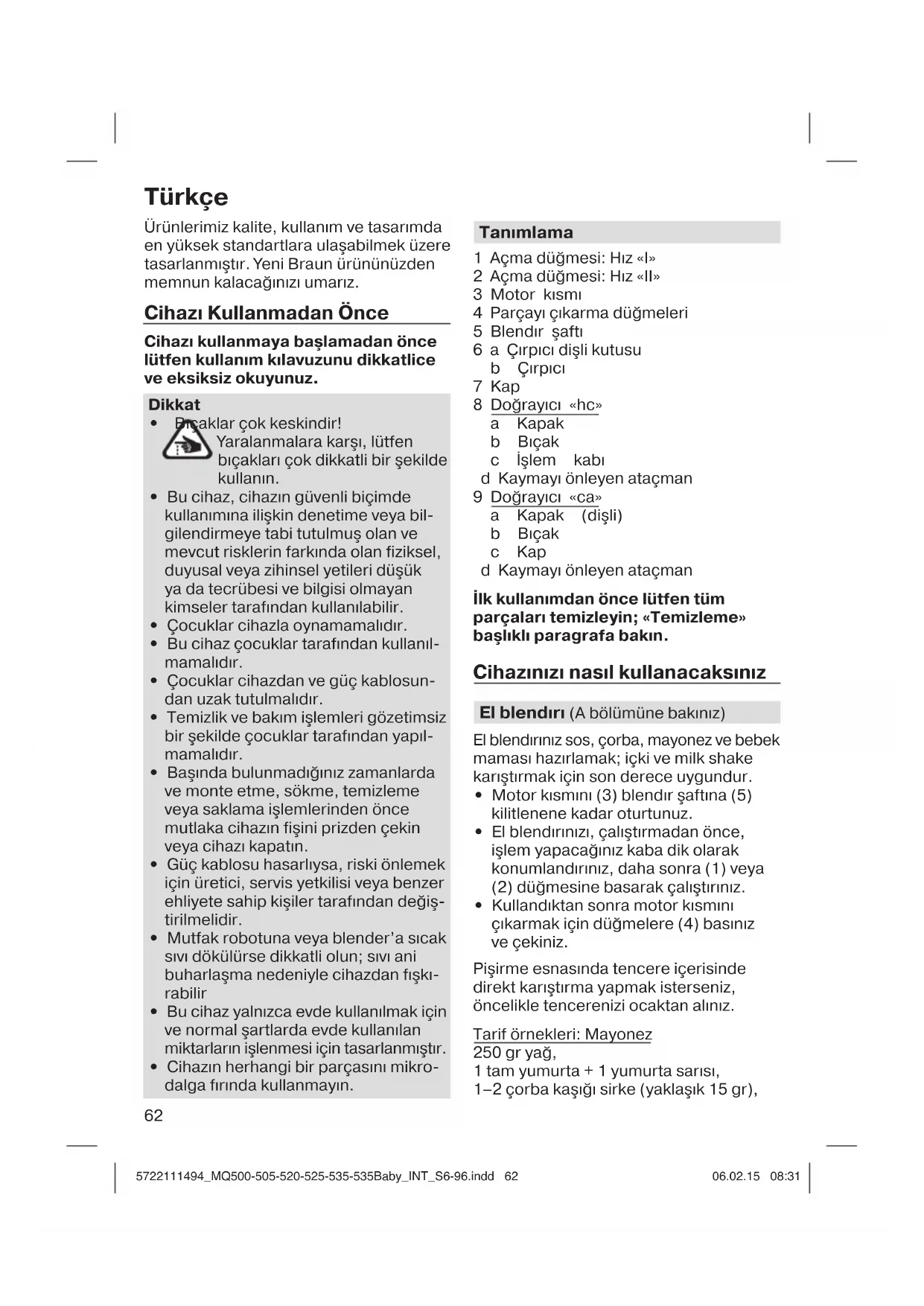 - Kullandıktan sonra motor kısmını çıkarmak için düğmelere (4) basınız ve çekiniz. Pişirme esnasında tencere içerisinde direkt karıştırma yapmak isterseniz, öncelikle tencerenizi ocaktan alınız. Tarif örnekleri: Mayonez 250 gr yağ, 1 tam yumurta + 1 yumurta sarısı, 1–2 çorba kaşığı sirke (yaklaşık 15 gr), Türkçe 5722111494_MQ500-505-520-525-535-535Baby_INT_S6-96.indd 625722111494_MQ500-505-520-525-535-535Baby_INT_S6-96.indd 62 06.02.15 08:3106.02.15 08:3163 Tadına göre tuz ve karabiber Yukarıda miktarları verilen tüm malzemeleri, (oda sıcaklığında) sırasıyla işlem kabına koyunuz. El blendırınızı ölçüm kabının tabanına yerleştiriniz. El blendırınızı, en hızlı ayarda, yağ tam olarak karışana kadar bu pozisyonda çalıştırınız. Daha sonra şaftı çalışır pozisyonda yavaşça yukarıya ve sonra yağın kalan kısmını da içine alması için tekrar aşağıya doğru hareket ettiriniz. İşlem süresi: Salata için 1 dakika, (sos gibi) daha katı karışımlar için 2 dakikaya kadar varabilir. Çırpıcınızı nasıl çalıştıracaksınız (A Bölümüne bakınız) Çırpıcınızı sadece krema, yumurta çırp- mak, kek hamuru ve hazır tatlıları karıştır- mak için kullanınız.