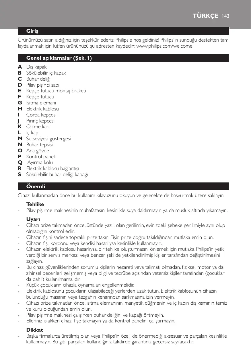 Danger -- Ne plongez jamais le corps du cuiseur à riz dans l’eau et ne le rincez pas sous le robinet. Avertissement -- Avant de brancher l’appareil, vérifiez que la tension indiquée sur l’appareil correspond à la tension secteur locale. -- Branchez l’appareil sur une prise murale mise à la terre. Assurez-vous que la fiche est correctement insérée dans la prise. -- N’utilisez jamais l’appareil si la fiche, le cordon d’alimentation ou l’appareil lui-même est endommagé. -- Si le cordon d’alimentation est endommagé, il doit être remplacé par Philips, un Centre Service Agréé Philips ou un technicien qualifié afin d’éviter tout accident. -- Cet appareil n’est pas destiné à être utilisé par des personnes (notamment des enfants) dont les capacités physiques, sensorielles ou intellectuelles sont réduites, ou par des personnes manquant d’expérience ou de connaissances, à moins que celles-ci ne soient sous surveillance ou qu’elles n’aient reçu des instructions quant à l’utilisation de l’appareil par une personne responsable de leur sécurité. -- Veillez à ce que les enfants ne puissent pas jouer avec l’appareil. -- Maintenez le cordon d’alimentation hors de portée des enfants. Ne le laissez pas dépasser de la table ou du plan de travail sur lequel l’appareil est posé. -- Assurez-vous que l’élément chauffant, l’interrupteur magnétique et l’extérieur de la cuve sont bien propres et secs avant de brancher l’appareil sur la prise secteur.