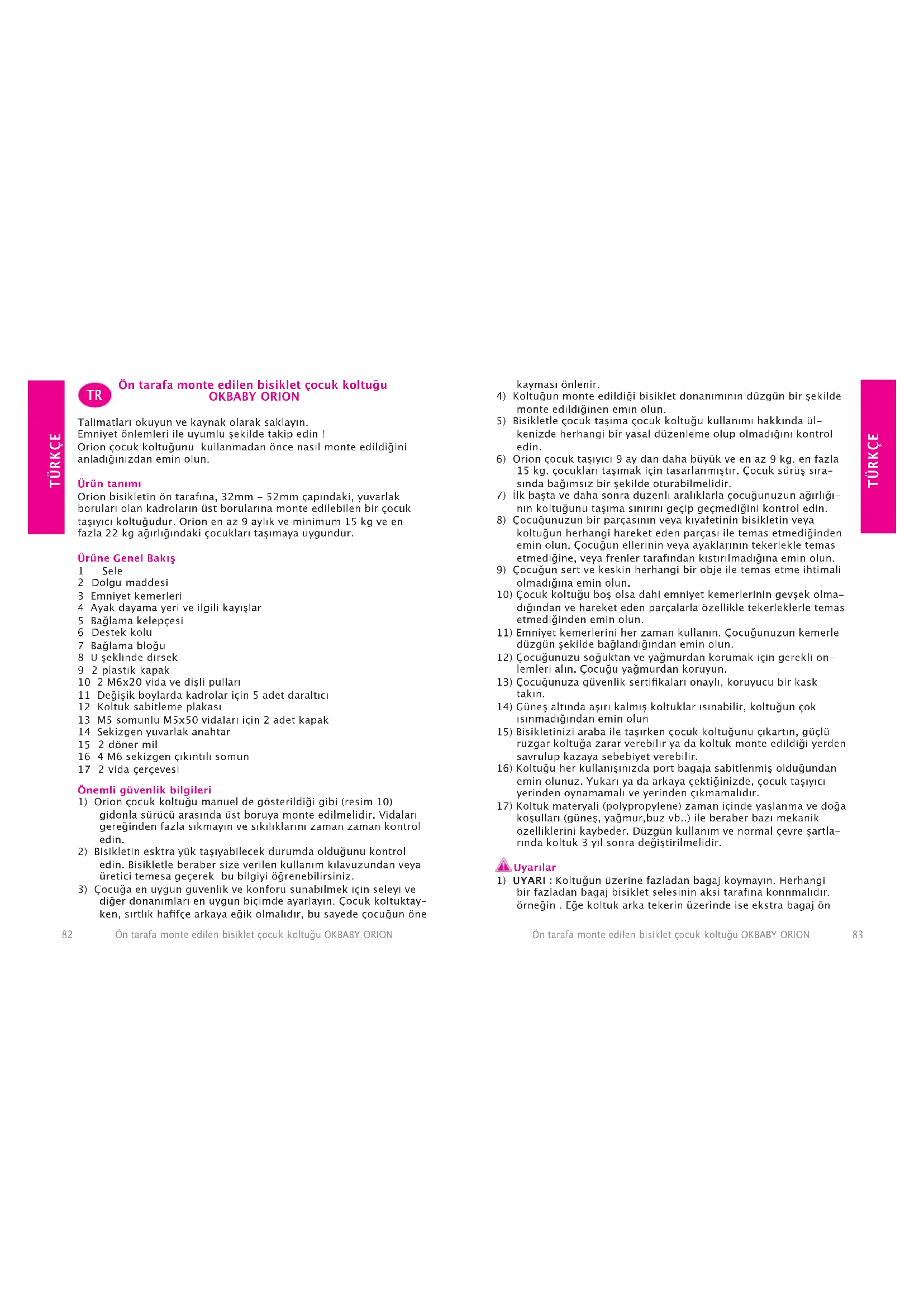 1) Orionoczuk koltuğu manuel de gosterildigi gibi (resim 10) gidonla surucu arasinda ust boruya monte edilmelidir. Vidalari gereigneden fazla sikmayin ve sikliklarini zaman zaman kontrl edin.