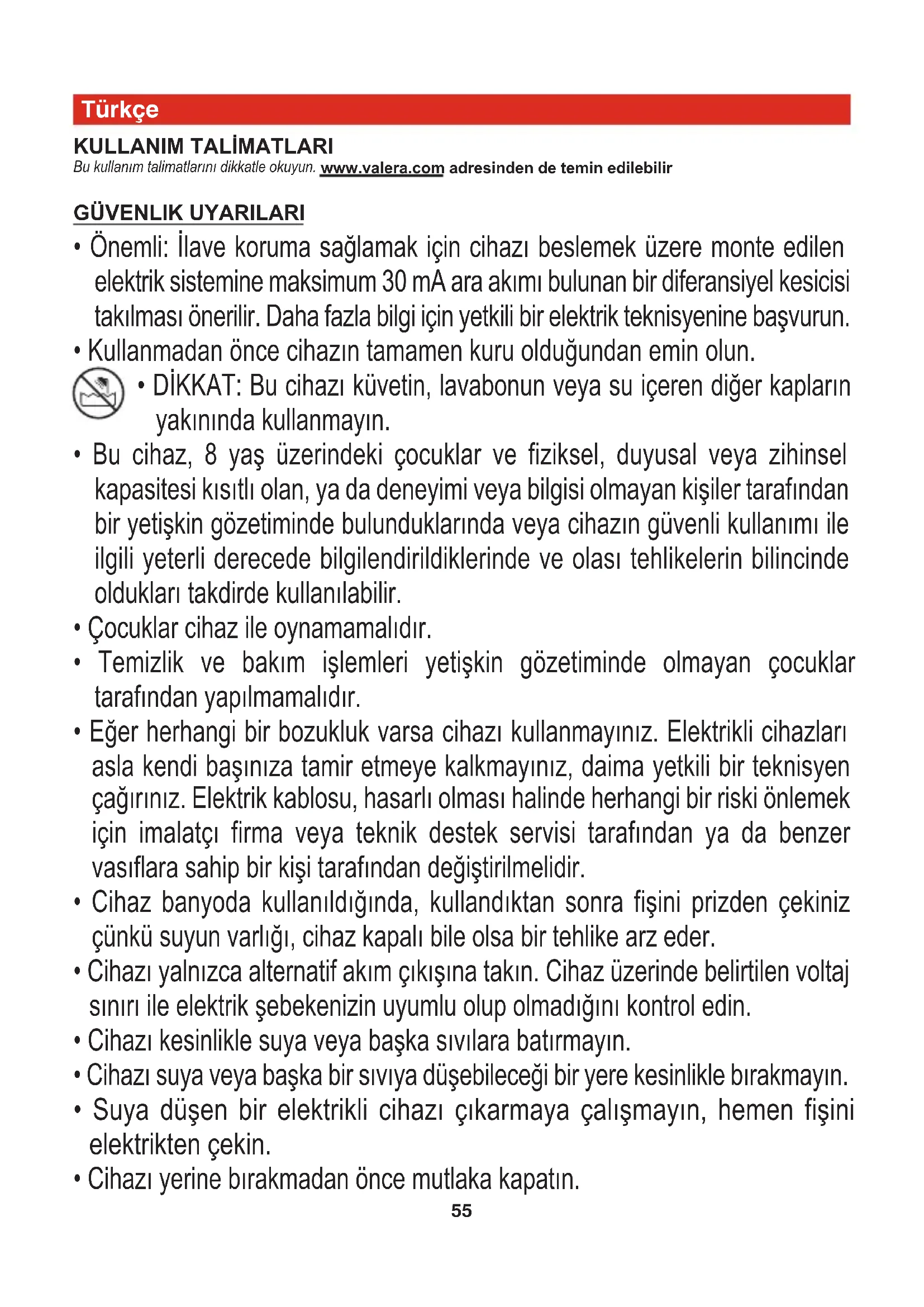 Bu kullanım talimatlarını dikkatle okuyun. www.valera.com adresinden de temin edilebilir