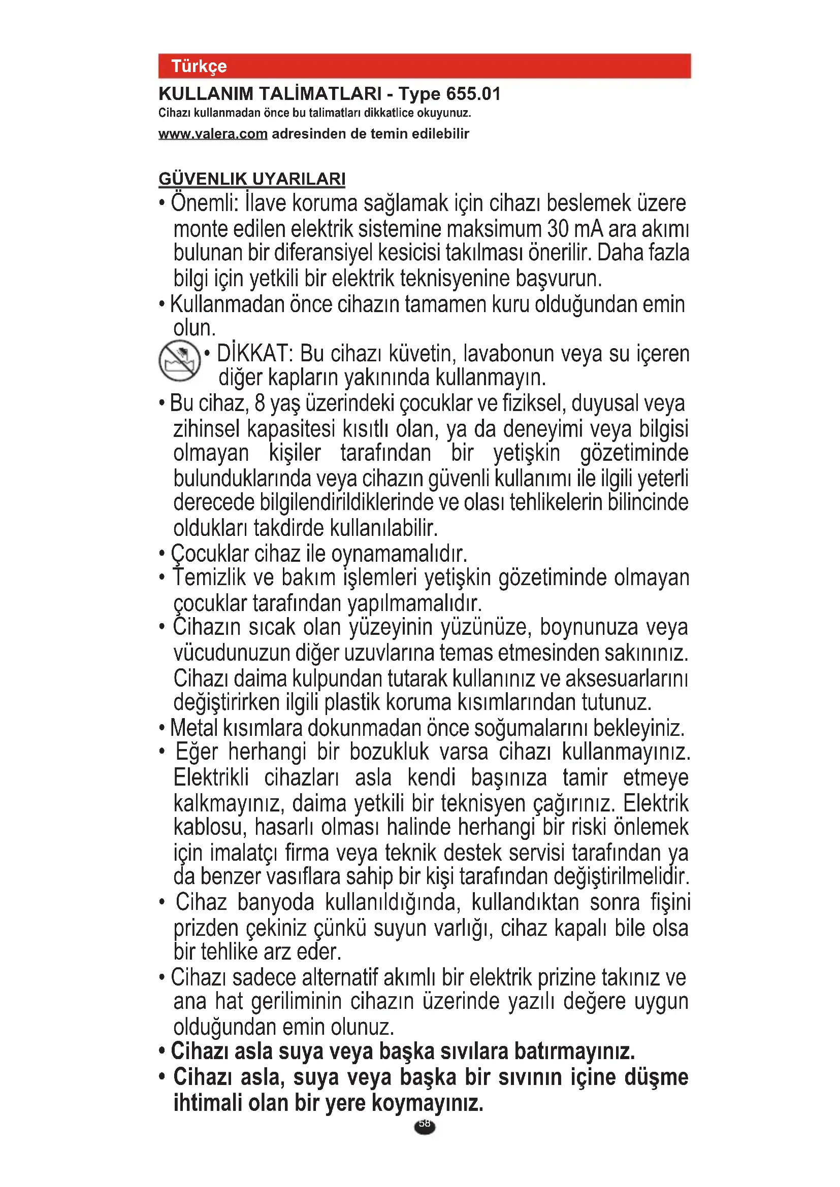 Cihazı temizlemeden önce daima fişini elektrik prizinden çekiniz! Temizlemeye başlamadan önce cihazın soğumasını bekleyiniz. Aksesuarlarınızı nemli bir bez ile silerek temizleyebilirsiniz, ancak asla suya veya başka bir sıvıya daldırmayınız! Bu cihaz 2004/108/CE, 2009/125/CE, 2006/95/CE Avrupa Direktiflerine ve şu düzenlemeye uygundur: (CE) N. 1275/2008. GARANTİ VALERA tarafınızdan alınan cihaz için aşağıdaki koşullarda garanti sağlar: