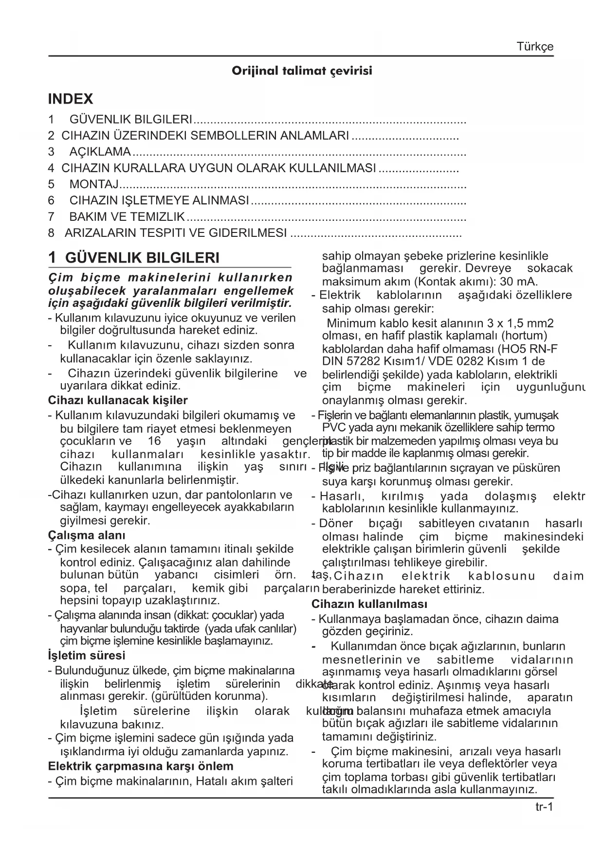 Çim biçme makinelerini kullanırken oluşabilecek yaralanmaları engellemek için aşağıdaki güvenlik bilgileri verilmiştir. -Kullanımkılavuzunuiyiceokuyunuzveverilen bilgilerdoğrultusundahareketediniz. - Kullanımkılavuzunu,cihazısizdensonra kullanacaklariçinözenlesaklayınız. - Cihazınüzerindekigüvenlikbilgilerine ve uyarılaradikkatediniz. Cihazı kullanacak kişiler -Kullanımkılavuzundakibilgileriokumamışve bu bilgilere tam riayet etmesi beklenmeyen çocuklarınve 16 yaşın altındaki gençlerin cihazı kullanmaları kesinlikleyasaktır. Cihazın kullanımına ilişkin yaş sınırı ilgili ülkedekikanunlarlabelirlenmiştir. -Cihazıkullanırkenuzun,darpantolonlarınve sağlam,kaymayıengelleyecekayakkabıların giyilmesi gerekir. Çalışma alanı -Çimkesilecekalanıntamamınıitinalışekilde kontrolediniz.Çalışacağınızalandahilinde bulunanbütün yabancı cisimleri örn. taş, sopa,tel parçaları, kemikgibi parçaların hepsinitopayıpuzaklaştırınız. -Çalışmaalanındainsan(dikkat:çocuklar)yada hayvanlarbulunduğutaktirde(yadaufakcanlılar) çimbiçmeişleminekesinliklebaşlamayınız. İşletim süresi -Bulunduğunuzülkede,çimbiçmemakinalarına ilişkin belirlenmiş işletim sürelerinin dikkate alınmasıgerekir.(gürültüdenkorunma). İşletim sürelerine ilişkin olarak kullanım kılavuzunabakınız. -Çimbiçmeişleminisadecegünışığındayada ışıklandırmaiyiolduğuzamanlardayapınız. Elektrik çarpmasına karşı önlem -Çimbiçmemakinalarının,Hatalıakımşalteri sahipolmayanşebekeprizlerinekesinlikle bağlanmaması gerekir.Devreye sokacak maksimumakım(Kontakakımı):30mA. -Elektrik kablolarının aşağıdakiözelliklere sahipolmasıgerekir: Minimumkablokesitalanının3x1,5mm2 olması,enhafplastikkaplamalı(hortum) kablolardandahahafolmaması(HO5RN-F DIN57282Kısım1/VDE0282Kısım1de belirlendiğişekilde)yadakabloların,elektrikli çim biçme makineleri için uygunluğunun onaylanmışolmasıgerekir. -Fişlerinvebağlantıelemanlarınınplastik,yumuşak PVCyadaaynımekaniközellikleresahiptermo plastikbirmalzemedenyapılmışolmasıveyabu tipbirmaddeilekaplanmışolmasıgerekir. -Fişveprizbağlantılarınınsıçrayanvepüsküren suyakarşıkorunmuşolmasıgerekir. -Hasarlı, kırılmış yada dolaşmış elektrik kablolarınınkesinliklekullanmayınız. -Döner bıçağı sabitleyencıvatanın hasarlı olmasıhalinde çim biçme makinesindeki elektrikleçalışanbirimleringüvenli şekilde çalıştırılmasıtehlikeyegirebilir. - Cihazın elektrik kablosunu daima beraberinizde hareket ettiriniz. Cihazın kullanılması -Kullanmayabaşlamadanönce,cihazındaima gözden geçiriniz. - Kullanımdanöncebıçakağızlarının,bunların mesnetlerininve sabitleme vidalarının aşınmamışveyahasarlıolmadıklarınıgörsel olarakkontrolediniz.Aşınmışveyahasarlı kısımların değiştirilmesihalinde, aparatın doğrubalansınımuhafazaetmekamacıyla bütünbıçakağızlarıilesabitlemevidalarının tamamınıdeğiştiriniz. - Çimbiçmemakinesini,arızalıveyahasarlı korumatertibatlarıileveyadeektörlerveya çimtoplamatorbasıgibigüvenliktertibatları takılıolmadıklarındaaslakullanmayınız. Türkçe tr-1 Orijinal talimat çevirisiCihazýn kullanma kýlavuzuna ait ek bilgiler için bakýnýz bölüm ”Kendi güvenliðiniz için”. Bu cihaz, ziksel, sensörik, zihinsel veya ruhsal yetenekleri sınırlı olan veya cihaz hakkındayeterincetecrübesive/veyabilgisi olmayankiþiler(çocuklardadahil)tarafından kullanılmamalıdır; ancak bu kiþiler kendi güvenliklerindensorumlubirkisitarafından denetlenirseveyakendilerinecihazınnasıl kullanılacağıhakkındayeterlibilgiveeğitim verilirse,cihazıkullanmalarınaizinverilebi- lir. Çocuklar, cihaz ile oynamamalarınığsa lamak için denetlenmelidir. - Aşağıdakidurumlardamotorukapatınızve bujibaşlığınıçıkarınız: -Olasıtakılmaları gidermeveyaboşaltma kanalınıtemizlemedenönce -Yabancıbircismeçarptıktansonra - Makine anormal şekilde titremeye başlarsa - Çim biçme makinesinin güvenlik içinde işlemesini garanti etmek için bütün somunların,bulonlarınvevidalarınsıkıca kilitliolduklarınıdenetimaltındatutunuz. - Çimtoplamatorbasındaaşınmaveyahasar izlerininbulunmadığınısıksıkkontrolediniz. - Hasarlı ve aşınmış parçaları derhal değiştiriniz. -Cihazısadece,üreticininöngörmüşolduğu teknikkonumdakullanınız. -Cihazıkullanankişininyadabaşkainsanların kazayauğramasıhalinde,budurumdancihazı kullanankişidirektolaraksorumludur. - Cihazın,çimi biçilecekalanındışına çıkması halindecihazınmotorunuderhaldurdurunuz. - Dışarı atma kanalı önünde duruyorsanız (Kesilençimeniyandandışarıatançimkesme makinaları)cihazıkesinlikleçalıştırmayın. - Çim biçme makinesini sadece çim ekili alanlardakullanınız. - Çim biçme makinesini güvenlik ve koruyucubirimlerini kesinlikle devre dışı bırakmayınız. - Çim biçme makinesi çalıştırılmadan önce bıçak ünitesinin kesinlikle dolu olmaması serbest hareket edebilmesi gerekir. Ekbağlantılarısökünüz. -Eğerçim biçme makinasının çalıştırılması gerekiyorsa, cihazın kesme ünitesinin yönünün, cihazı kullanan kişinin ters istikametindeolmasıgerekir. -Elinizyadaayağınızlahareketedenparçalara kesinlikledokunmayınız. - Çim biçme makinasını kullanırken, yönlendirmeyisağlayankol ile belirlenmiş olan güvenlik mesafesine mutlak suretle riayet edilmesi gerekir. -Cihazınsağlam şekilde zemine oturup oturmadığınıkontrolediniz. - Moturu çalışırken çim biçme makinasını kesinliklekaldırmayınızyadataşımayınız. Dönerbıçak duranakadarbekleyiniz ve cihazınşiniçekiniz. -Cihazıdaimarampayadikyöndehareketettiriniz. Çim biçme makinasını rampa aşağı/yukarı hareketettirmeyinizvecihazı15°dendahafazla eğimliarazilerdekesinliklekullanmayınız. -Hareketyönünüdeğiştirirken