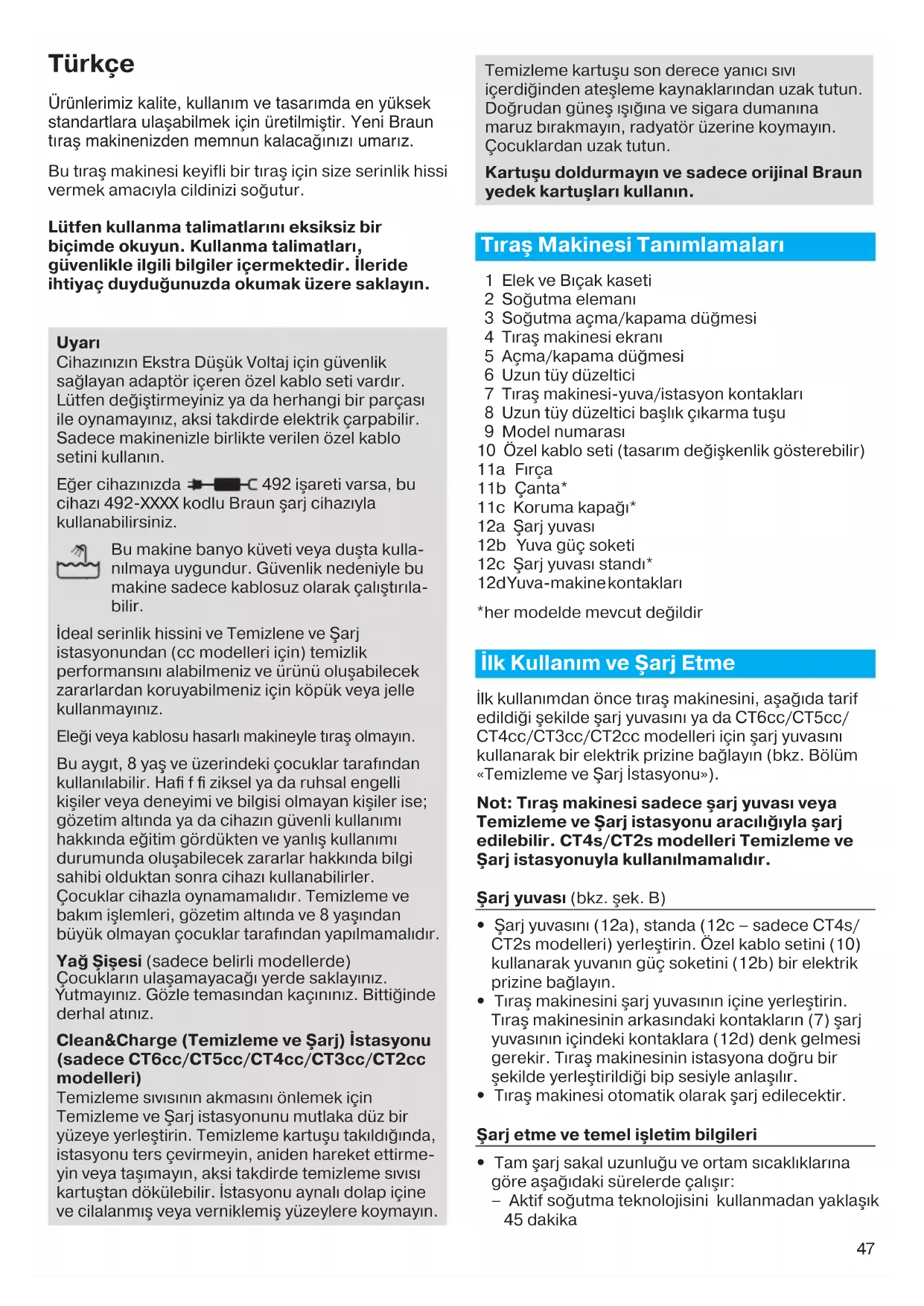 deal serinlik hissini ve Temizlene ve Şarj istasyonundan (cc modelleri için) temizlik performansını alabilmeniz ve ürünü oluşabilecek zararlardan koruyabilmeniz için köpük veya jelle kullanmayınız. Eleği veya kablosu hasarlı makineyle tıraş olmayın. Bu aygıt, 8 yaş ve üzerindeki çocuklar tarafından kullanılabilir. Hafi f fi ziksel ya da ruhsal engelli kişiler veya deneyimi ve bilgisi olmayan kişiler ise; gözetim altında ya da cihazın güvenli kullanımı hakkında eğitim gördükten ve yanlış kullanımı durumunda oluşabilecek zararlar hakkında bilgi sahibi olduktan sonra cihazı kullanabilirler. Çocuklar cihazla oynamamalıdır. Temizleme ve bakım işlemleri, gözetim altında ve 8 yaşından büyük olmayan çocuklar tarafından yapılmamalıdır. Yağ Şişesi (sadece belirli modellerde) Çocukların ulaşamayacağı yerde saklayınız. Yutmayınız. Gözle temasından kaçınınız. Bittiğinde derhal atınız. Clean&Charge (Temizleme ve Şarj) İstasyonu (sadece CT6cc/CT5cc/CT4cc/CT3cc/CT2cc modelleri) Temizleme sıvısının akmasını önlemek için Temizleme ve Şarj istasyonunu mutlaka düz bir yüzeye yerleştirin. Temizleme kartuşu takıldığında, istasyonu ters çevirmeyin, aniden hareket ettirme- yin veya taşımayın, aksi takdirde temizleme sıvısı kartuştan dökülebilir. İstasyonu aynalı dolap içine ve cilalanmış veya verniklemiş yüzeylere koymayın. Temizleme kartuşu son derece yanıcı sıvı içerdiğinden ateşleme kaynaklarından uzak tutun. Doğrudan güneş ışığına ve sigara dumanına maruz bırakmayın, radyatör üzerine koymayın. Çocuklardan uzak tutun. Kartuşu doldurmayın ve sadece orijinal Braun yedek kartuşları kullanın. Tıraş Makinesi Tanımlamaları 1 Elek ve Bıçak kaseti 2 Soğutma elemanı 3 Soğutma açma/kapama düğmesi 4 Tıraş makinesi ekranı 5 Açma/kapama düğmesi 6 Uzun tüy düzeltici 7 Tıraş makinesi-yuva/istasyon kontakları 8 Uzun tüy düzeltici başlık çıkarma tuşu 9 Model numarası 10 Özel kablo seti (tasarım değişkenlik gösterebilir) 11a Fırça 11b Çanta* 11c Koruma kapağı* 12a Şarj yuvası 12b Yuva güç soketi 12c Şarj yuvası standı* 12d Y uva-makine kontakları *her modelde mevcut değildir İlk Kullanım ve Şarj Etme İlk kullanımdan önce tıraş makinesini, aşağıda tarif edildiği şekilde şarj yuvasını ya da CT6cc/CT5cc/ CT4cc/CT3cc/CT2cc modelleri için şarj yuvasını kullanarak bir elektrik prizine bağlayın (bkz. Bölüm «Temizleme ve Şarj İstasyonu»). Not: Tıraş makinesi sadece şarj yuvası veya Temizleme ve Şarj istasyonu aracılığıyla şarj edilebilir. CT4s/CT2s modelleri Temizleme ve Şarj istasyonuyla kullanılmamalıdır. Şarj yuvası (bkz. şek. B)