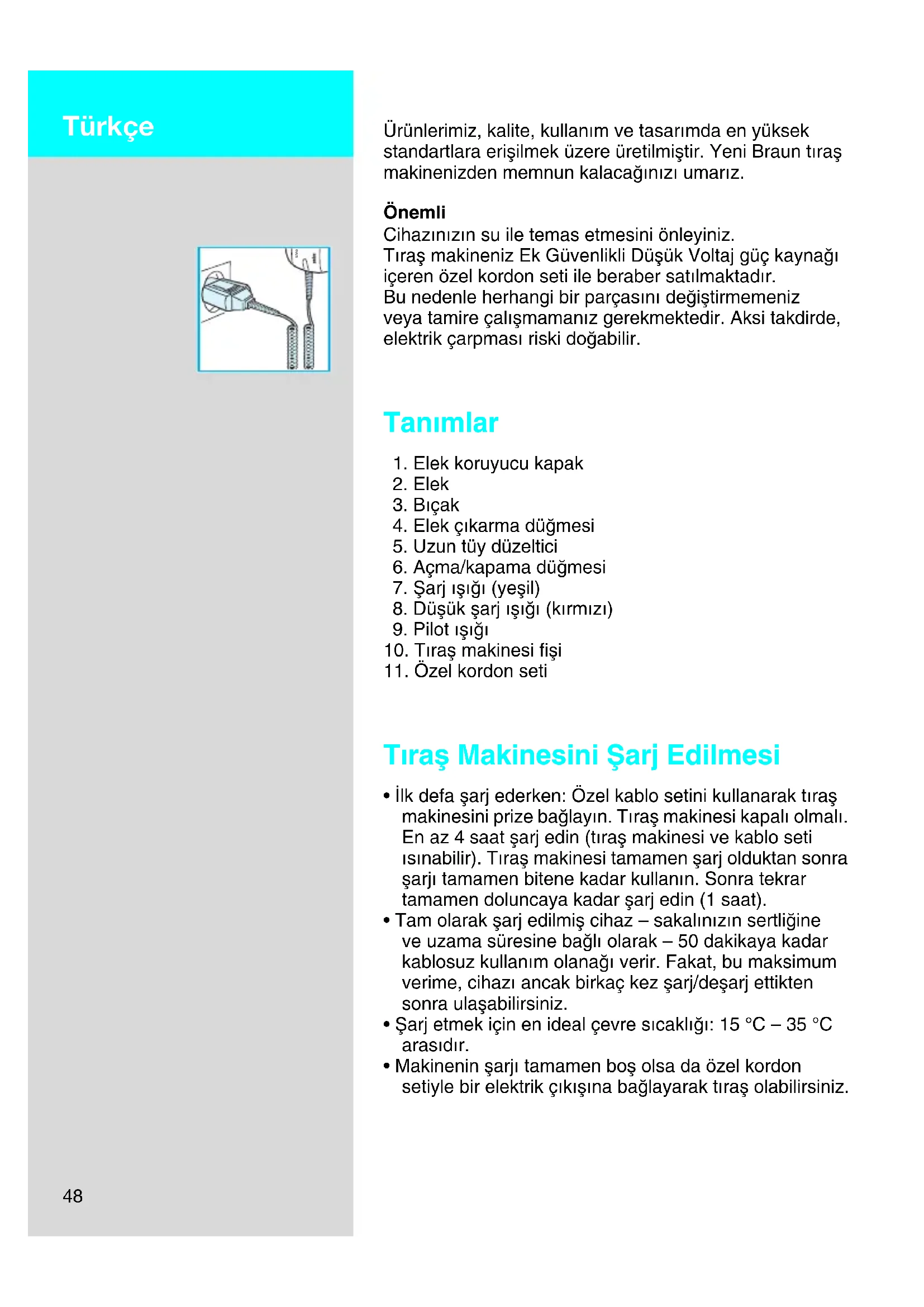5644319_Activator_8588/83_S4_66 Seite 47 Montag, 11. April 2005 11:11 1148 Ürünlerimiz, kalite, kullan∂m ve tasar∂mda en yüksek standartlara eriµilmek üzere üretilmiµtir. Yeni Braun t∂raµ makinenizden memnun kalacaπ∂n∂z∂ umar∂z. Önemli Cihazınızın su ile temas etmesini önleyiniz. Tıraµ makineniz Ek Güvenlikli Düµük Voltaj güç kaynaπı içeren özel kordon seti ile beraber satılmaktadır. Bu nedenle herhangi bir parçasını deπiµtirmemeniz veya tamire çalıµmamanız gerekmektedir. Aksi takdirde, elektrik çarpması riski doπabilir. Tan∂mlar