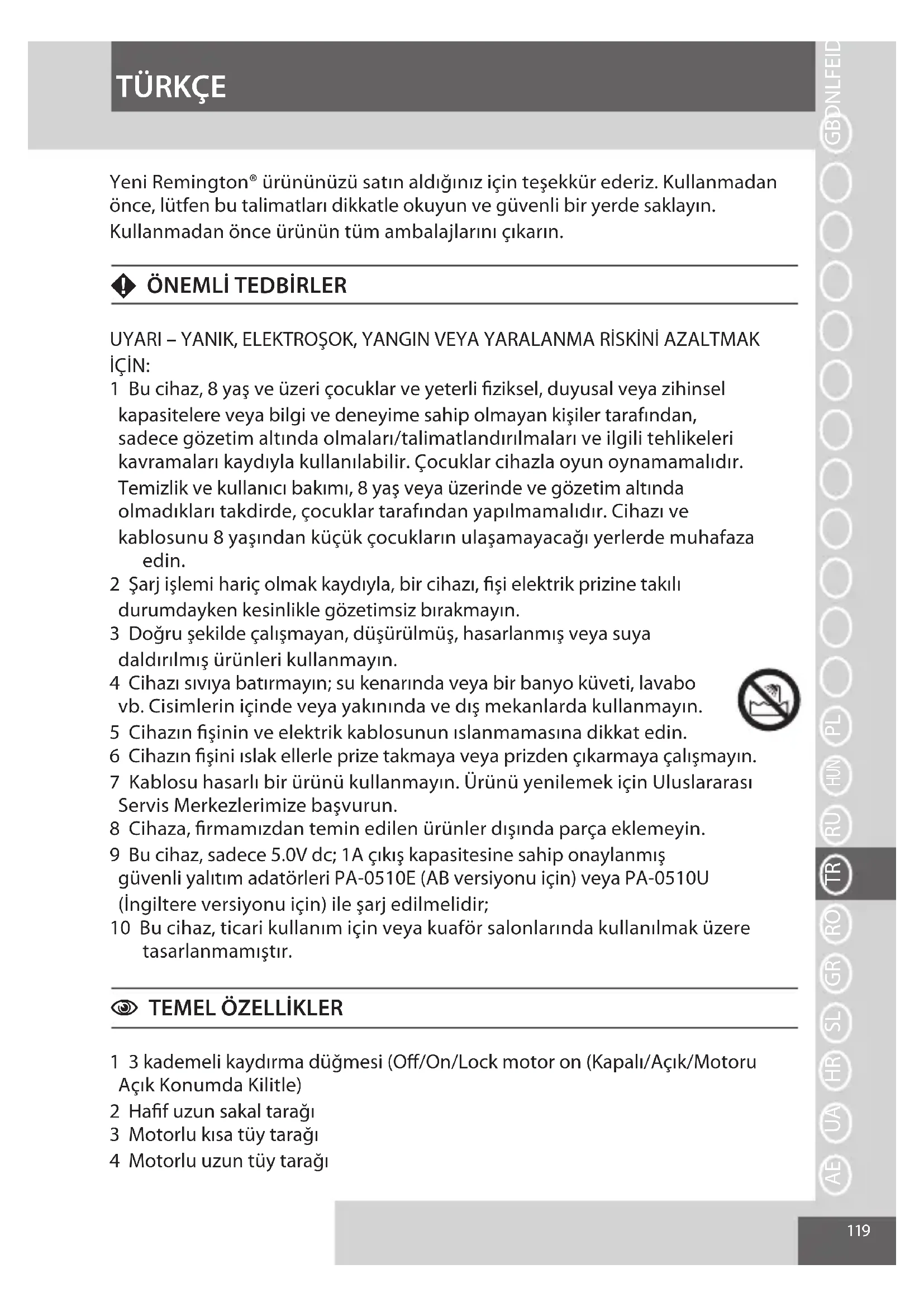 Yeni Remington® urününüz satın aldışınz icin teşekür ederiz. Kullanmadan önce, lüften bu talimatlan dikkatle okuyun ve güvenli bir yerde saklayın. Kullanmadan önce urünün:tüm ambalajlarıçınarı.