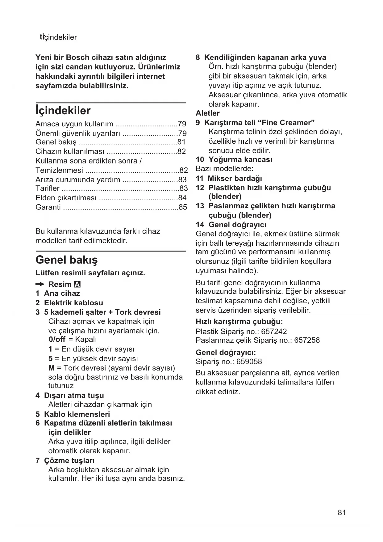 - İçindekiler Bu kullanma kılavuzunda farklı cihaz modelleri tarif edilmektedir. Genel bakış Lütfen resimli sayfaları açınız. X Resim A 1 Ana cihaz 2 Elektrik kablosu 3 5 kademeli şalter + Tork devresi Cihazı açmak ve kapatmak için ve çalışma hızını ayarlamak için. f = Kapalı 1 = En düşük devir sayısı 5 = En yüksek devir sayısı M = Tork devresi (ayami devir sayısı) sola doğru bastırınız ve basılı konumda tutunuz 4 Dışarı atma tuşu Aletleri cihazdan çıkarmak için 5 Kablo klemensleri 6 Kapatma düzenli aletlerin takılması için delikler Arka yuva itilip açılınca, ilgili delikler otomatik olarak kapanır. 7 Çözme tuşları Arka boşluktan aksesuar almak için kullanılır. Her iki tuşa aynı anda basınız. 8 Kendiliğinden kapanan arka yuva Örn. hızlı karıştırma çubuğu (blender) gibi bir aksesuarı takmak için, arka yuvayı itip açınız ve açık tutunuz. Aksesuar çıkarılınca, arka yuva otomatik olarak kapanır. Aletler 9 Karıştırma teli “Fine Creamer” Karıştırma telinin özel şeklinden dolayı, özellikle hızlı ve verimli bir karıştırma sonucu elde edilir. 10 Yoğurma kancası Bazı modellerde: 11 Mikser bardağı 12 Plastikten hızlı karıştırma çubuğu (blender) 13 Paslanmaz çelikten hızlı karıştırma çubuğu (blender) 14 Genel doğrayıcı Genel doğrayıcı ile, ekmek üstüne sürmek için ballı tereyağı hazırlanmasında cihazın tam gücünü ve performansını kullanmış olursunuz (ilgili tarifte bildirilen koşullara uyulması halinde). Bu tarifi genel doğrayıcının kullanma kılavuzunda bulabilirsiniz. Eğer bir aksesuar teslimat kapsamına dahil değilse, yetkili servis üzerinden sipariş verilebilir. Hızlı karıştırma çubuğu: Plastik Sipariş no.: 657242 Paslanmaz çelik Sipariş no.: 657258 Genel doğrayıcı: Sipariş no.: 659058 Bu aksesuar parçalarına ait, ayrıca verilen kullanma kılavuzundaki talimatlara lütfen dikkat ediniz. Yeni bir Bosch cihazı satın aldığınız için sizi candan kutluyoruz. Ürünlerimiz hakkındaki ayrıntılı bilgileri internet sayfamızda bulabilirsiniz. İçindekiler Amaca uygun kullanım p. 79