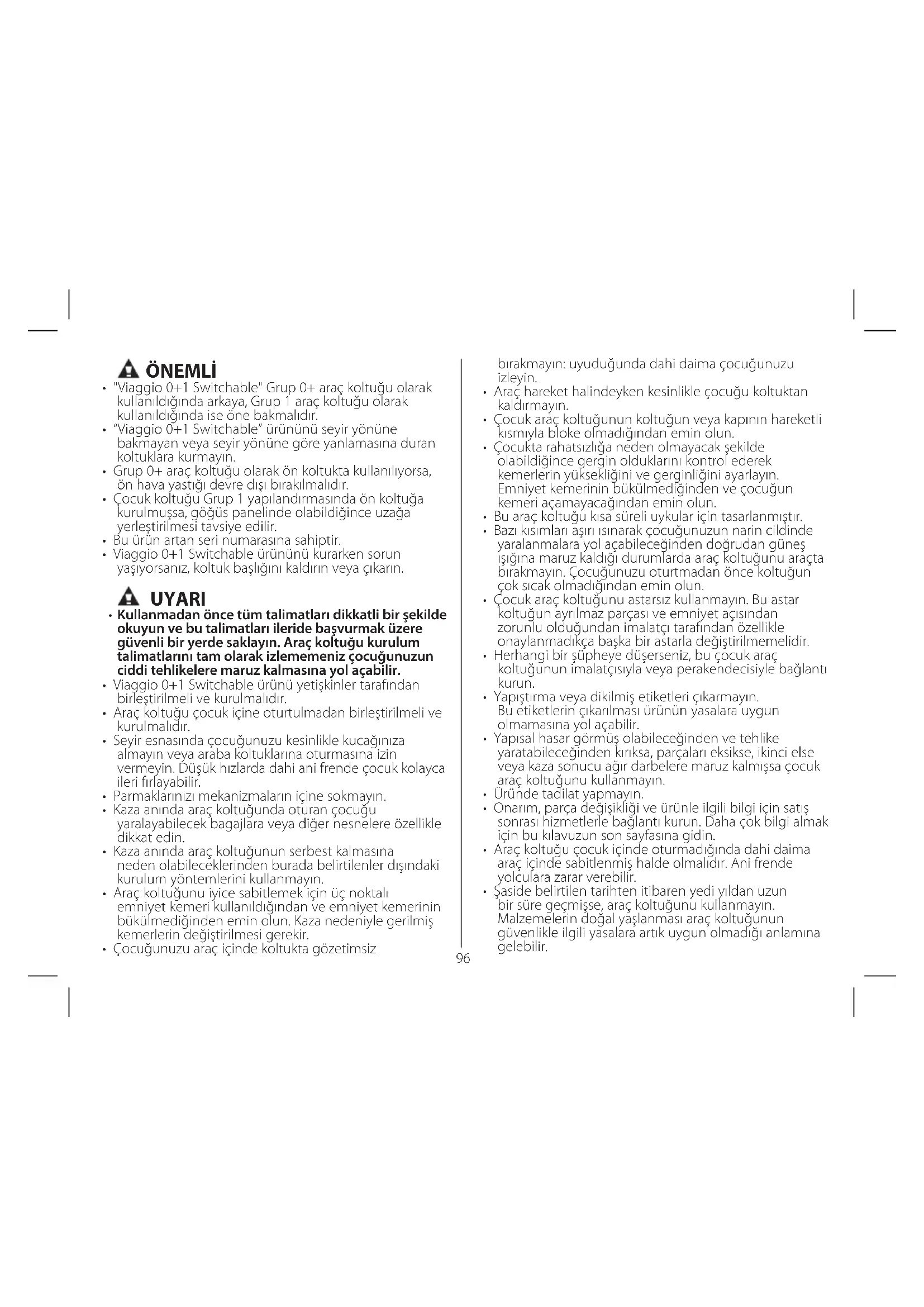 - “Viaggio 0+1 Switchable” ürününü seyir yönüne bakmayan veya seyir yönüne göre yanlamasına duran koltuklara kurmayın.